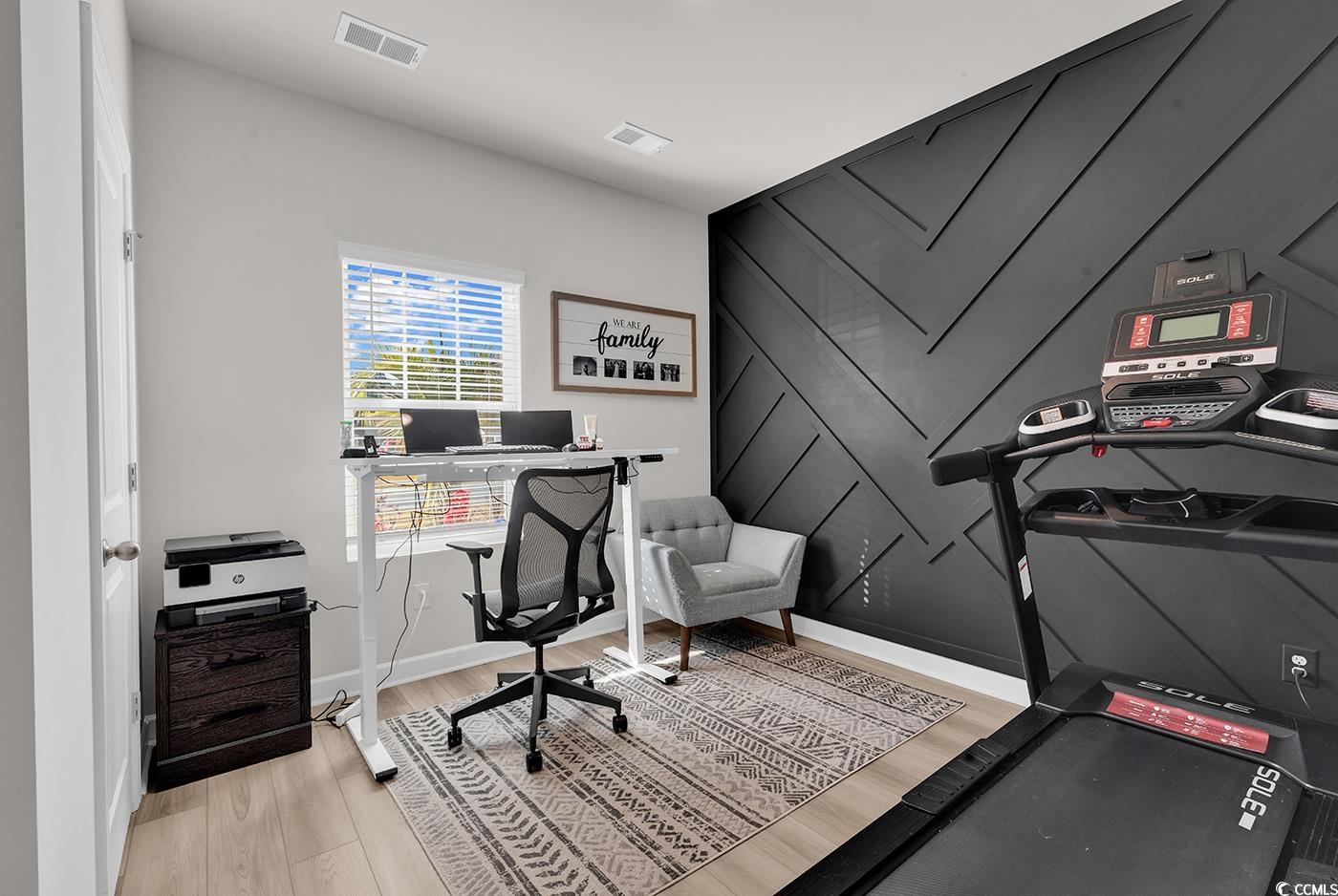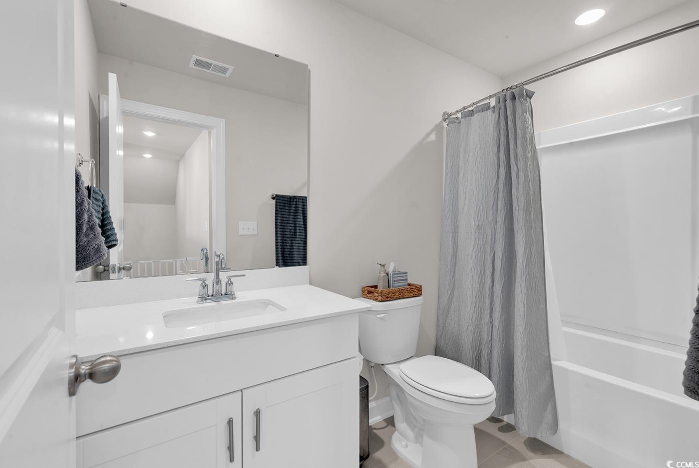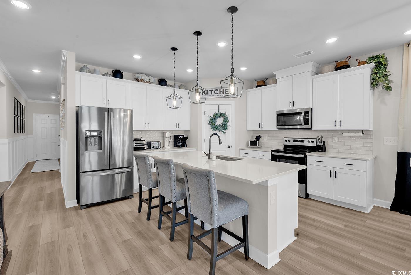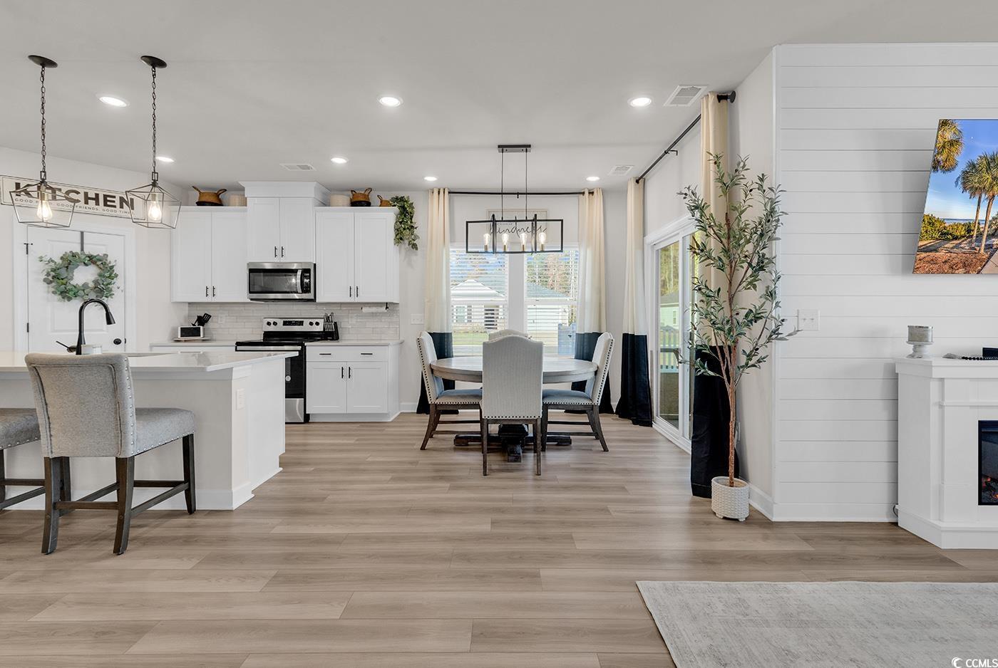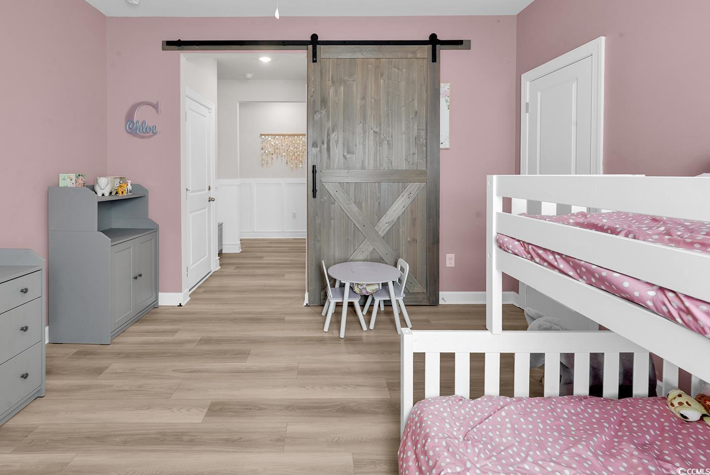 Experience refined coastal living in this beautifully upgraded five-bedroom, three-bath home in Creekside Point, Little River, South Carolina. Thoughtfully crafted for comfort, connection, and convenience, this home showcases a spacious open layout featuring quartz countertops, stainless steel appliances, upgraded cabinetry with pull-out drawers, and designer lighting. Notable upgrades include a decorative storm door, luxury vinyl plank flooring, wainscoting along the hallway, a sliding barn door in the flex room, a geometric accent wall in the office, and a custom shiplap feature wall with a professionally mounted TV in the living area. Outdoor living is equally inviting with a screened-in porch leading to an extended stamped-concrete patio, a fully fenced backyard accented by tropical palms, a relaxing hot tub beneath a canopy, and a custom wooden playground. The primary suite offers a peaceful retreat with a spa-style bath and a walk-in closet connected for everyday convenience. Upstairs, two bedrooms, a full bath, and a generous bonus room provide flexible space for guests, entertainment, or a home office. Located in Creekside Point, one of Little Rivers most desirable coastal communities, residents enjoy oversized homesites, a neighborhood pool, and proximity to the Intracoastal Waterway, North Myrtle Beach, golf, dining, and shopping. Every upgrade is completesimply move in and embrace the coastal lifestyle.