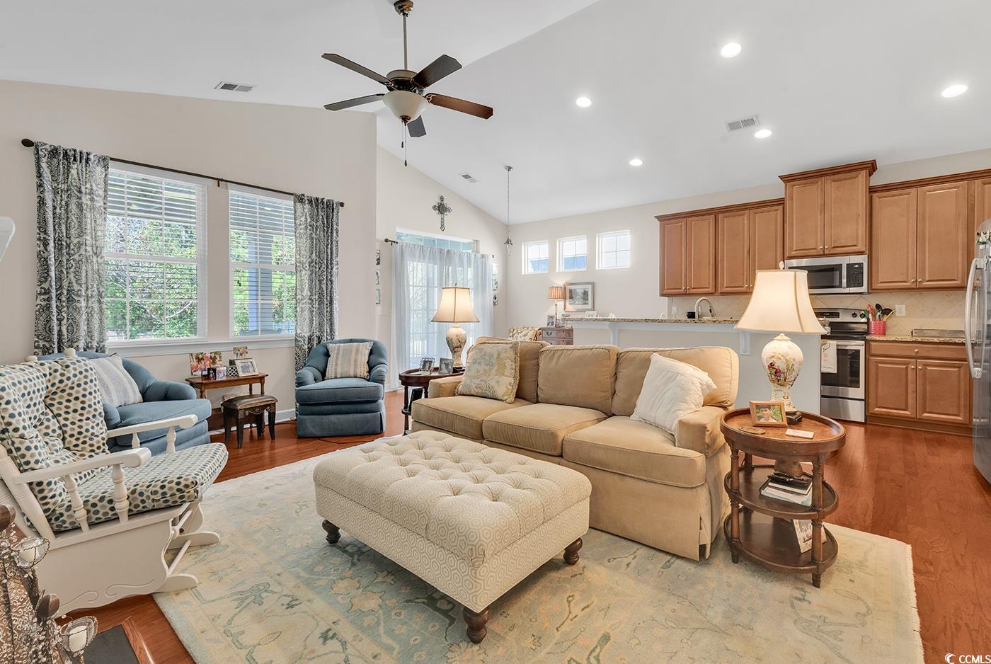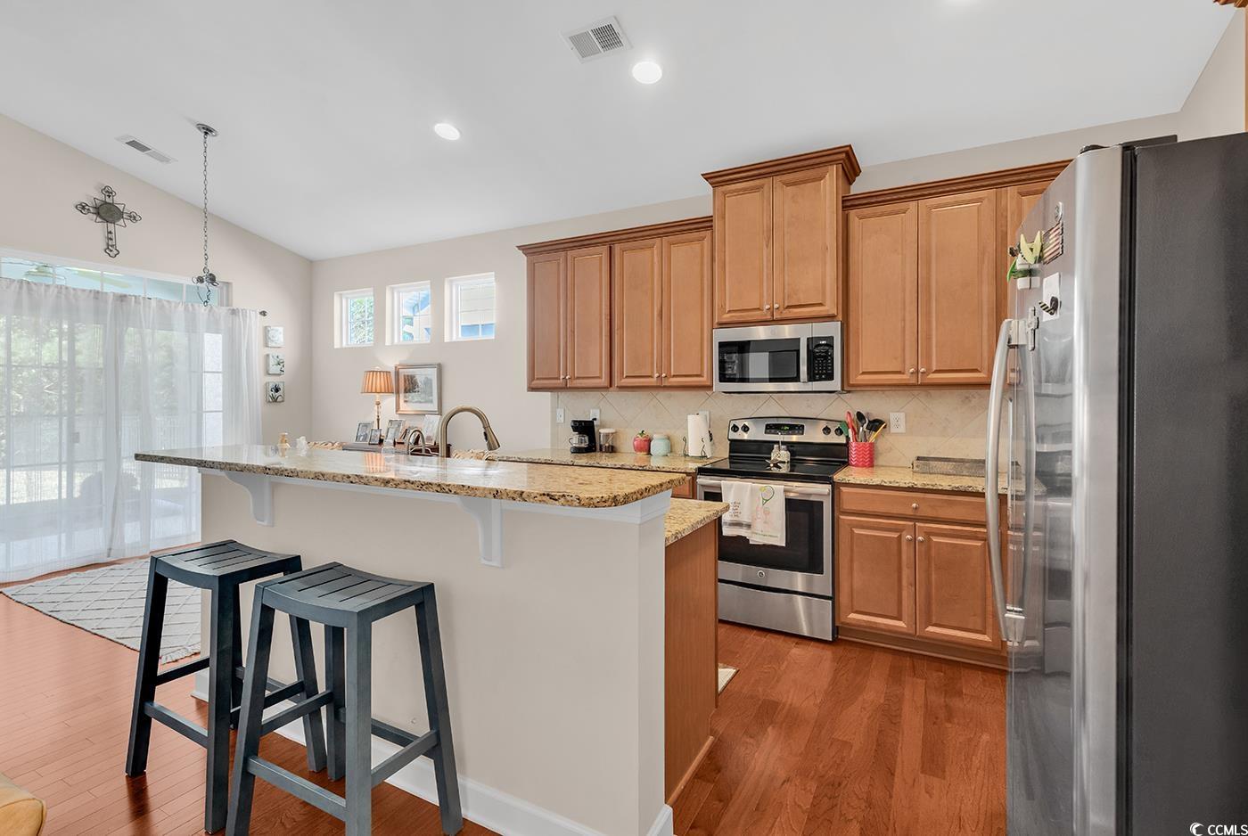 Don't miss out on this beautiful 3 bedrooms and 2 bathrooms home in one of Market Commons nicest neighborhoods: Monarch Estates at Emmens Preserve. Beautiful home with hardwood flooring, carpet, and tile. Warm fireplace scene for additional ambience and comfort during the winter months. Enjoy the spacious backyard with the natural tree line for privacy. Ride your bike, golf cart or take a walk to all of the restaurants, shopping areas, movie theater, etc that Market Commons has to offer. 10 Minute drive to the beach which is approx 3.5 Miles away. This is a must see, as this is the ONLY home available for sale in the neighborhood at this time.