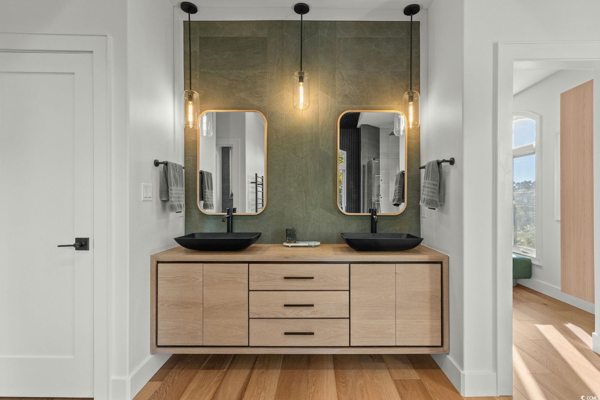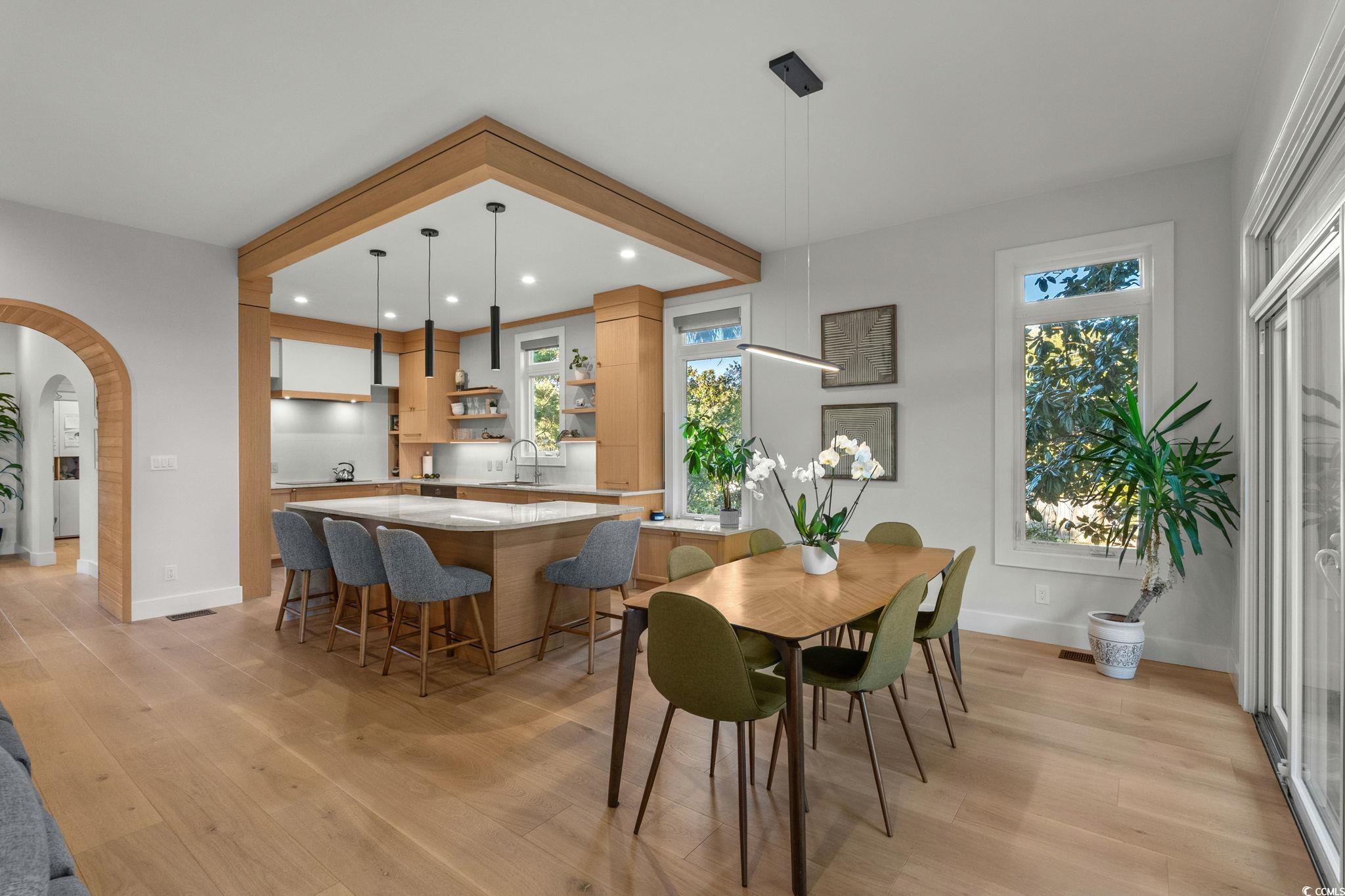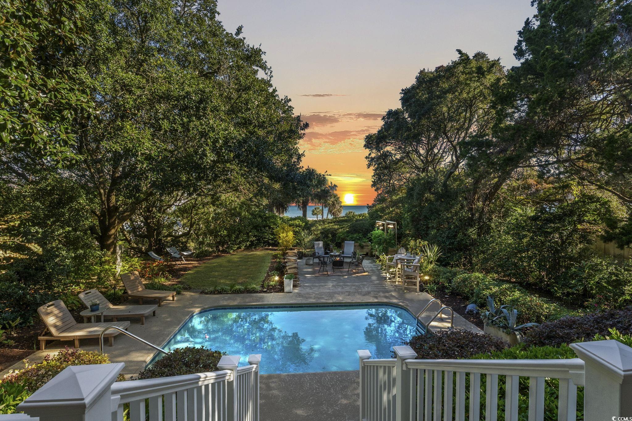 Experience refined coastal living in this private, ocean-view luxury residence located in the prestigious Avenues section of Myrtle Beachwhere elegance, privacy, and modern design converge. This 4-bedroom, 3.5-bath home impresses from the moment you arrive, with exceptional curb appeal setting the tone for the impeccable quality found throughout. Lush landscaping, Brazilian hardwood decking, cypress ceilings, and a striking glass-and-iron front door greet you outside, while wide-plank white oak engineered hardwood floors flow through light-filled living spaces inside that capture sweeping ocean views protected by setbacks to ensure they remain unobstructed even if the lot behind is developed. The gourmet kitchen is a showcase of craftsmanship, featuring Taj Mahal quartzite waterfall countertops, custom cabinetry with rift white oak fronts, solid cherry dovetail drawers, brass hardware, a built-in JennAir refrigerator, reduction cooktop, two-drawer Fisher & Paykel dishwasher, pullout pantry, and a hidden microwave nook. The primary suite offers a serene retreat with a spa-inspired bath that includes a soaking tub, double-sink vanity, and a beautifully tiled walk-in shower. Every detail throughout the home reflects careful design and superior finishes. An elevator provides easy access to all levels, while the conditioned and insulated three-car garagewith an EV charger, painted floor, and workshop spaceadds both comfort and functionality, as do the roof's solar panels. Two expansive rear porches overlook a private backyard paradise with an in-ground pool, built-in outdoor kitchen, and panoramic ocean views framed by lush greenery. This rare offering combines modern luxury, thoughtful craftsmanship, and coastal serenity in one of Myrtle Beachs most desirable neighborhoods with no HOA dues.