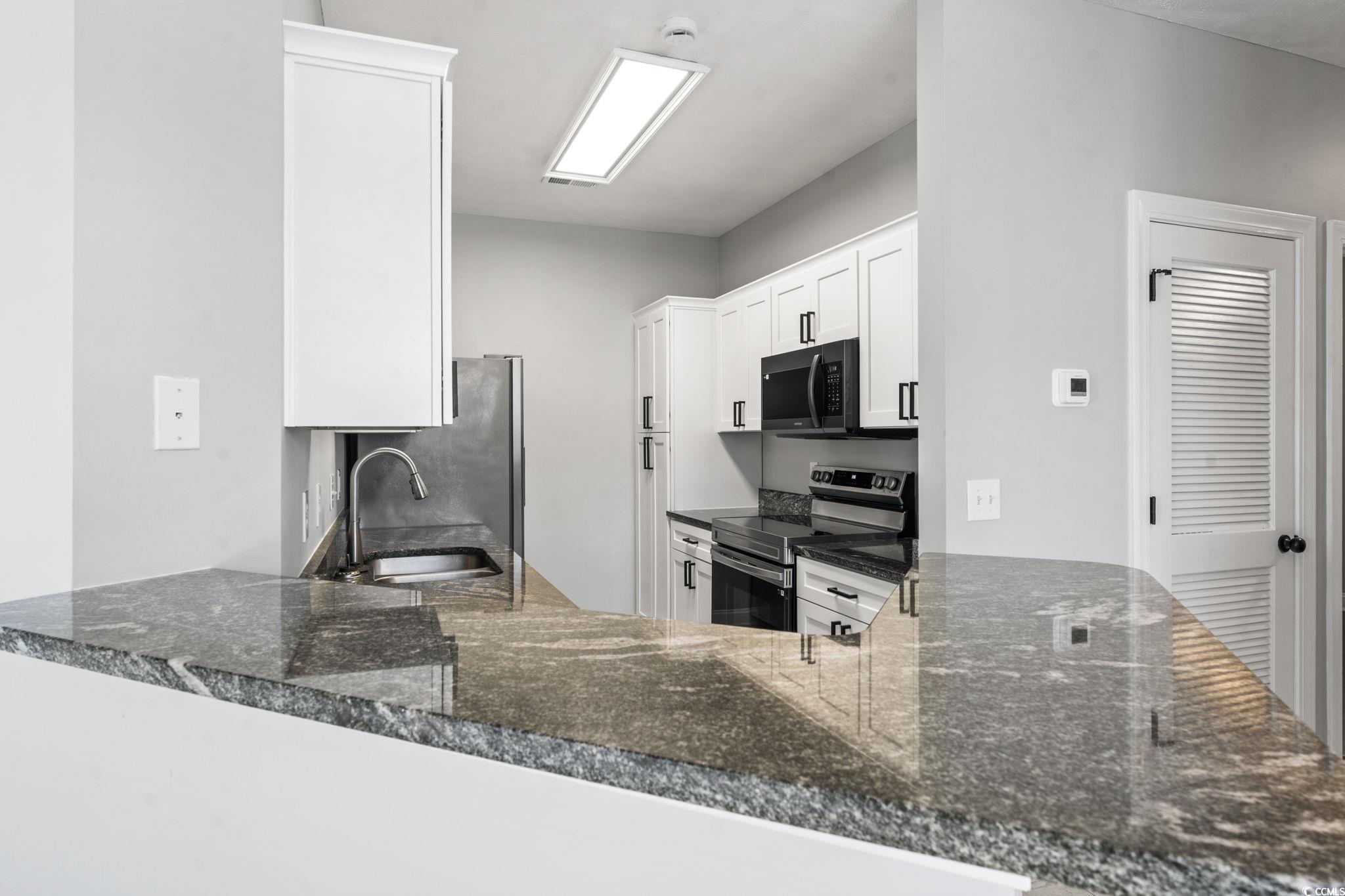Your new home or investment property awaits! Welcome to this beautifully upgraded 3-bedroom, 2-bathroom condo in Fountain Point! This turn key unit features stunning pond views and upgrades around every corner, and offers abundant natural light through additional windows and vaulted ceilings. The entire home has been freshly painted and showcases all-new finishes and fixtures. The kitchen boasts brand new, soft-closing white shaker cabinets, elegant granite counters, new appliances, and all black hardware, enhancing its modern appeal. The screened in porch off the living room allows you to enjoy quiet mornings and calm evenings with great pond views year round! The primary bedroom has huge windows with similar views, which also provide great natrual lighting. A brand new washer and dryer provide added convenience as well! Rejuvenated with a new hot water heater, HVAC system, smoke detectors, mirrors, toilets, vanity lighting, and contemporary light fixtures and ceiling fans throughout - designed so you don't have to lift a finger. All door hardware and hinges are upgraded black for a sleek look as well. There is also a storage closet outside the unit for additional storage. This community allows long term rentals, so whether you are looking for a primary, secondary, or your next investment, you truly can't go wrong. Only 15 minutes from the beach, airport, and close to shops and dining, this community truly is convenient to wherever you may need to be! Schedule your showing today!