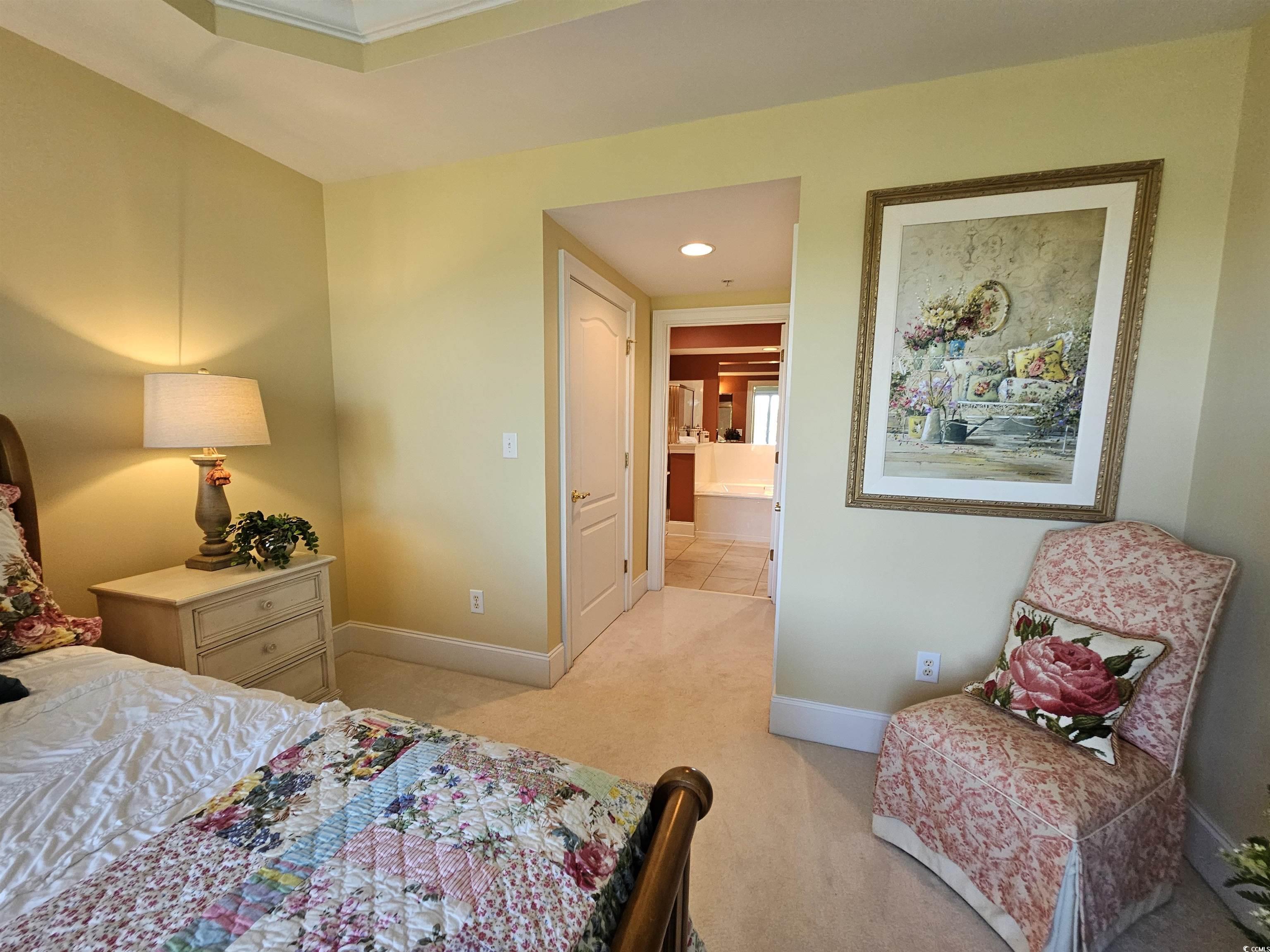 Wow is what you will say when you enter this beautiful residence! This three-bedroom, two-bath home features over 1,600 square feet and is situated on the top floor, boasting vaulted ceilings and an open floor plan, making it an ideal space for entertaining. Step out onto the screened porch and enjoy the 10th green of the Greg Norman golf course. Inside, you will find a gourmet kitchen with custom cabinets and solid surface countertops. The large primary suite features a sitting area and a walk-in closet, while the bathroom boasts double sinks, a whirlpool tub, and a walk-in shower. This condo has two primary suites. Additional storage is attached, including a garage and a sitting area in the lobby; nothing has been overlooked! Partially furnished. Located in the gated community of Edgewater inside the Barefoot Resort, amenities include a clubhouse, an Olympic-size pool on the waterway, a boat dock, a hot tub, a fitness center, a waterway walking trail, beach cabanas on Ocean Boulevard, outdoor grilling, and the list goes on.