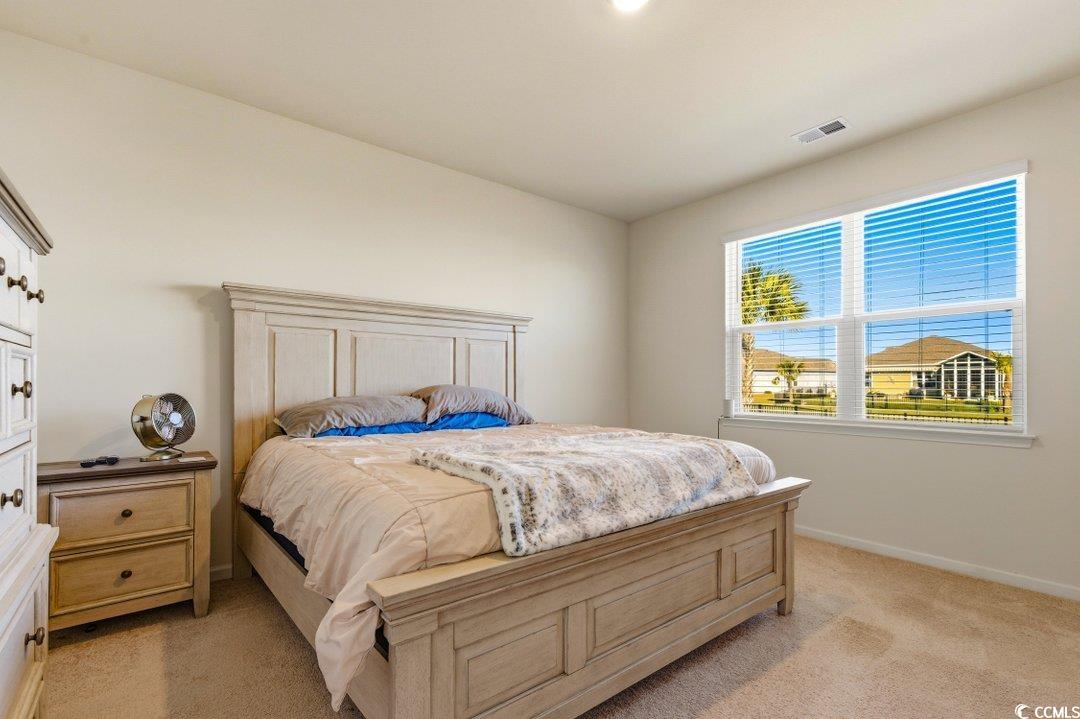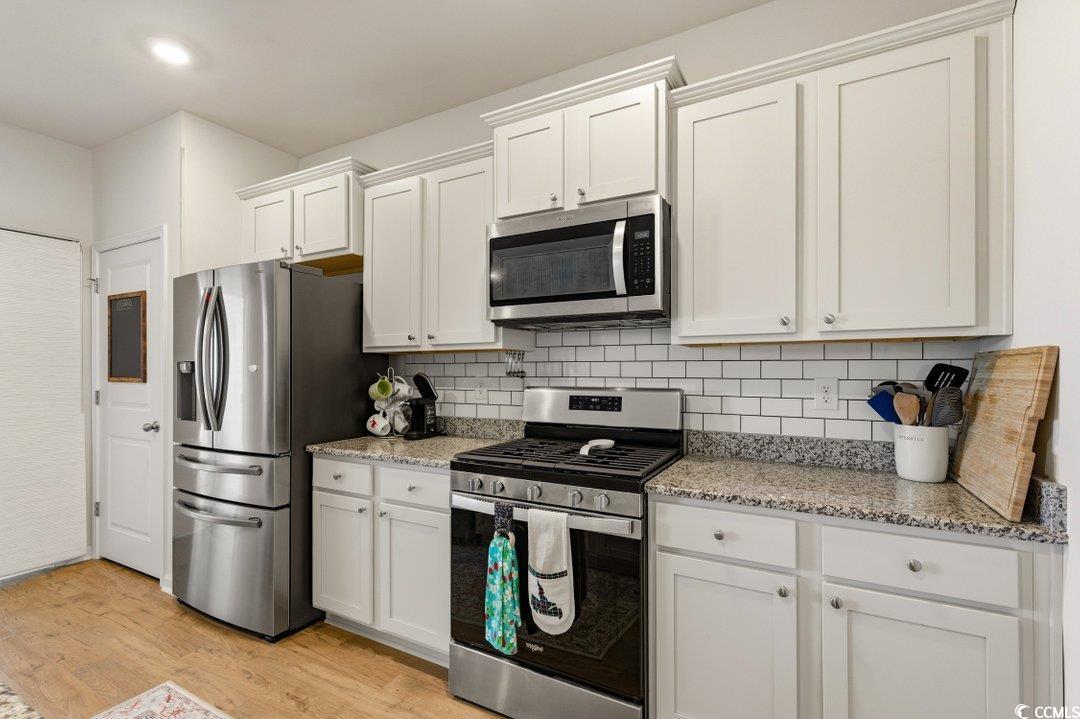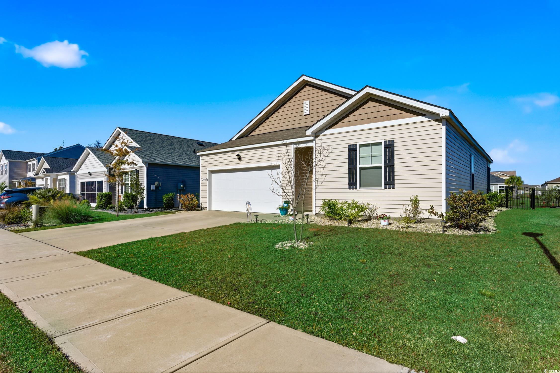 Welcome to this stunning one-level home in the Summit at Meridian at Market Common community offering open-concept living at its finest. Featuring 3 spacious bedrooms, 2 full baths, and approximately 1,475 sq ft of thoughtfully appointed living space. Highlights include 9-foot ceilings, a large kitchen island with breakfast bar, off-white painted cabinetry, natural gas range and granite countertops. The private primary suite boasts a generous walk-in closet as well as dual vanity. Relax outdoors on your screened rear porch overlooking a scenic water view. Additional perks: low-maintenance laminate wood flooring throughout main living areas, tankless gas water heater, two-car garage with opener, fencing and irrigation. Located just minutes from shopping, dining, beach access and the vibrant Market Common area. This home seamlessly blends lifestyle, comfort and convenience!