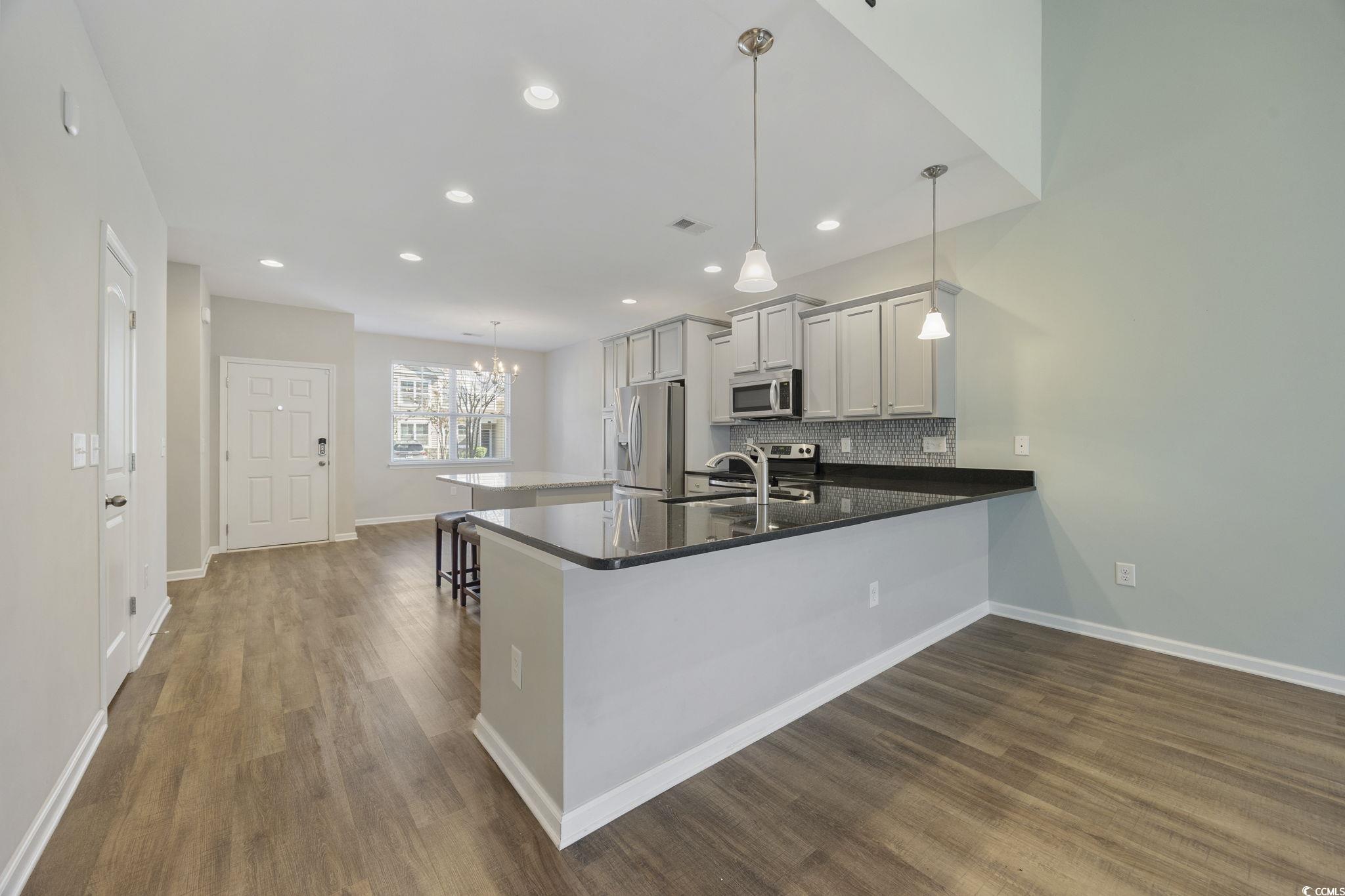 Welcome to 115 Machrie Loop Unit D, a spacious end-unit townhome in the Berwick at Windsor Plantation. This property offers 3 bedrooms, 2.5 bathrooms, a 2-car garage, and a layout designed for practical, comfortable living. The first floor centers around an open living and dining area with durable LVP flooring and plenty of natural light. The kitchen has a clean, functional setup with stainless steel appliances, an island for extra prep space, and a clear view of the main living area. The primary bedroom is also on the first floor and includes two custom closets and a large private bathroom with double sinks, a soaking tub, and a separate shower. Upstairs provides two additional bedrooms, a full bathroom, and a loft that can be used as an office, playroom, or second living space. Out back, youll find a screened porch and a nicely finished patio area with pavers and an extended deck great for relaxing or hosting friends. The home also includes a first-floor laundry room and a garage with built-in storage. Also a bonus the HOA fee includes Water/Sewer, Trash pick up, Cable/internet, Building insurance, Landscaping and Pool maintenance! The location puts you close to The Market Common, the beach, CCU, and everyday conveniences like Target, Starbucks, and Trader Joes. Some photos have been virtually staged.