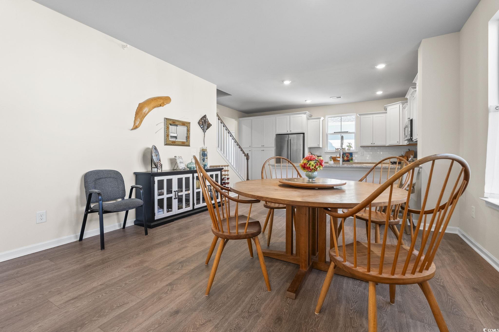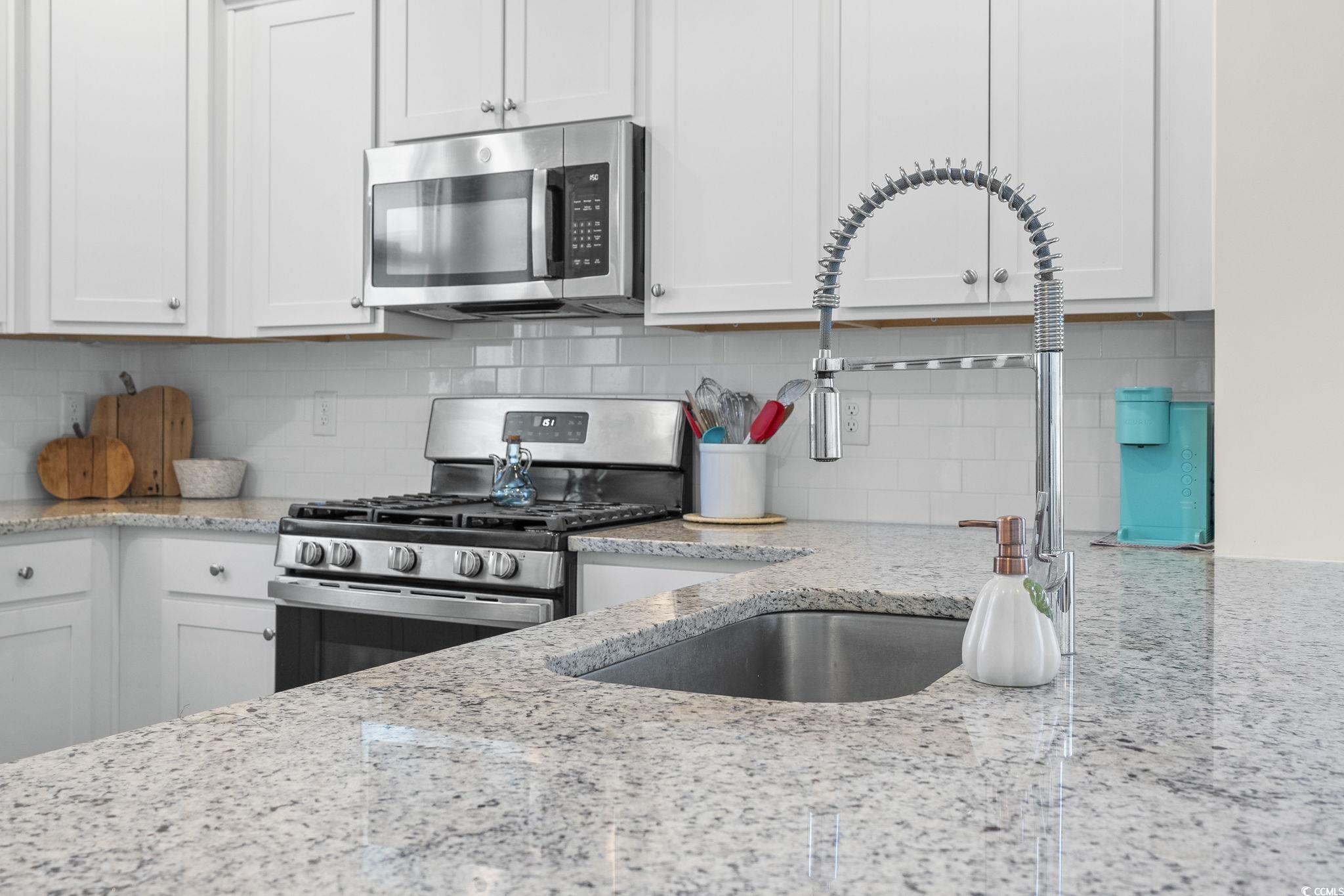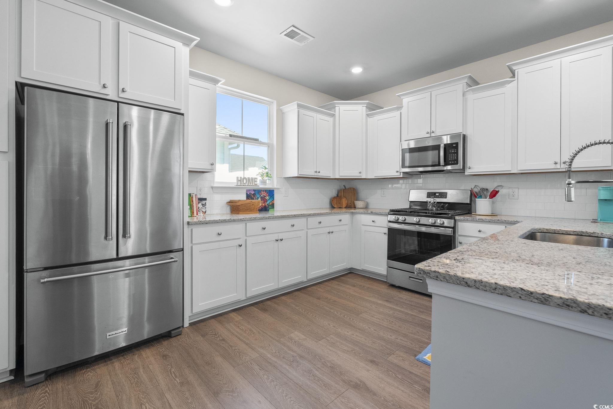 The Augusta - Rare End Unit Available in The Preserve at Pine Lakes: This beautiful townhome includes a two-car garage with extended driveway providing ample parking. Enjoy added greenspace, a private backyard tree line, and abundant natural light. The private gated courtyard offers an inviting space to relax, grill, or entertain. Full-time or part-time residents can appreciate professional landscaping and irrigation services that enhance curb appeal. The first-floor living area features premium laminate flooring throughout with tile flooring in all wet areas. The upgraded kitchen is adorned with light colored granite countertops, tons of counter space and storage, tile backsplash, GE stainless steel appliance package, and a large sink in the work peninsula. A gas range and tankless water heater are included in this natural gas community. The primary en-suite on the first floor offers a walk-in closet, a tiled walk-in shower, granite countertops, double sinks and large linen closet. Feel secure with the Ring Camera and Smart Home technology to open and close the garage door and control the thermostat's temperature. Upstairs includes two additional spacious bedrooms, a full bath, and bonus room. Community amenities include a pool with cabana, pickleball court, playground, and picnic area with grills. Located near Pine Lakes Country Club, known as The Granddaddy, plus a short fun golf cart ride to the beach. Conveniently positioned in the heart of Myrtle Beach near shopping, dining, the airport, and scenic greenways for walking or biking. Square footage is approximate and not guaranteed. Buyer is responsible for verification.