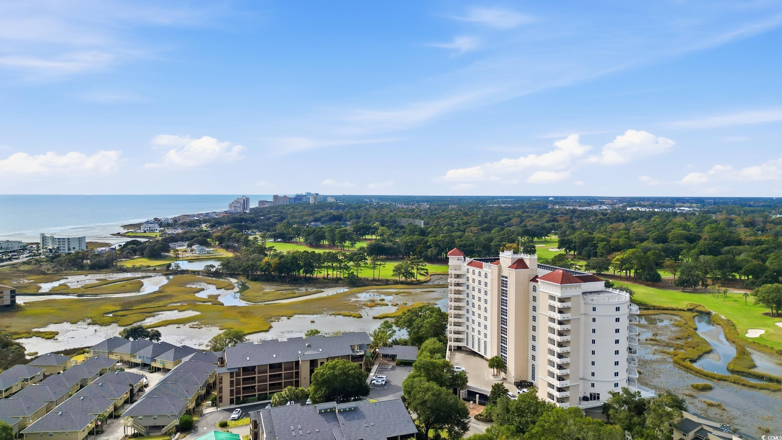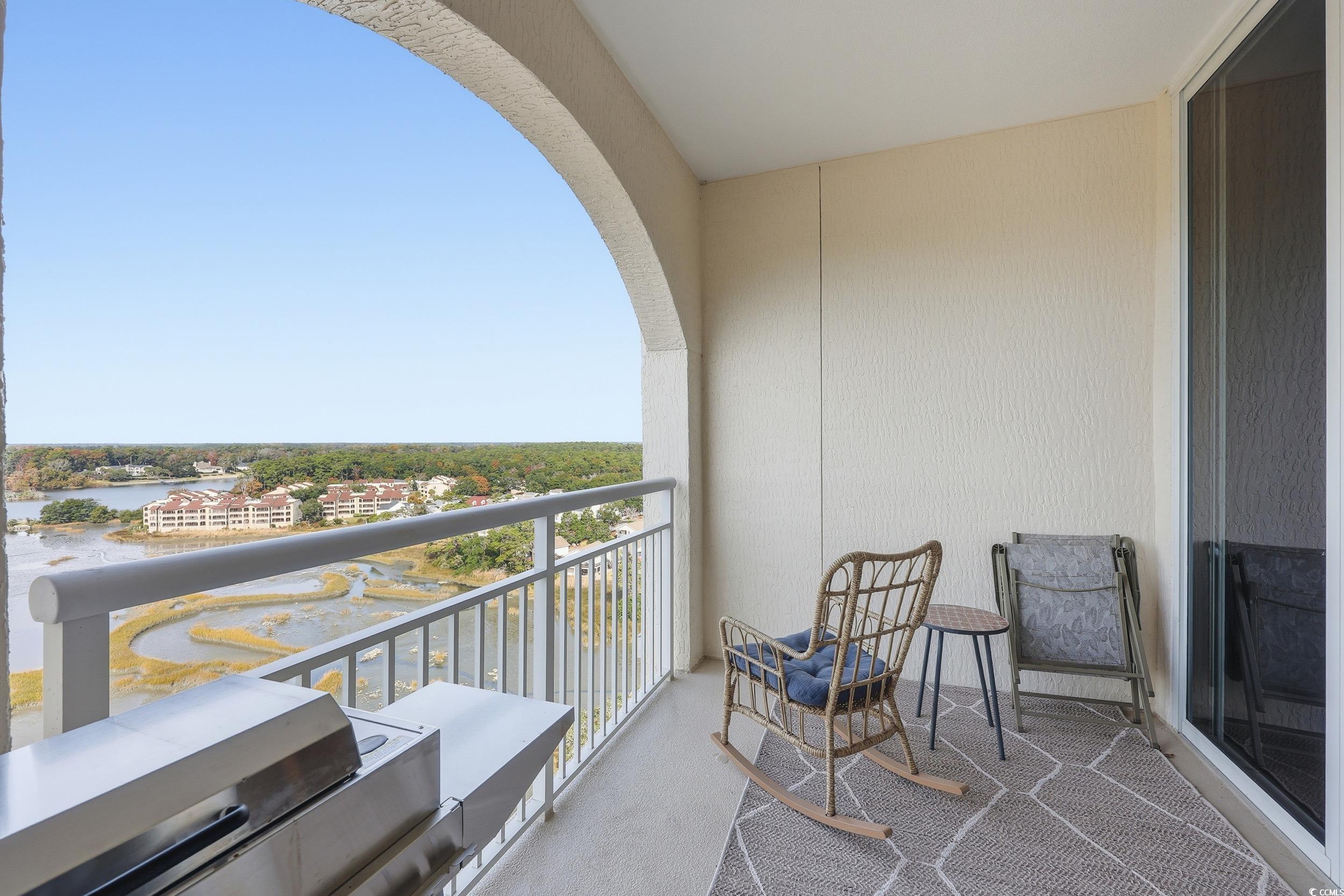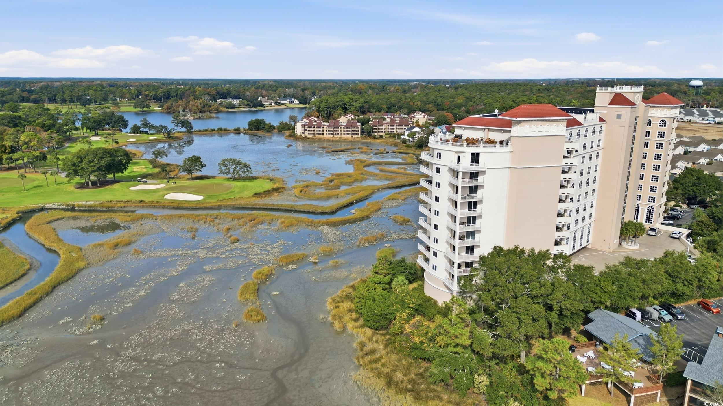 Experience coastal luxury from this beautifully furnished penthouse residence at The Pointe, offering unmatched panoramic views of the marsh, Dunes Lake, and the prestigious Dunes Golf Course. The Pointe is a secure, gated luxury high-rise offering 24-hour lobby access, private parking, individual storage rooms, an indoor pool, fitness center, and an elegant owners lounge with full kitchen and billiards. Long-term rental restrictions ensure a quiet, residential feel. This 3BR/3.5BA condo features an open, spacious layout with two waterfront ensuite bedrooms, each with private balconies overlooking the water, plus a generous third guest suite. The updated gourmet kitchen is equipped with Viking professional appliances, including a 6-burner gas range, oversized refrigerator/freezer, wine cooler, and custom range hood, perfect for those who love to cook or entertain. High-end furnishings, designer lighting, and quality finishes create an inviting, upscale atmosphere throughout. A standout feature is the private rooftop terrace, boasting sweeping views of the ocean, marsh, and golf course, ideal for sunsets, relaxing, or stargazing. All of this is just a short walk to the beach and minutes from everything Myrtle Beach and North Myrtle Beach have to offer.