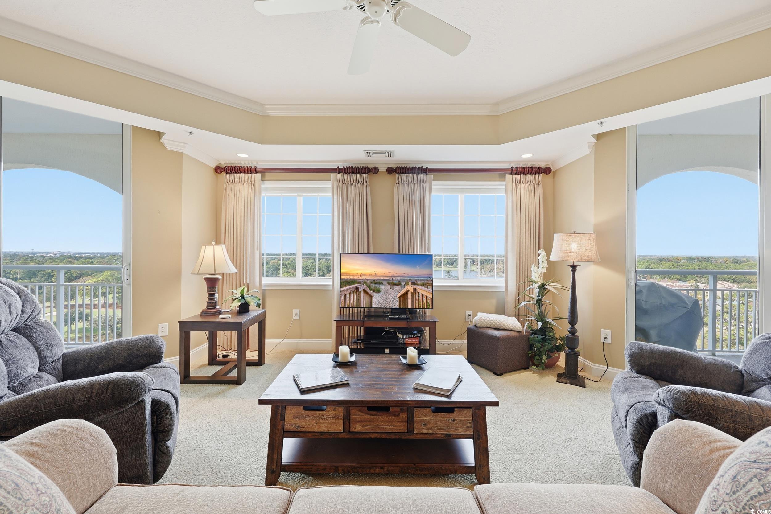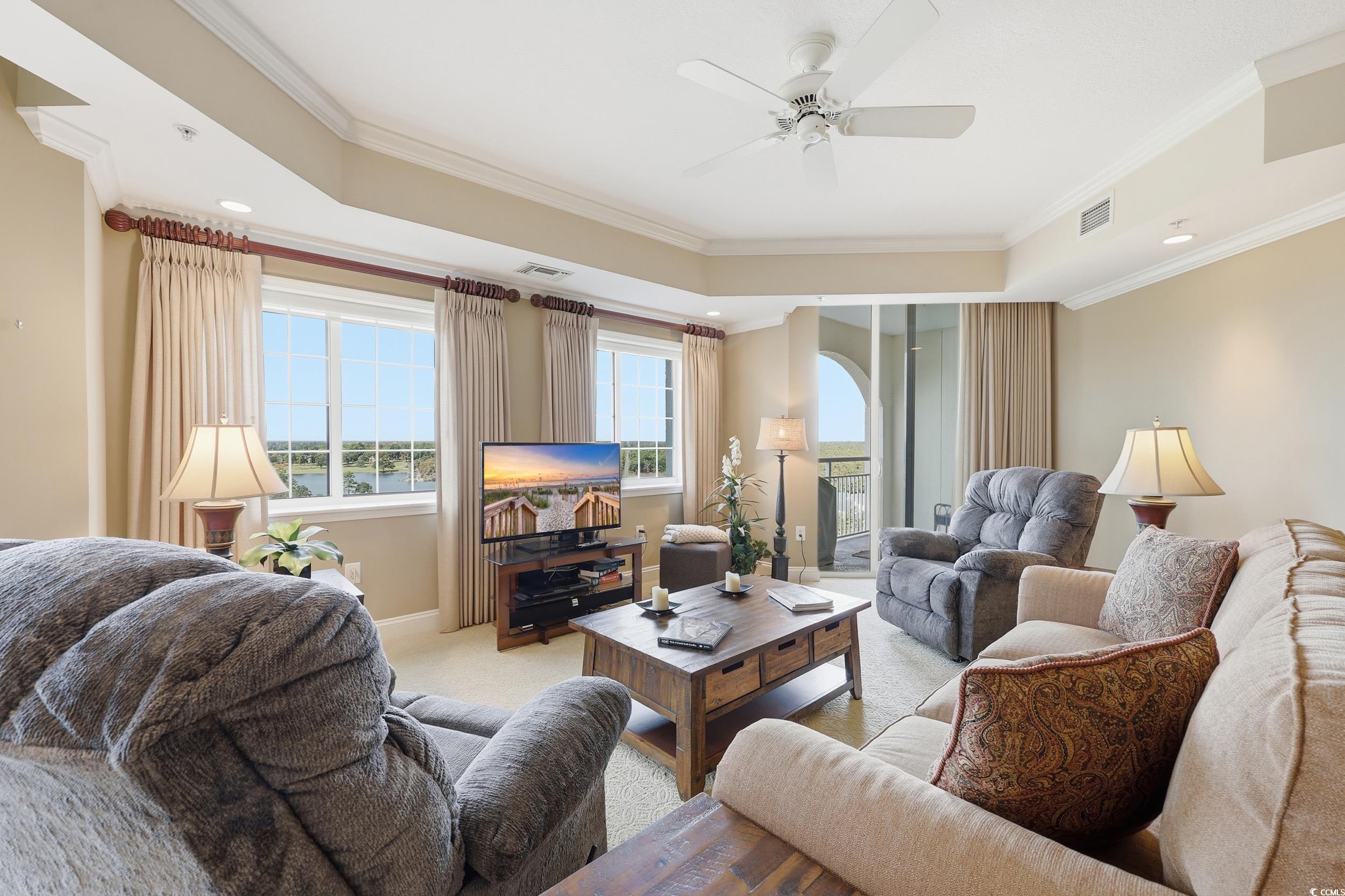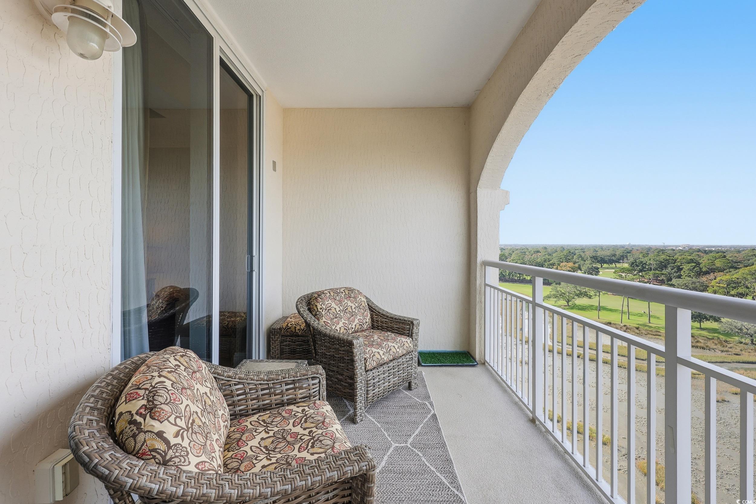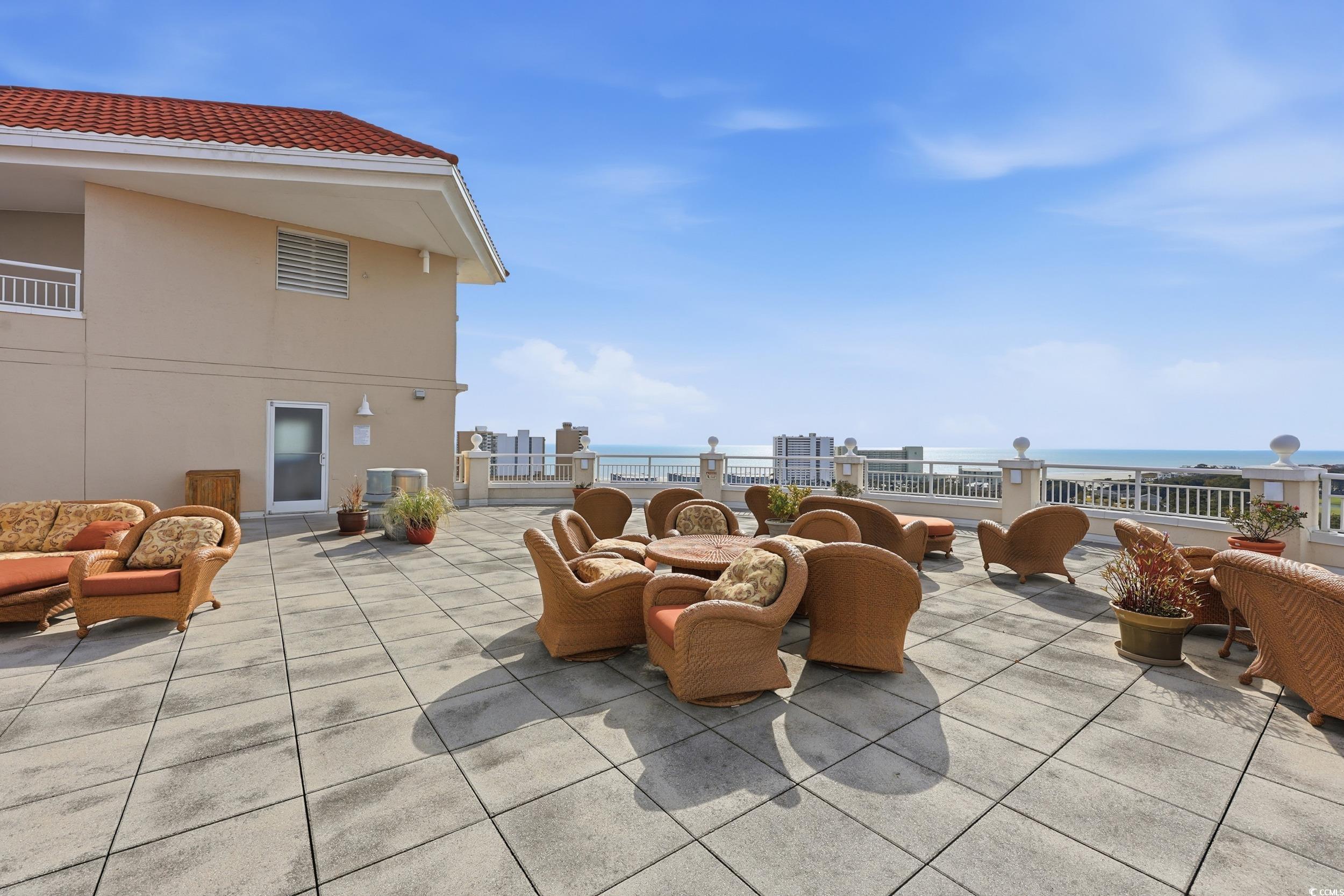 Experience coastal luxury from this beautifully furnished penthouse residence at The Pointe, offering unmatched panoramic views of the marsh, Dunes Lake, and the prestigious Dunes Golf Course. The Pointe is a secure, gated luxury high-rise offering 24-hour lobby access, private parking, individual storage rooms, an indoor pool, fitness center, and an elegant owners lounge with full kitchen and billiards. Long-term rental restrictions ensure a quiet, residential feel. This 3BR/3.5BA condo features an open, spacious layout with two waterfront ensuite bedrooms, each with private balconies overlooking the water, plus a generous third guest suite. The updated gourmet kitchen is equipped with Viking professional appliances, including a 6-burner gas range, oversized refrigerator/freezer, wine cooler, and custom range hood, perfect for those who love to cook or entertain. High-end furnishings, designer lighting, and quality finishes create an inviting, upscale atmosphere throughout. A standout feature is the private rooftop terrace, boasting sweeping views of the ocean, marsh, and golf course, ideal for sunsets, relaxing, or stargazing. All of this is just a short walk to the beach and minutes from everything Myrtle Beach and North Myrtle Beach have to offer.