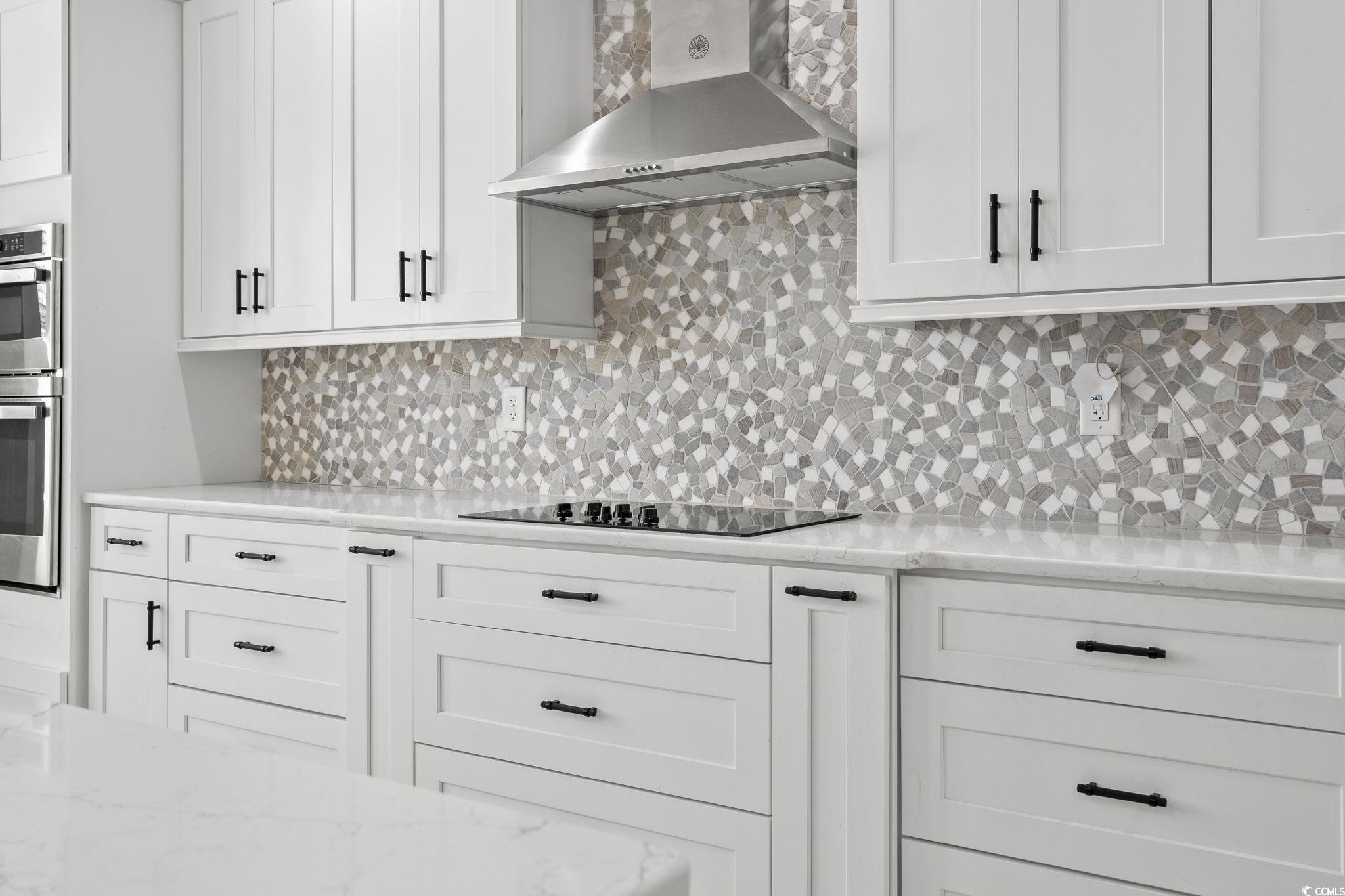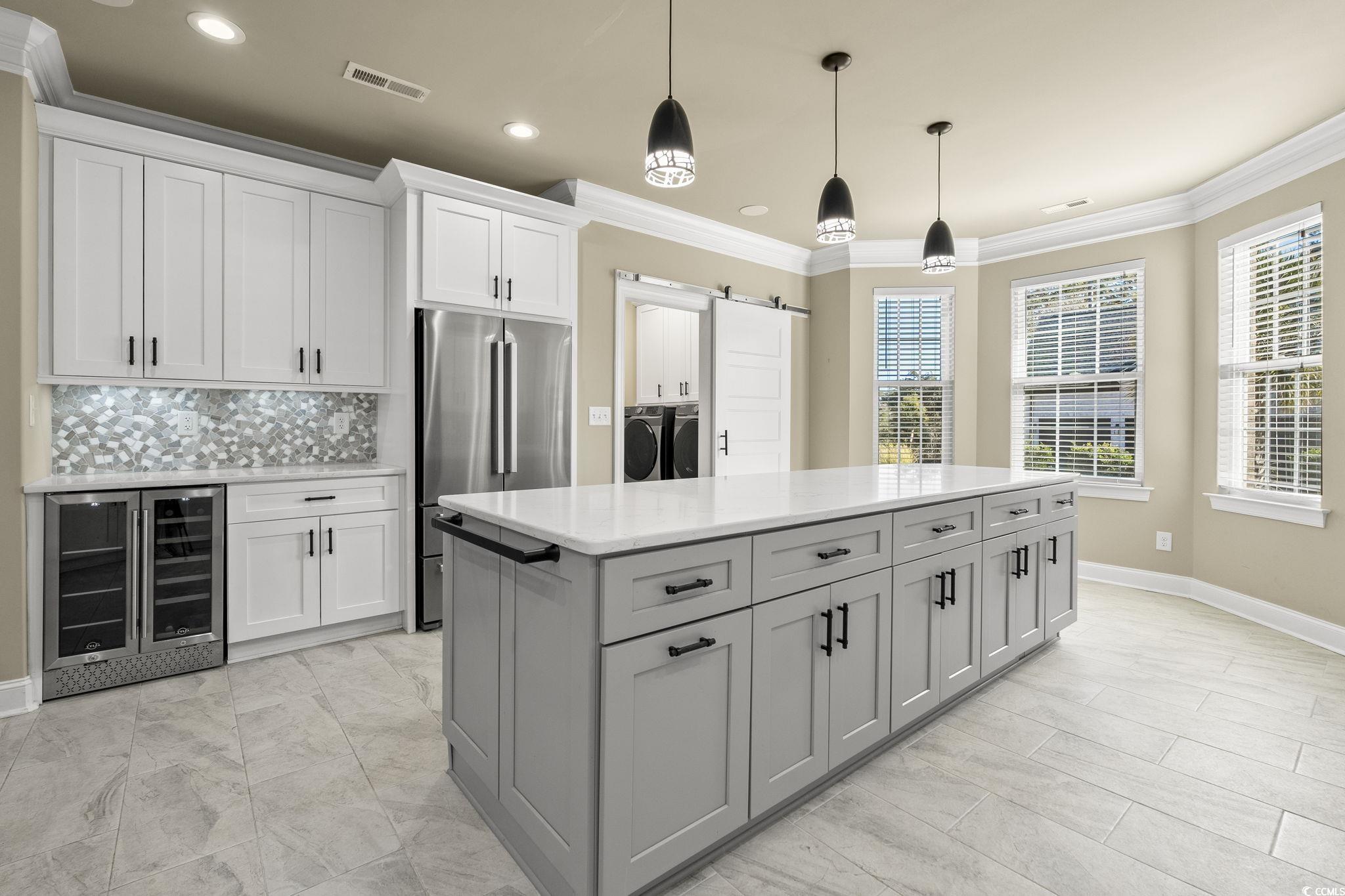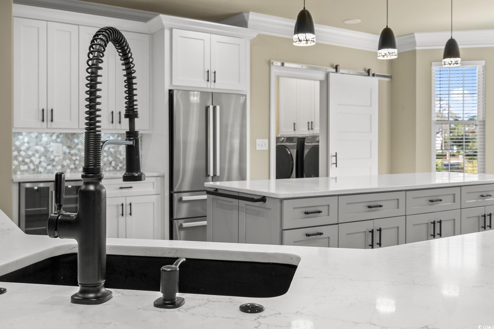 This sprawling custom 4-bedroom, 3.5-bath home blends comfort, luxury, and exceptional spaces for entertaining-all on one convenient level. The heart of the home is an expansive kitchen featuring a wall oven, oversized island, peninsula, beverage fridge, and abundant cabinetry, making it one of the largest and most functional kitchens you'll find. The open, airy floor plan offers effortless flow, ideal for modern living. With two master suites-each with a tile walk-in shower and the primary featuring his-and-her closets-privacy and comfort are elevated throughout. Tray lighting throughout the main living area, formal dining room space. Too many upgrades to mention, schedule an apt to see today. The oversized garage offers full size walk-up stairs to a climate-controlled (portable unit conveys) space above the garage. Outside, the fenced backyard provides wonderful privacy with a natural, park-like setting and plenty of room to add a pool to create your own personal oasis complete with a putting green to work on your short game. Enjoy community amenities including a clubhouse, grand outdoor patio, as well as a large zero-entry pool for leisure and relaxation. For boating enthusiasts, Creek Harbour low HOA dues include dry boat storage and access to a day dock on Collins Creek, offering a direct route to the Intracoastal Waterway. From there, you can reach the historic waterfronts of Georgetown or Conway in about 30 minutes for lunch or a scenic afternoon on the water. In addition to the oversized attached garage, a detached garage offers endless possibilities, extra storage, workshop, gym, she-shed, man-cave, or anything you imagine. This detached space also includes a bathroom, its own low-boy water heater, and a fantastic covered outdoor kitchen area with storage and seating, perfect for watching the game and enjoying true Lowcountry living.