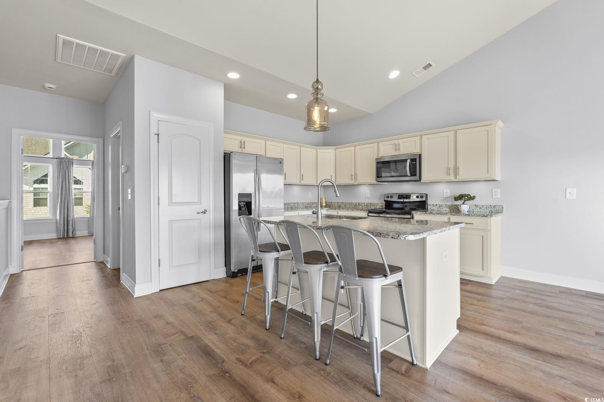 Beautifully updated townhouse-style condo in one of Myrtle Beachs most sought-after areasjust 4 miles from the ocean! This inviting townhome features a modern open-concept layout, a spacious owners suite, granite countertops in the kitchen and bathrooms, and stainless steel appliances. Enjoy low-maintenance, carpet-free living with luxury plank flooring installed in 2024. Additional upgrades include a new large-capacity washer and dryer, a stainless-drum dishwasher (2025), and a whole-house water filtration and purification system with ionic conditioner (2024). Relax outdoors on the generous private upper-level deck or the welcoming ground-level patio. The low monthly fee covers exterior maintenance, high-speed internet, professional pest control, and so much more. Whether youre seeking a full-time residence, a vacation escape, or an investment property, this townhouse offers the perfect Myrtle Beach retreat. The community also features convenient BBQ areas and multiple nearby parking spaces close to the unit in addition to your own private garage parking. Enjoy a peaceful setting while still being just minutes from new shopping centers, great dining, McLeod Hospital, medical offices, the YMCA, golf, the beach, and the Intracoastal Waterway. With quick access to Highways 31 and 17 off International Drive, this child- and pet-friendly neighborhood is ideal for a primary home or a vacation getaway. Contact your agent today to schedule a showing and step into your spotless new home at the beach!