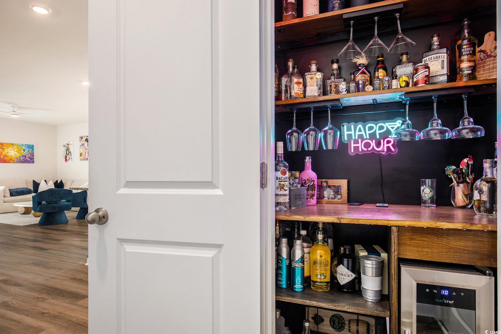 Welcome to this stunning 5-bedroom, 3.5-bath home in the Island Green community. Step inside through the foyer to an open first-floor layout featuring a spacious living room, a dining area off the kitchen, and beautiful LVP flooring throughout. The kitchen offers stainless steel appliances (refrigerator, range, microwave, dishwasher), granite countertops, an island, and custom shelving in the pantry. The first-floor owners suite includes a ceiling fan, a custom walk-in closet, and an ensuite bathroom with a double-sink vanity and walk-in shower. A laundry room, convenient half bath for guests, and a stylish Hidden Bar complete the main level. Upstairs youll find four additional bedrooms, including one that can function as a large family or media room. There are also two full bathrooms and a loft on the second floor. Enjoy easy access to the backyard through the sliding glass doors in the living room. Additional features include a two-car garage and a prime location just minutes from the beach, golf, shopping, and restaurants. Schedule your showing today!