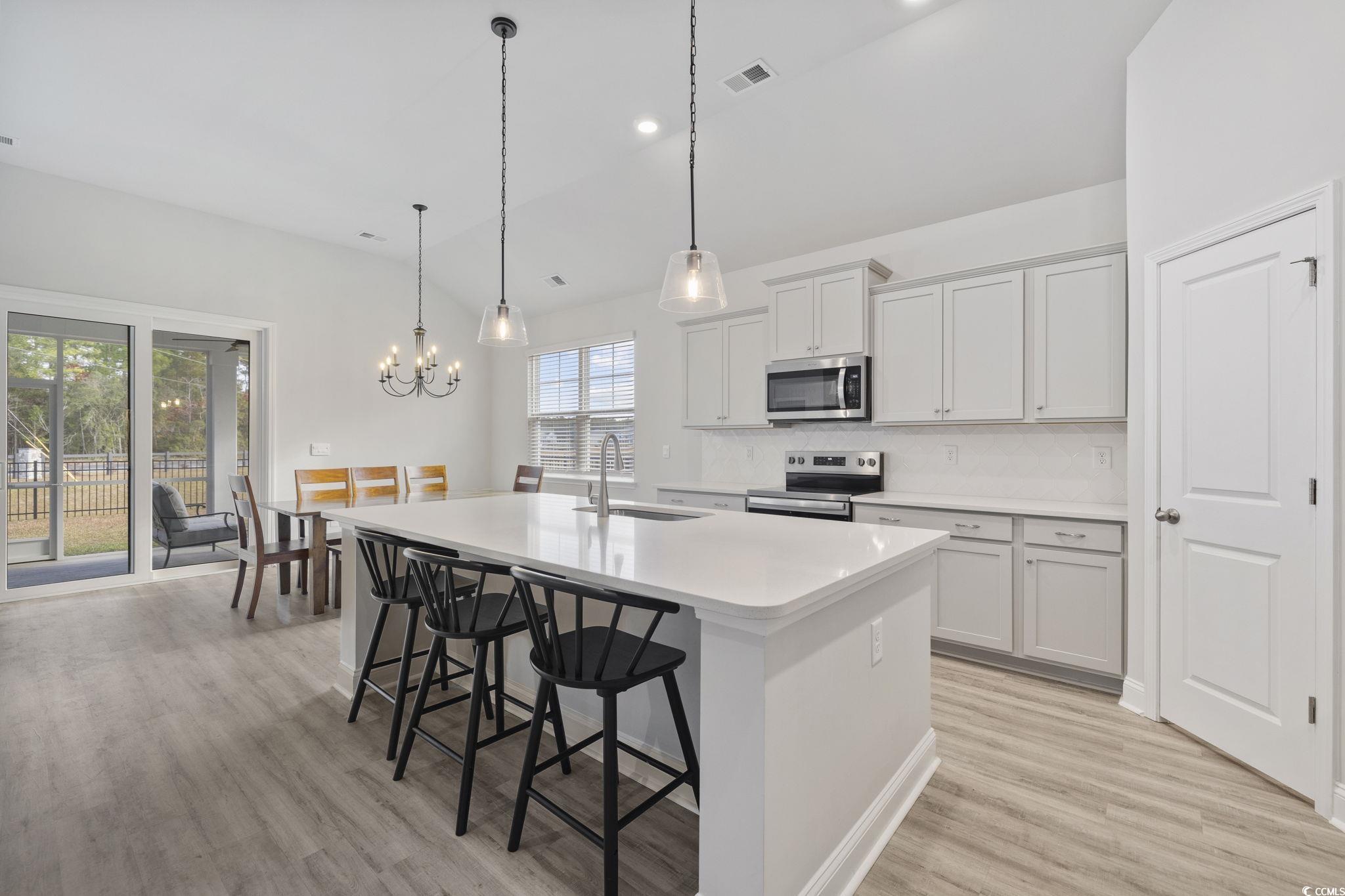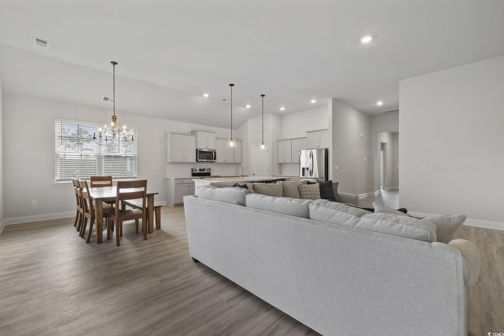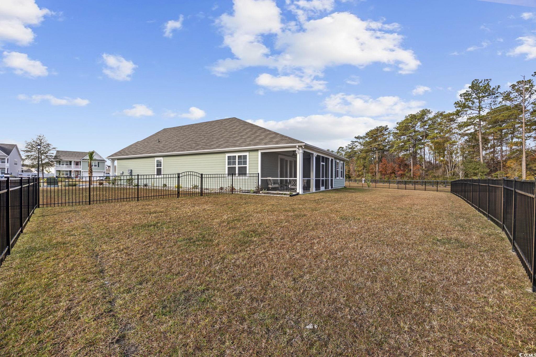 Better than new! This exceptional home showcases the highly desired Litchfield floor plan in Auberon Woods, offering all the benefits of new construction without the wait AND with upgrades you wont find in a standard build. Step into an impressive open-concept living area featuring high ceilings, abundant natural light, and a split-bedroom layout that provides both comfort and privacy. The kitchen stands out with granite countertops, a spacious island, stainless steel appliances, glass island pendants, and blinds that were installed as part of the original purchase. Barstools at the breakfast bar convey. The dining room chandelier adds an elegant touch, while all four bedrooms are equipped with lighted ceiling fans for year-round comfort. Enjoy two additional lighted ceiling fans on the screened-in back porch, leading out to a beautifully enhanced backyard complete with fresh landscaping, new bushes across the property, a striking palmetto palm, and large New England river rock. The exterior also includes a black aluminum fence and a Hunter five-zone irrigation system. Modern comforts extend to an oversized LG stainless steel refrigerator, complete with a bottom freezer and a handy snack drawer. In the laundry room is a GE Profile washer and dryer that are only three months old, a secondary refrigerator in the garage, and an Echo self-propelled lawn mower that conveys. With its thoughtful upgrades, stylish finishes, and meticulous care, this home truly delivers a better-than-new living experience in one of the areas most desirable communities.