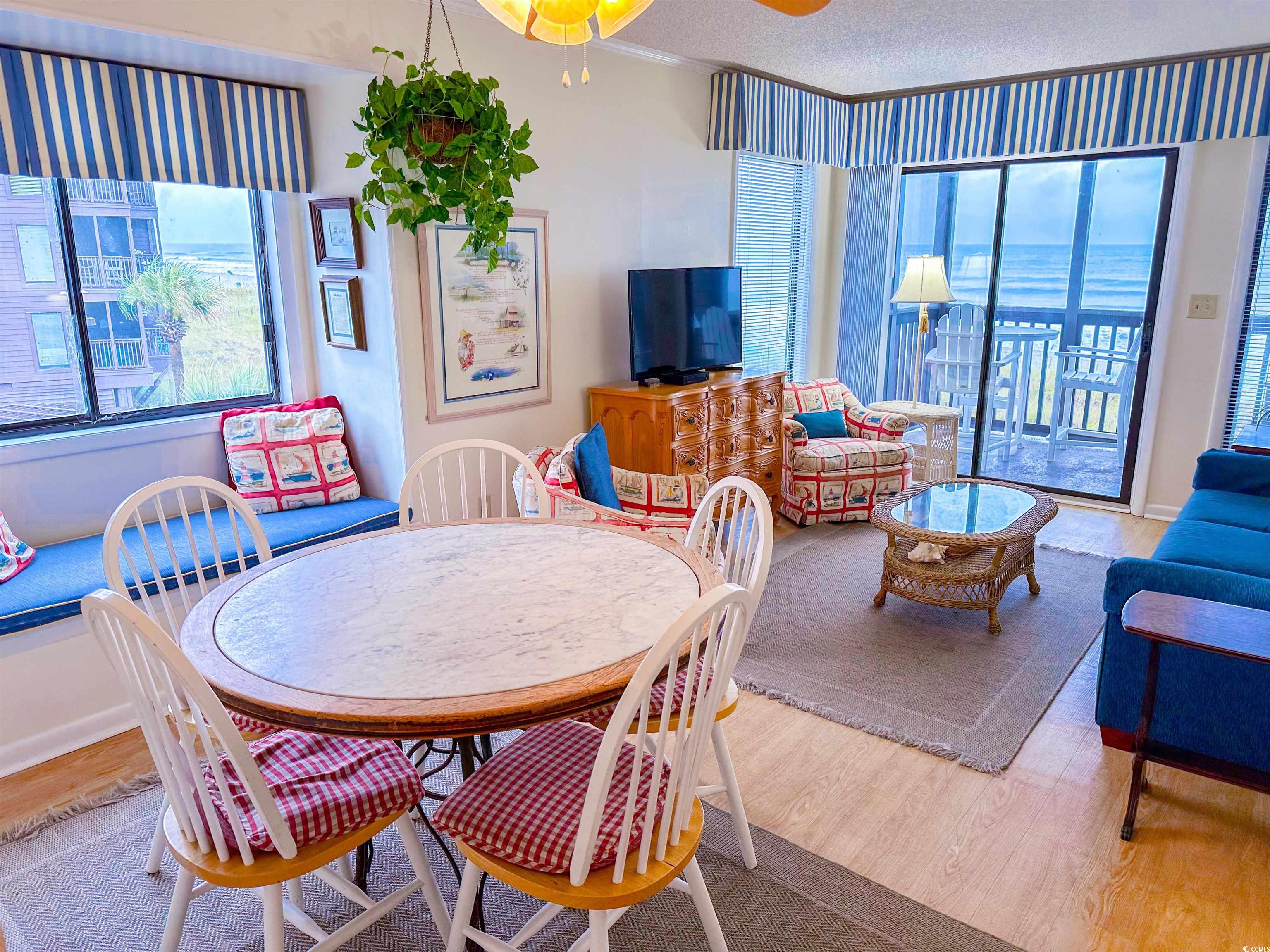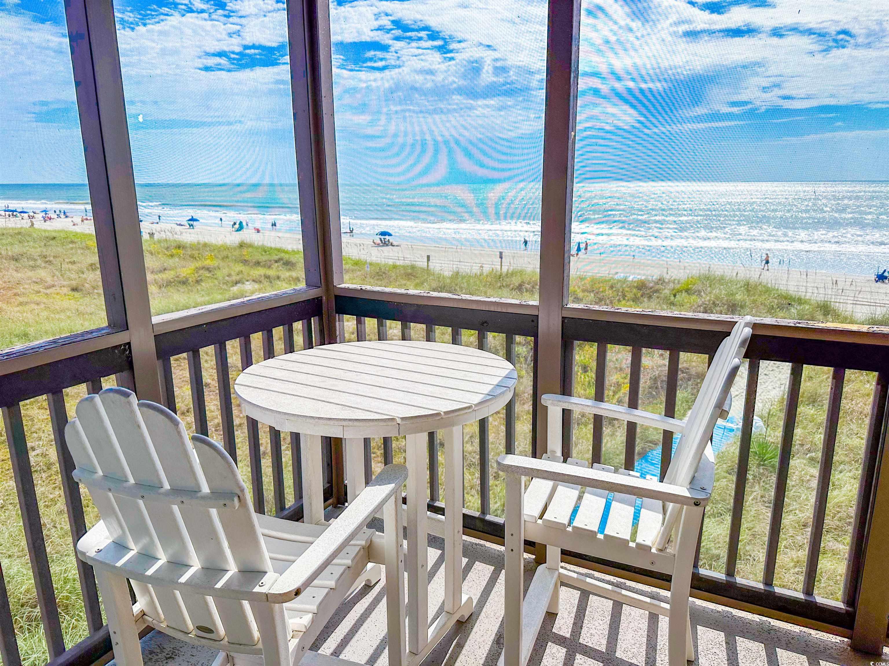 Enjoy oceanfront living in this 3-bedroom, 2.5-bath corner condo located on the 2nd floor of a desirable oceanfront building at Tilghman Beach & Racquet Club. This oceanfront corner unit offers ocean views on one side and pool views on the other, along with two private balconiesa screened-in balcony off the living room and a private balcony off the primary bedroom. The open living area is bright and inviting, and the fully equipped kitchen includes a microwave, dishwasher, and ample cabinet space. An in-unit washer and dryer add everyday convenience. The primary suite features a King bed, private bath with walk-in shower, and balcony access. One additional bedroom offers a Queen bed with its own ensuite half bath, while the third bedroom includes two twin beds. Owners enjoy access to multiple pools, lounge areas, and direct beach access via a private sandy path. Conveniently located within walking distance to Main Street North Myrtle Beach, with dining, shopping, and entertainment nearby.