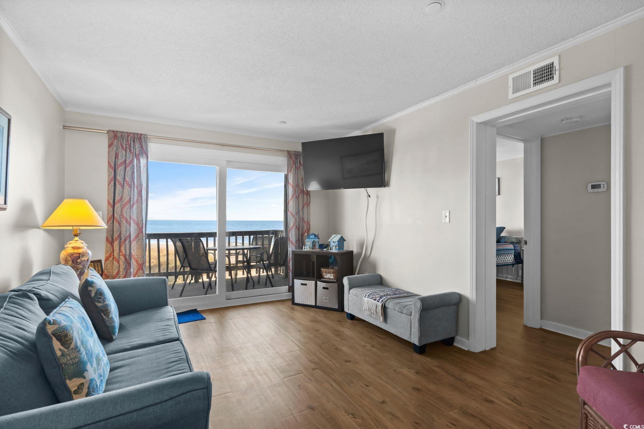 Sea Master 203 is a well maintained two bedroom two bathroom ocean view condo located in an oceanfront building in Garden City Beach. This furnished coastal retreat has been thoughtfully updated with a fresh interior repaint in a clean neutral tone, upgraded luxury vinyl plank flooring throughout the living areas and bedrooms, and complete furniture replacements during the seller's ownership. The HVAC was replaced in 2022 which provides added comfort and reliability. The condo also offers a strong rental income history which adds value for investors and second home owners. The kitchen opens directly into the dining and living area where the ocean becomes the main focal point. Large sliding glass doors lead to a covered balcony with wide views of the Atlantic Ocean. It is an ideal place to enjoy morning coffee, afternoon shade, and the coastal setting year round. The primary bedroom features ocean views from two windows and provides direct access to the balcony. The guest bedroom is located toward the front of the condo which offers a nice separation between the bedrooms. Both bathrooms add more privacy and comfort for your stay. Sea Master offers a convenient Garden City Beach location close to the Garden City Pier, restaurants, fishing, local shops, Myrtle Beach attractions, and the Murrells Inlet Marshwalk. The building features multiple elevators, an oceanfront pool with a large sun deck, direct beach access, and a laundry room on each floor. There may also be an option to install a private washer and dryer inside the unit. Please inquire for additional details. This ocean view condo is suited for a coastal getaway, a vacation rental property, or an investment opportunity along the South Strand. Sea Master 203 is clean, updated, fully furnished, and ready for new ownership. Please contact the listing agent, or your Realtor, to schedule a showing or learn more today!