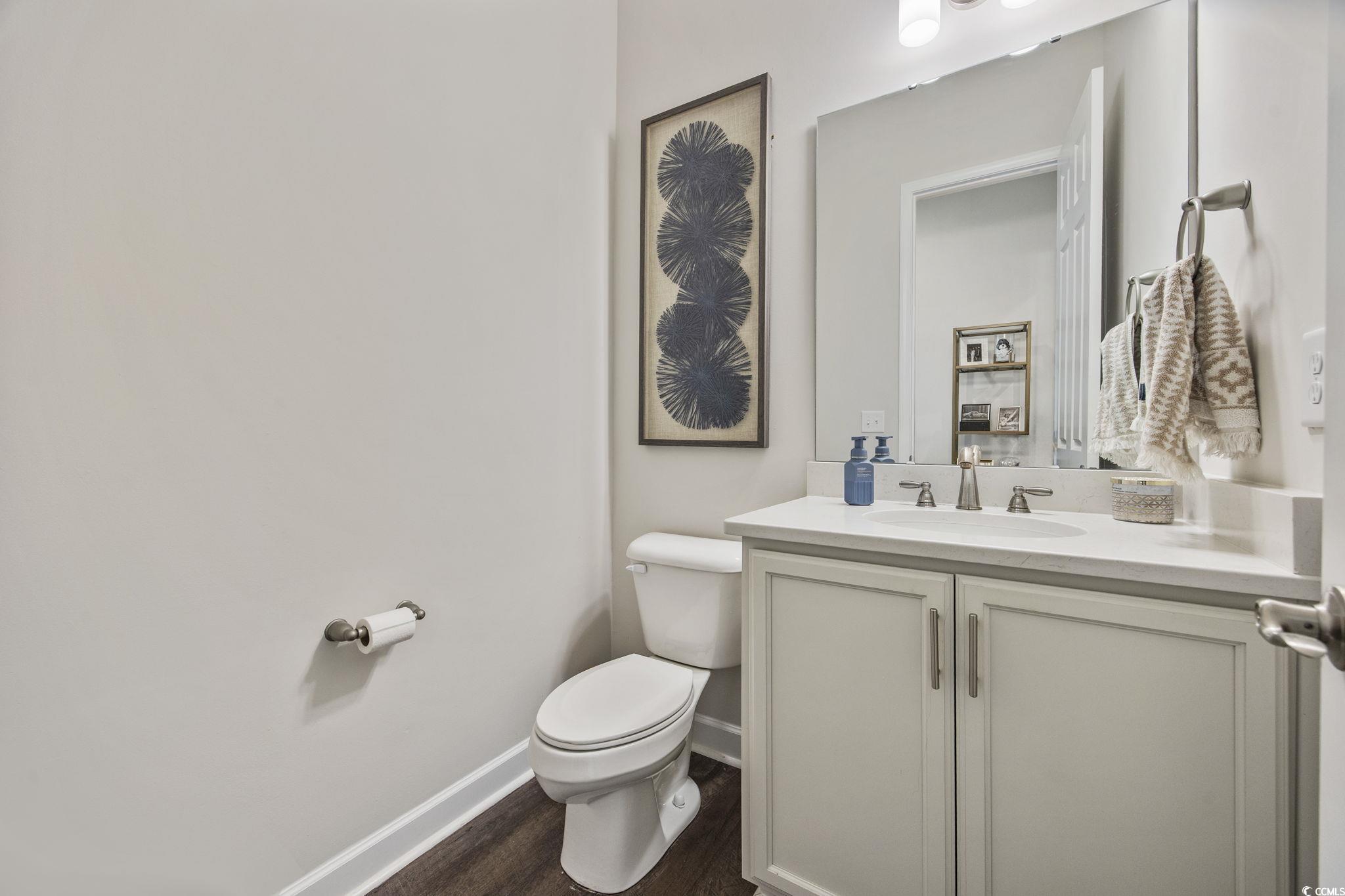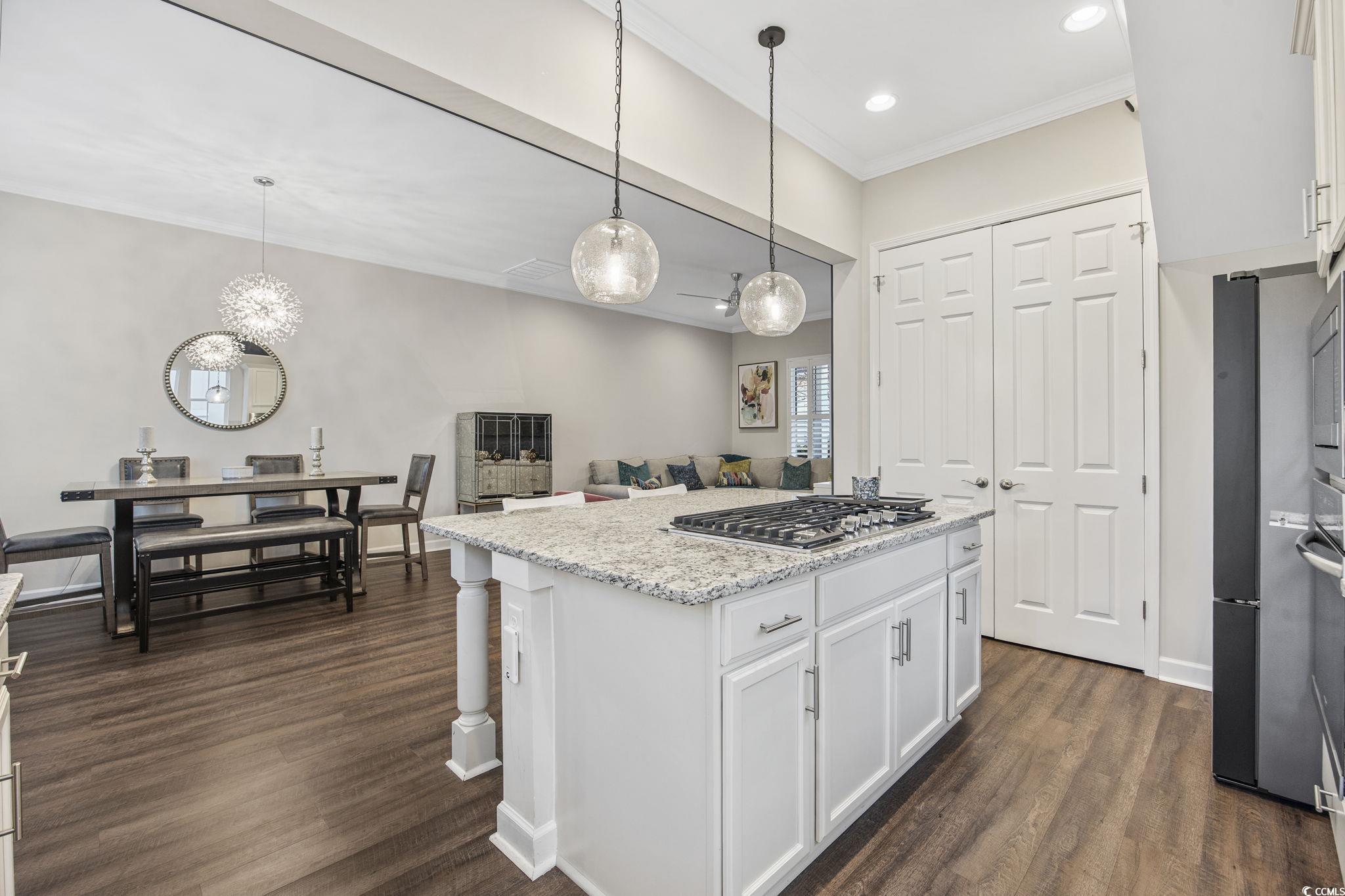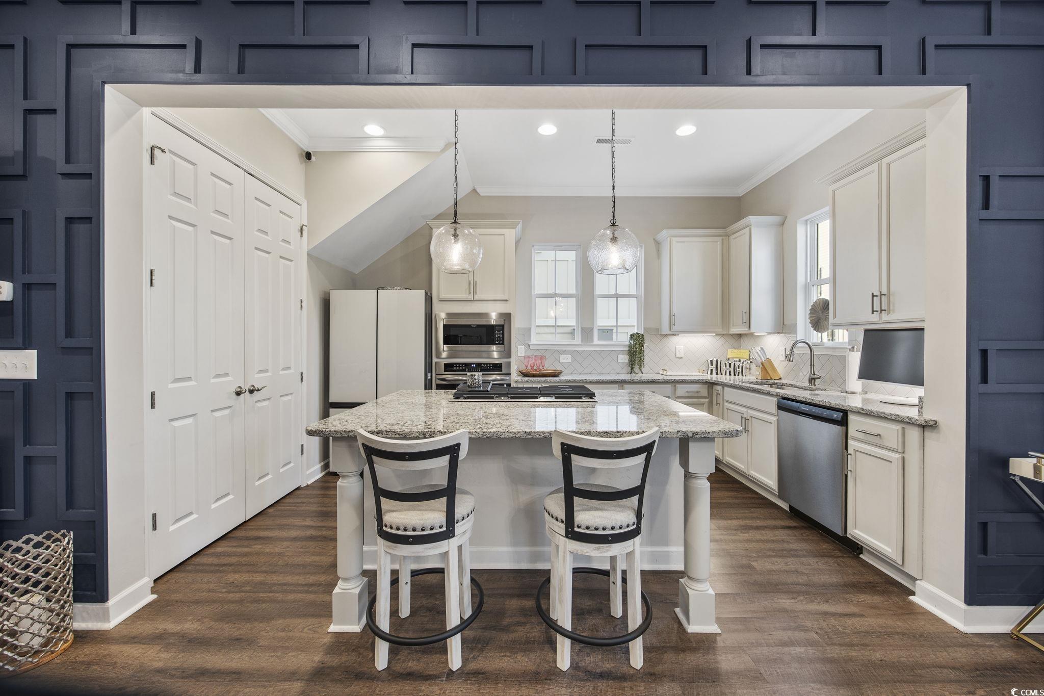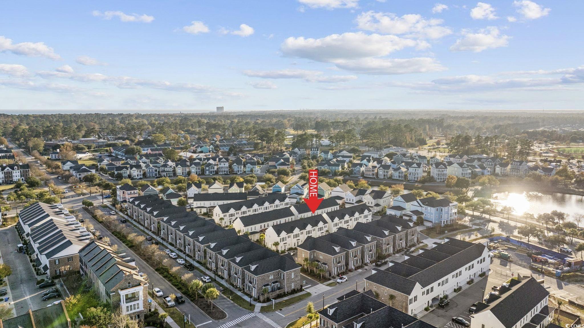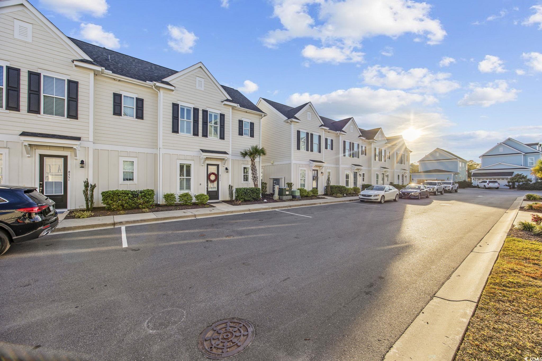 Welcome home to this better than new townhome in the heart of The Market Common in Myrtle Beach. This 2 bedroom, 2.5 bath END UNIT townhome is beyond move-in-ready with upgrades galore. Upon walking in the front door the whole downstairs is open and stunning with plenty of natural light and Plantation shutters throughout. The kitchen has upgraded granite countertops, stainless steel matching appliances including a natural gas range, plenty of cabinets, herringbone tile backsplash, and decorative pendant lights. There is space on the island for barstools or the option of dining in the dining nook. There is also a double door pantry and half bath on this floor. Crown molding is featured throughout the first floor and there is a door off the living room that leads to the back patio where you can enjoy some fresh air. Upstairs are the 2 bedrooms each with their own ensuite. The owners' bathroom is spacious and features a double vanity. The owners' bedroom also has Plantation shutters, ceiling fan, and large walk-in custom closet. The second bedroom could be a bedroom or a home office. It has its' own bathroom with a tub/shower combo. The washer and dryer are on the same floor as the bedrooms and convey with the home. There is outside attached storage and a tankless hot water heater. Living in this community there is easy access to the beach, dining, shopping, and entertaining... all is a golf cart ride, bike, or walk away! From this townhome is literally just feet to the downtown Market Common. The HOA includes the Market Common Amenity Center that features a large pool, 2 hot tubs, a lazy river, kiddie pool, ping pong and gym. Trails, bowling, a dog park, a movie theater, playgrounds, and gyms are all just some parts of living the lifestyle of The Market Common. Schedule your showing of this immaculate home today!
