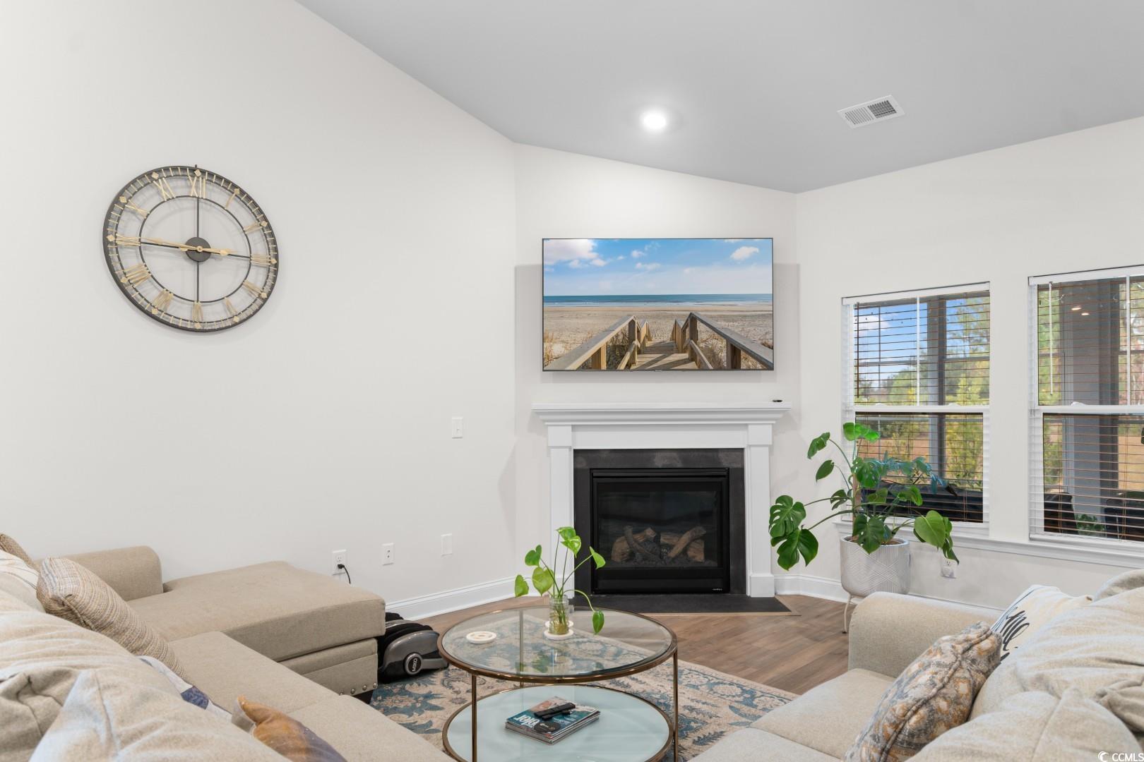Welcome to this warm and inviting 4-bedroom, 3-bath home in the heart of Belle Harbor---a community loved for its sidewalks, parks, and that ""Market Common lifestyle"" where everything you need is just a golf-cart ride away. From the moment you walk in, the open-concept layout and vaulted ceilings make the whole home feel light, airy, and easy to live in. The living room is centered around a cozy fireplace---perfect for slow mornings, movie nights, or simply unwinding after a day exploring the beach or local shops. The kitchen is both stylish and functional, with granite countertops, stainless steel appliances, upgraded cabinetry, a tiled backsplash, recessed lighting, and a walk-in pantry that keeps everything tucked neatly away. Just off the main living space, you'll find a full bath and laundry room, both featuring durable ceramic tile flooring. The primary suite feels like its own little retreat with a tray ceiling, ceiling fan, oversized walk-in closet, and a beautifully finished bathroom with dual sinks and a spacious walk-in tiled shower. One of the best parts of this home is the all-seasons room---a bright, flexible space with a ceiling fan that's perfect for morning coffee, afternoon reading, or hosting friends. Step outside to the paver patio and take in peaceful views of the pond. Since it's a corner lot, you'll also enjoy extra breathing room and a little more privacy than you might expect. Belle Harbor offers fantastic community amenities as well---parks, pool, pickleball courts, playgrounds, and easy access to everything Market Common is known for. If you've been looking for a home that blends comfort, charm, and location, this one truly checks all the boxes!