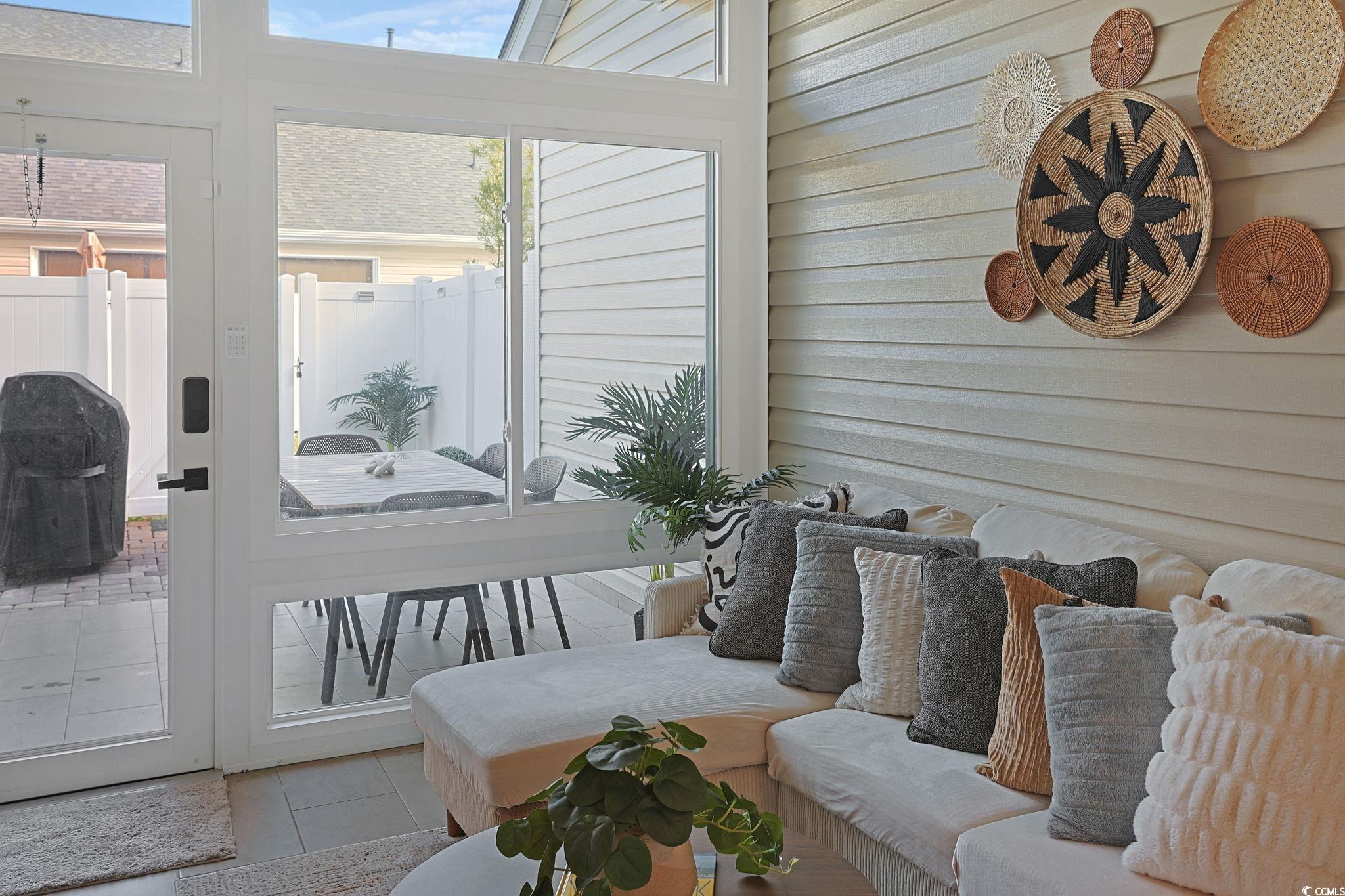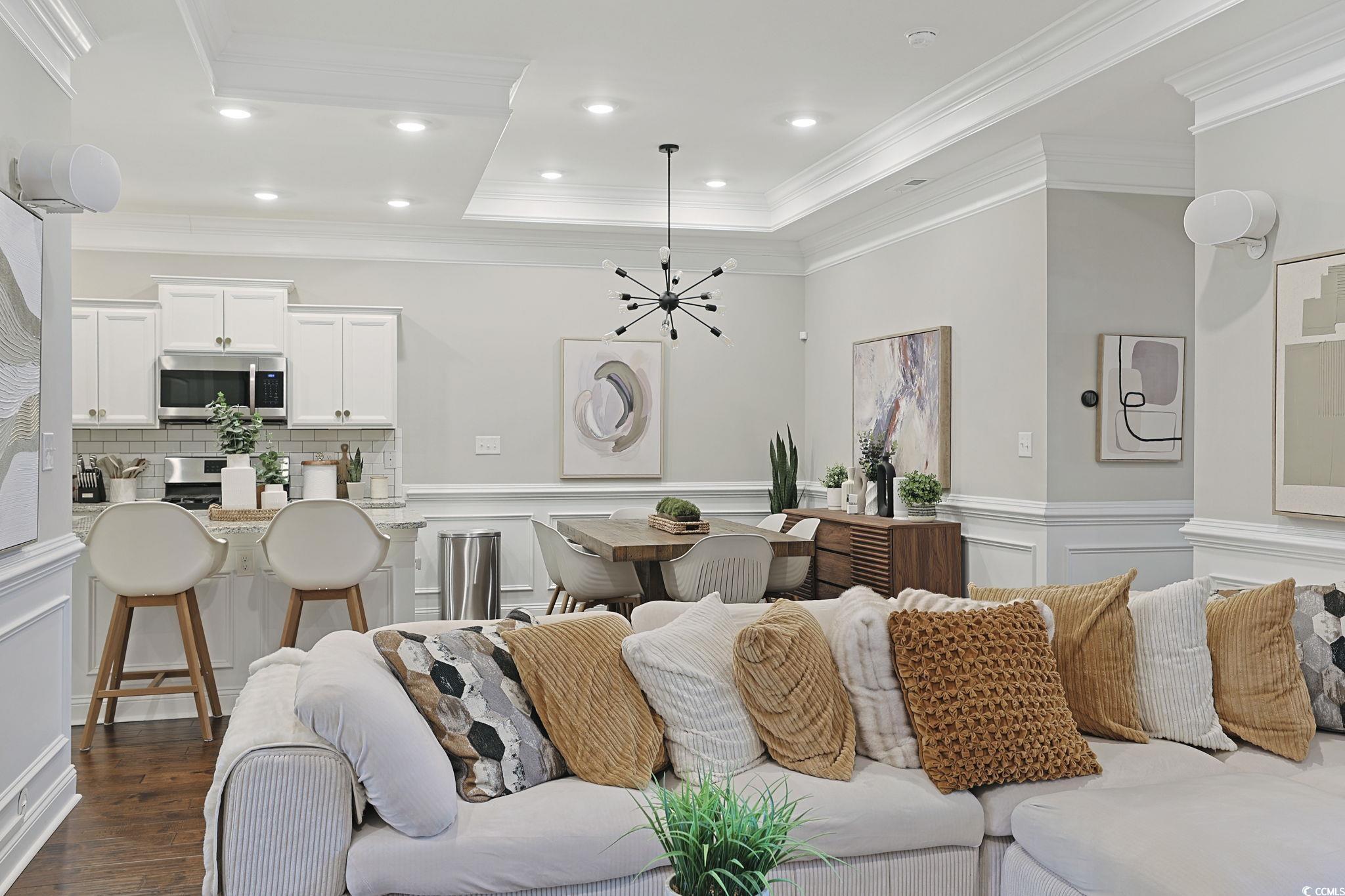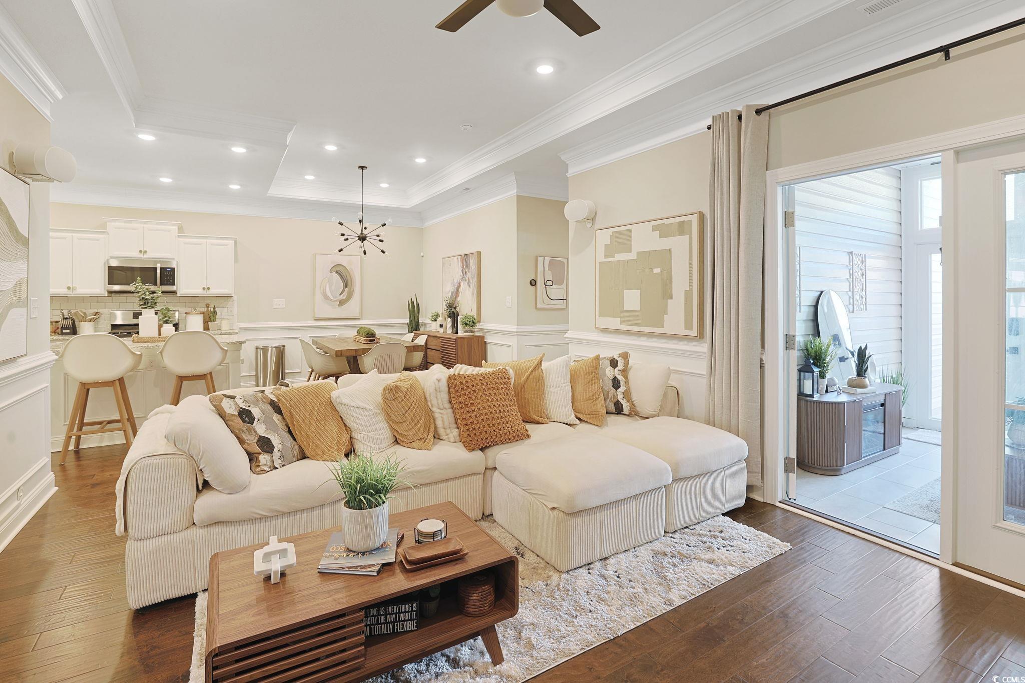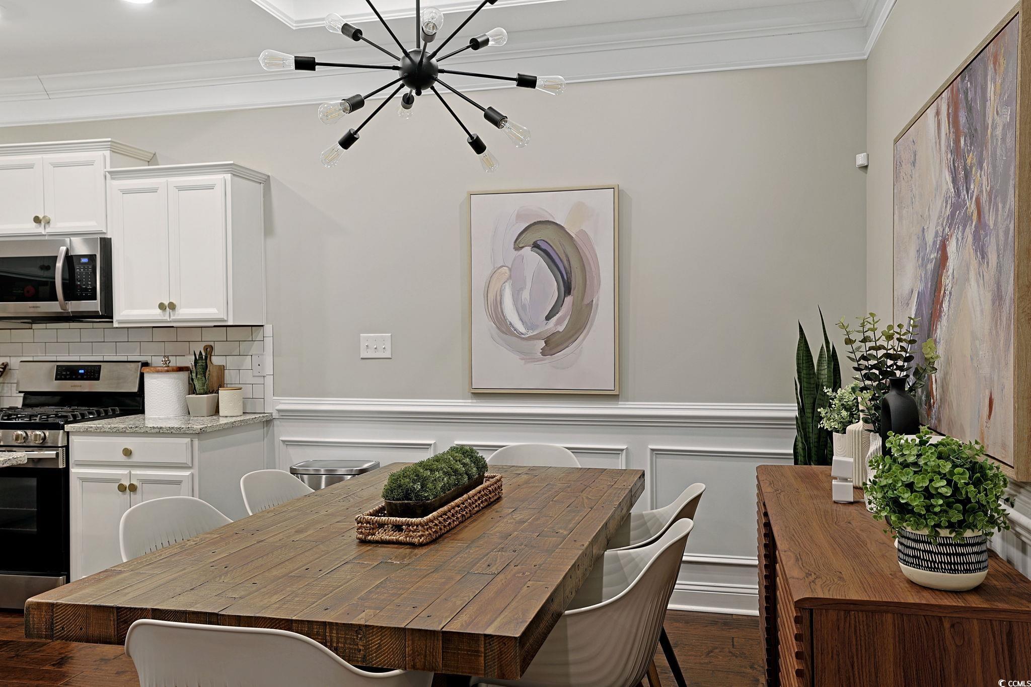 Presenting this luxurious 3 bedroom 2.5 bath townhome located in the very popular Queens Court community. This piece of paradise features an open floor plan with engineered wood & tile flooring, smooth flat 9 foot ceilings, elegant chair railing with shadow box paneling, crown moulding, recessed lighting, a guest powder room, a formal dining area, and a comfortable living room that showcases a sliding glass door that opens up to the delightful sunroom. The family friendly kitchen is equipped with a stainless steel appliance package that includes a gas range, built-in microwave, dishwasher, refrigerator, granite counter tops, a kitchen island, a breakfast bar, cabinets topped with crown moulding, and a practical pantry. The main level primary suite offers a rectangular raised-panel wainscoting that covers the full height of the wall (floor-to-ceiling), creating a dramatic backdrop. The panels are framed with crisp molding and painted in a high-gloss finish, which gives the wall depth and a luxurious feel, single step tray ceiling with a fan, private access to the double door primary bath hosting a vanity with dual sinks, a water closet, a deluxe step-in shower, and a large walk-in closet. As you venture upstairs you will find a memorable second master suite offering a ceiling fan, nice sized closet, and private access to a full bath. The second level is completed with an additional bedroom, a full guest bath, and a versatile bonus room. The main level of this exquisite home also includes a delightful back patio with a gas grill, lots of extra closet spaces, a laundry room, and a two car attached garage. This townhome affords you easy access to the beach and golfing along with all of the other activities and happenings in Myrtle Beach including fun eateries, award winning off-Broadway shows, public fishing piers, and intriguing shopping adventures along the Grand Strand. Conveniently located to your everyday needs, including grocery stores, banks, post offices, medical centers, doctors offices, and pharmacies. Check out our state of the art 3-D Virtual Tour.