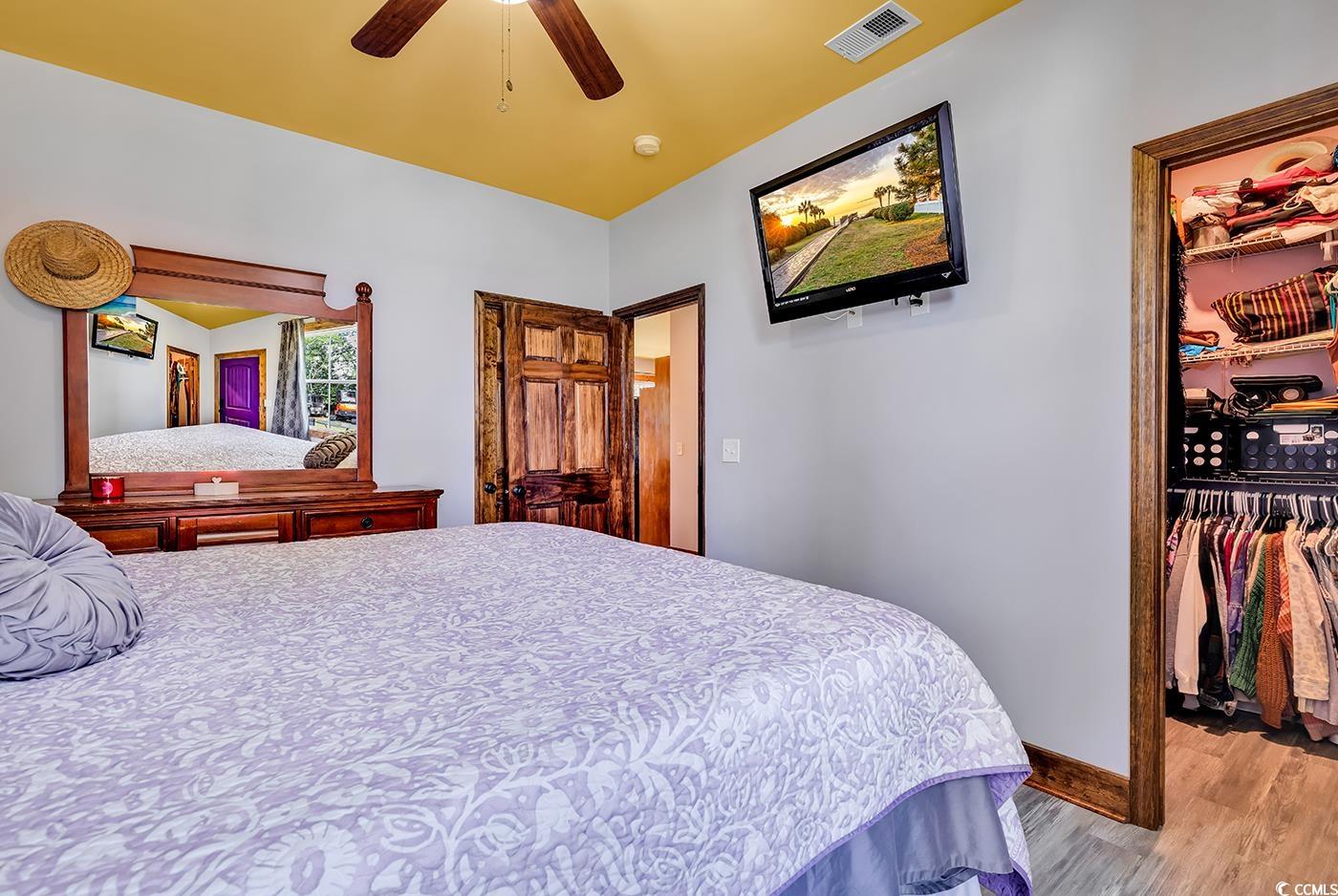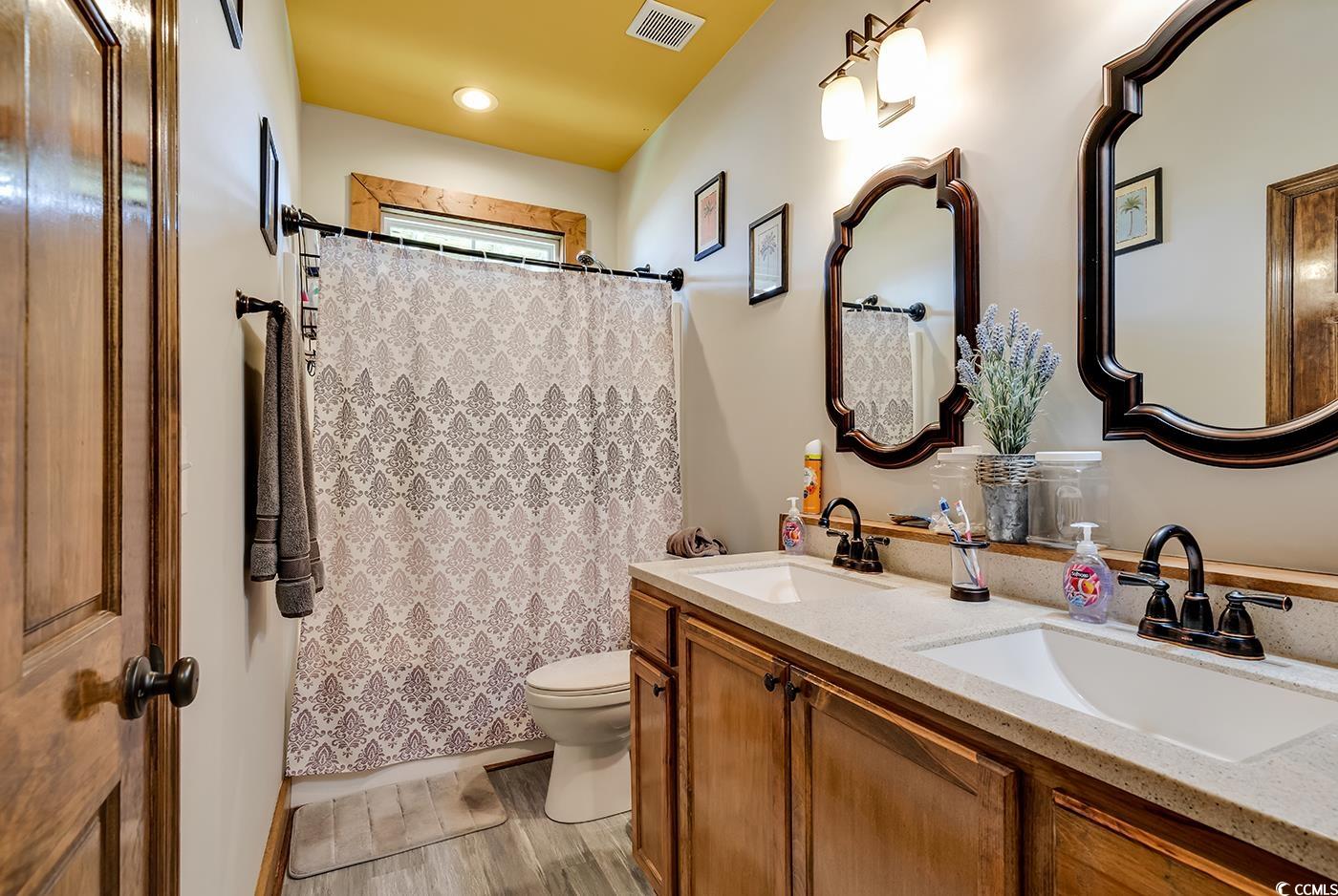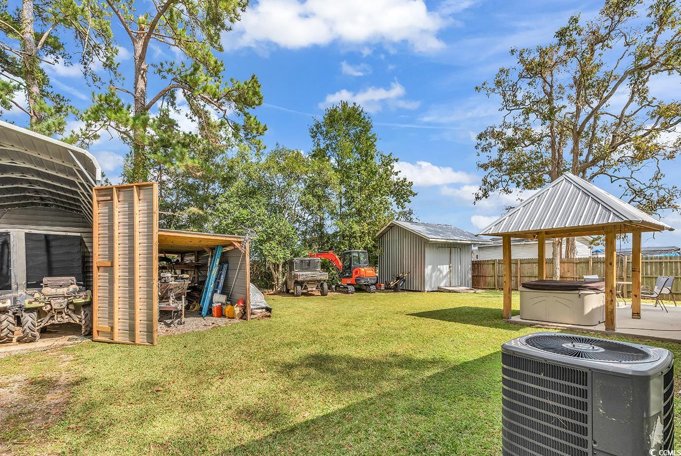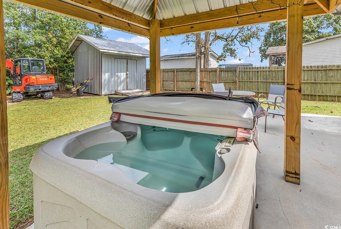 This beautiful home is located in Myrtle Beach, but not within the city limits. NO HOA! It's close to Market Common, Myrtle Beach Airport, Coastal Grand Mall, and Broadway at the Beach. On the main floor are two bedrooms, two bathrooms, with an open floor plan. The kitchen has black stainless steel appliances with granite countertops. The stove/oven is propane gas. Laundry room/Storage room (108 sq. ft.) is located outside, accessed by the carport. It is heated/cooled. A 40 gal. propane water heater is also located in the laundry room, along with plenty of storage area. If there is no electricity, you can still take a hot shower and cook. There are stairs outside the home that lead to a bonus room (250 sq. ft.) that serves as a third bedroom with a closet and a half bath. There is a door in the bonus room/bedroom that leads to the attic, where the air handler is located. There are two storage shops located in the backyard. One storage shop is 12' x 15'. The other is a large boat/camper storage 12' x 35' with a lean-to off the side 11'6"" x 35'. A 280 sq ft patio features a covered hot tub in the backyard. 6' wooden fence on both sides for privacy. Be aware of the potential for surveillance devices during showings. The agent is the seller.