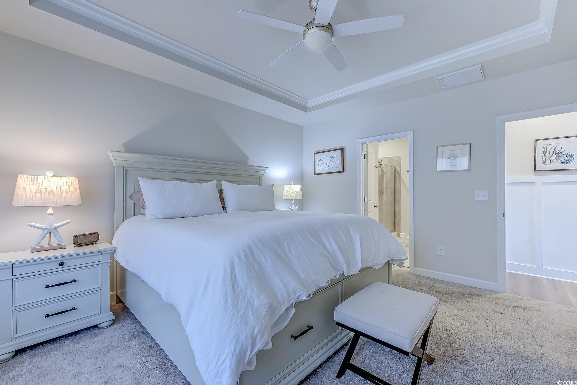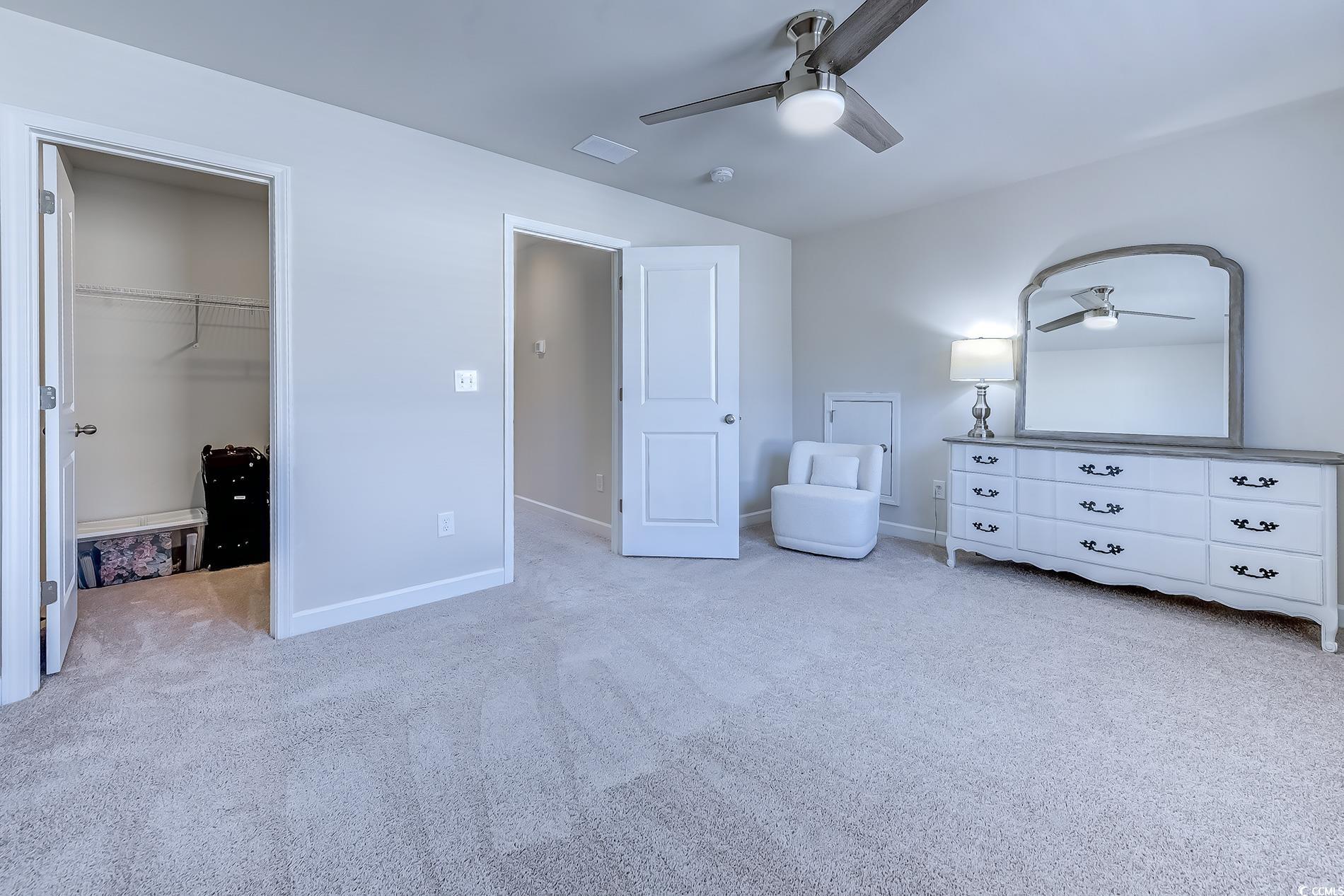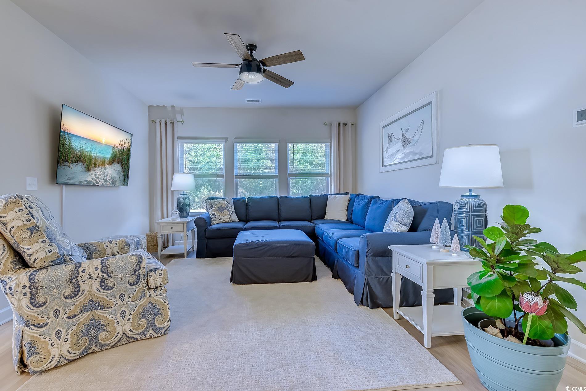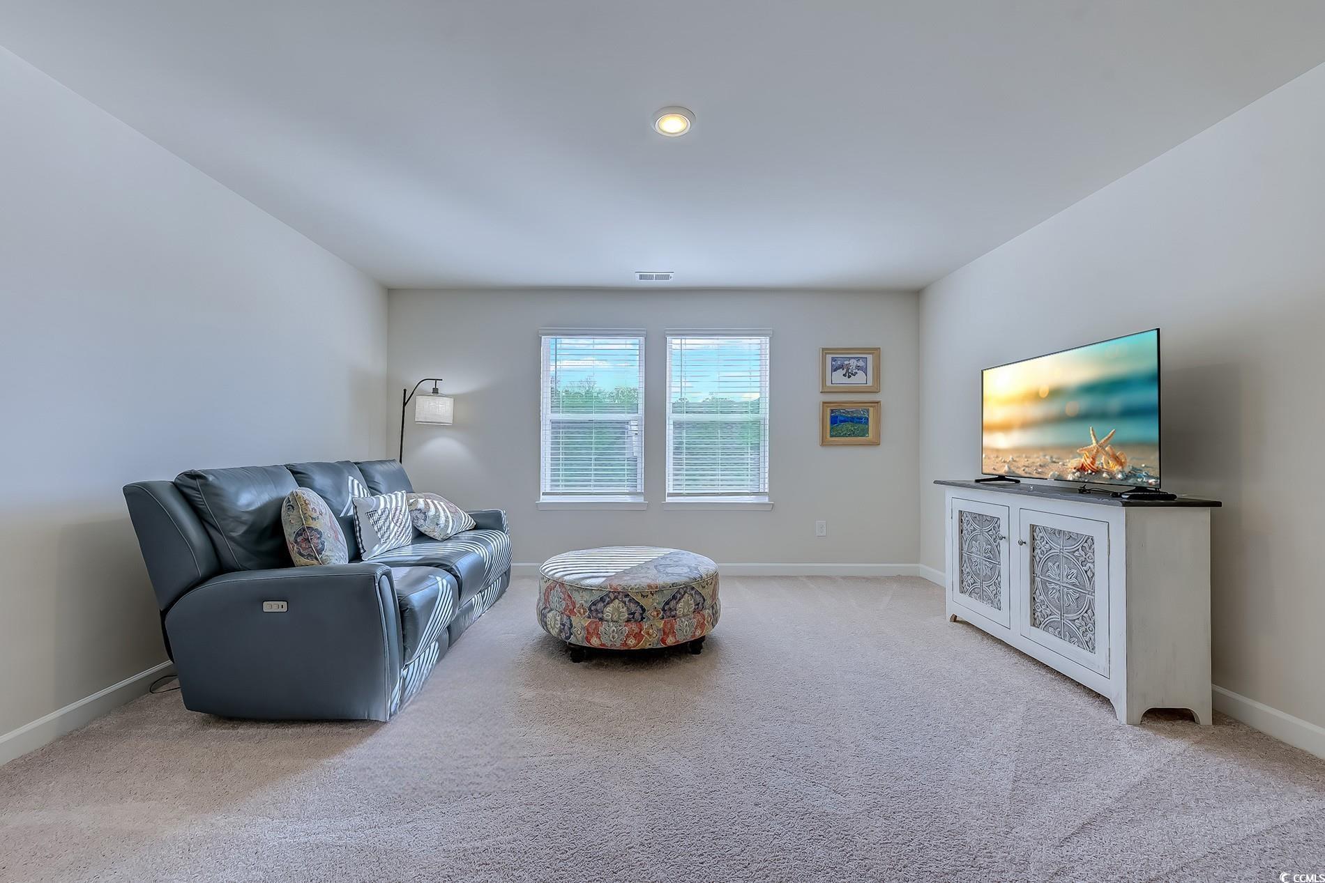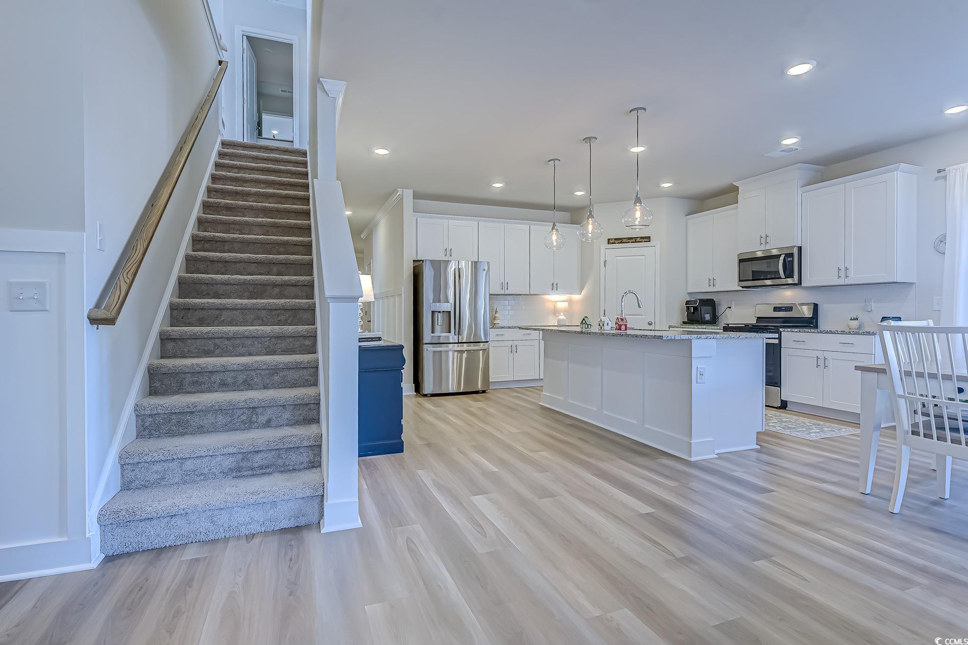 Better than new and move-in ready, this meticulously maintained home stands out with a larger, rare homesite backing to protected woods, offering a private backyard with peaceful views, frequent wildlife sightings, and lasting privacy since no homes can be built behind it. The sellers have enhanced the property with professional landscaping and an irrigation system, ensuring the grounds are always pristine and easy to maintain. Spacious and filled with natural light, the split-bedroom floorplan includes three bedrooms and a bonus or flex room on the main level, along with an additional bedroom and full bath upstairs, ideal for guests or multi-generational living. The open kitchen features granite countertops, a large island, white cabinetry, subway tile backsplash, natural gas cooking, stainless appliances, a roomy pantry, recessed lighting, and a refrigerator that is included. LVP flooring flows through the main living areas, and thoughtful additions such as a landing zone, window treatments, wainscoting, upgraded lighting, and ceiling fans give the home a polished, finished feel. The primary suite offers a tray ceiling, tiled walk-in shower, and spacious walk-in closet. Natural gas service and a tankless water heater add efficiency and comfort. Located in the Meritage Homes community of Waterside, this property carries a Longs, SC address while being within North Myrtle Beach city limits, providing free beach parking and city police and fire services. Community amenities include a pool, sports courts, walking trails, and a planned day dock on the Intracoastal Waterway. Convenient to Routes 22 and 31 and close to new shopping, this home is ideal for buyers who want coastal living without the wait of new construction.