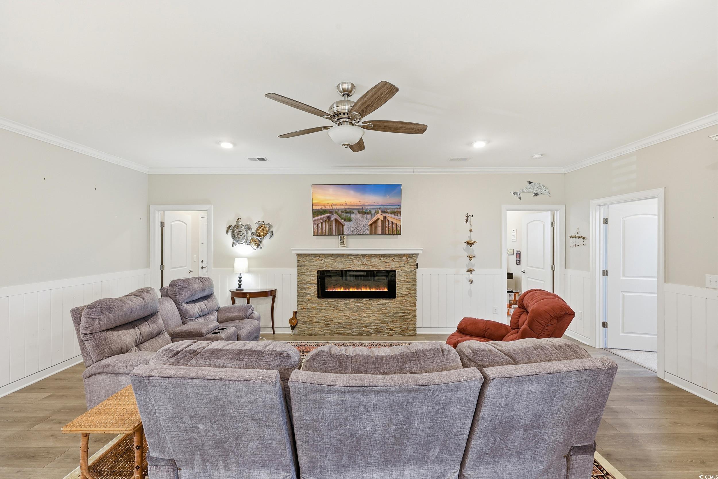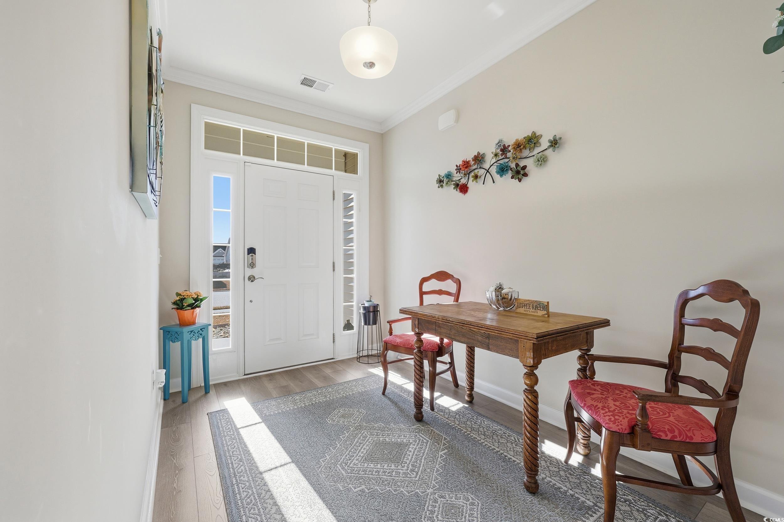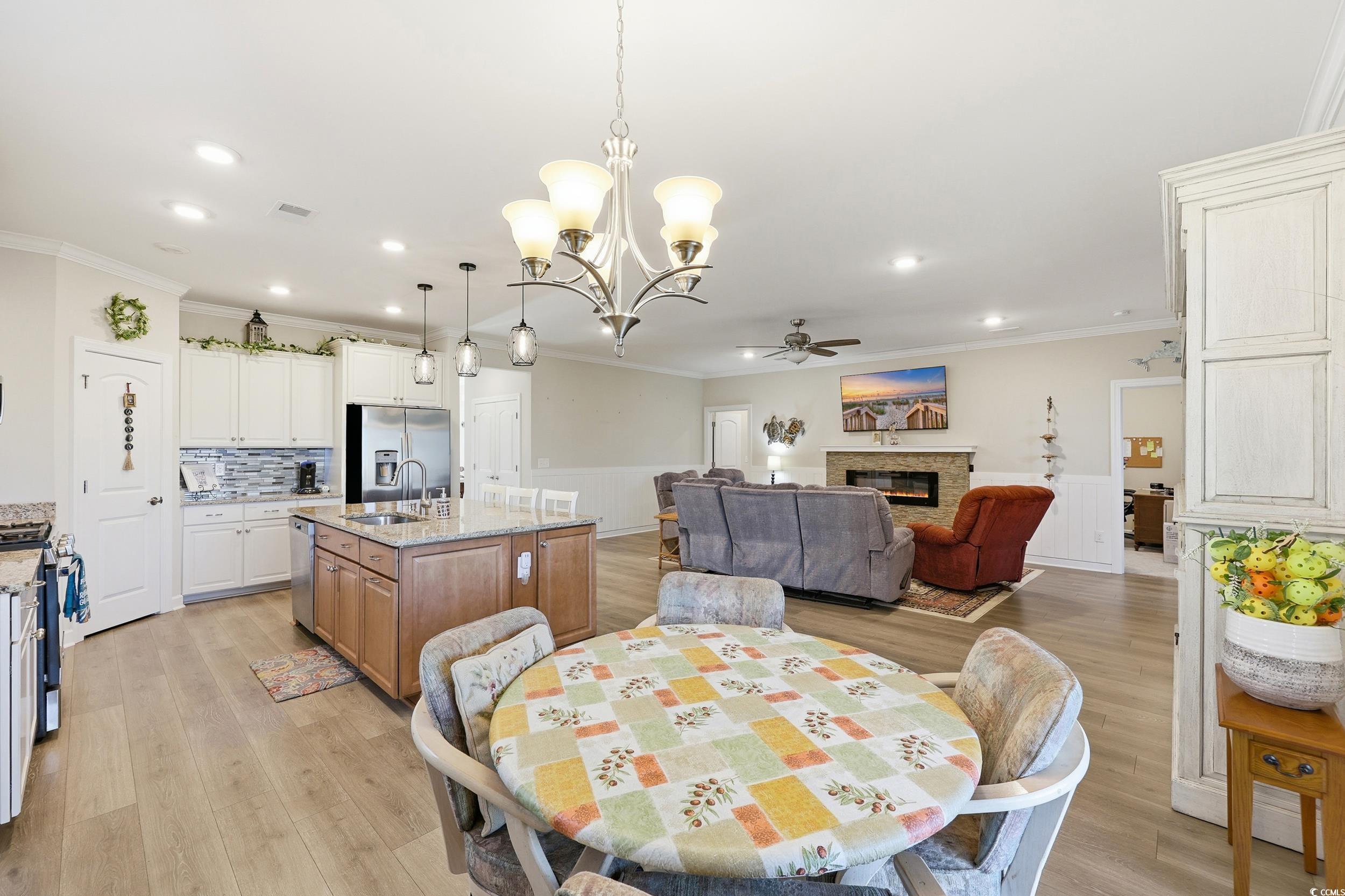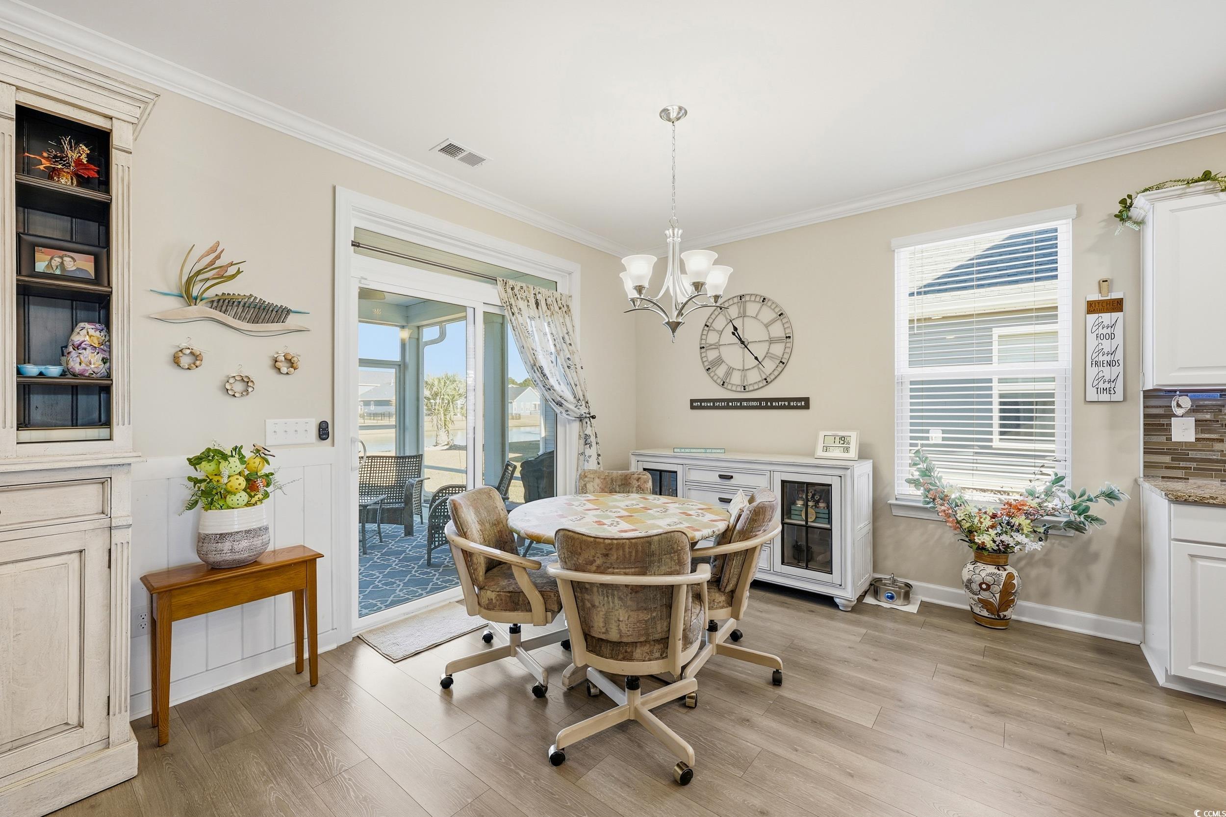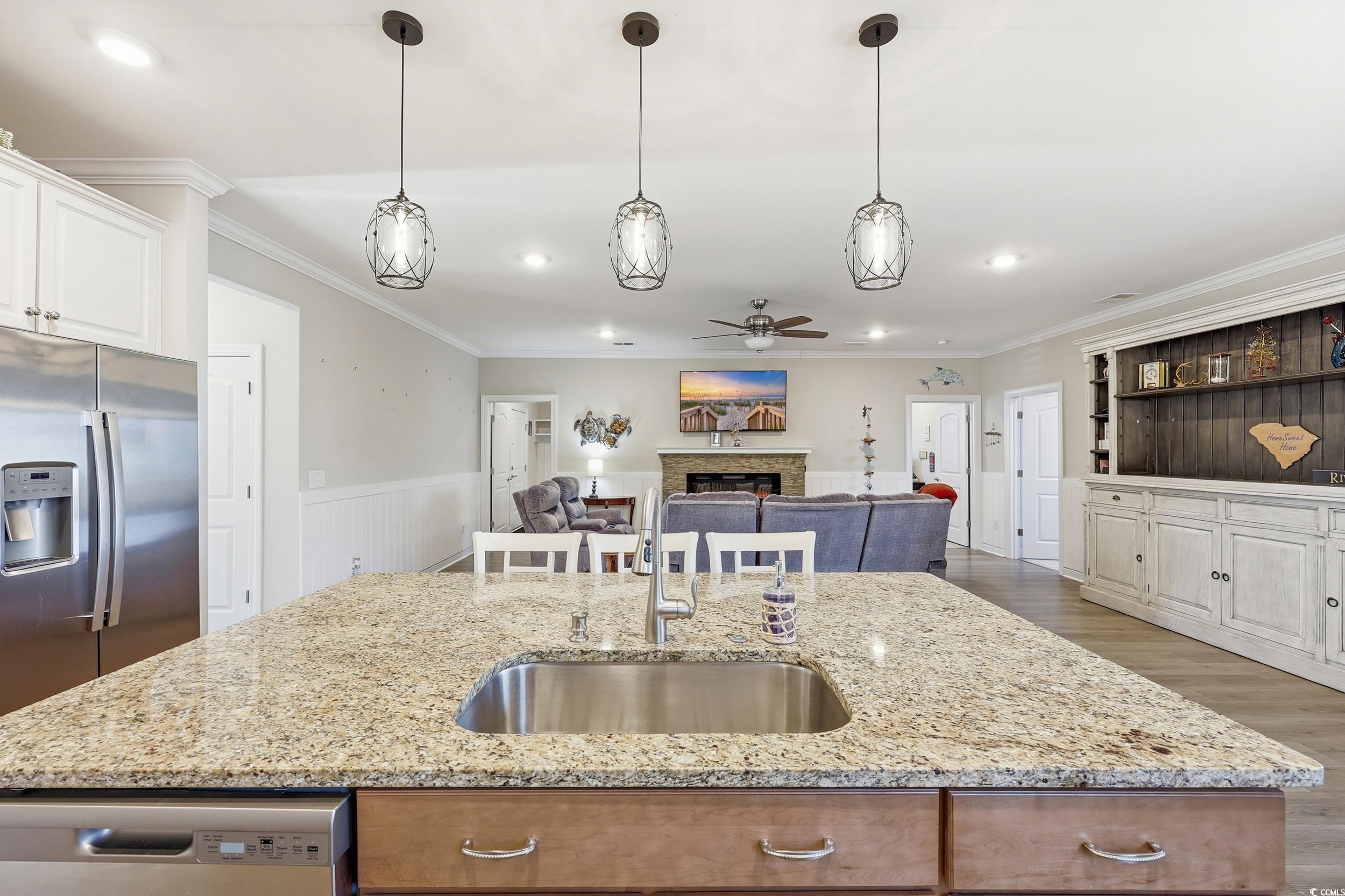 Welcome to this beautifully designed three bedroom two bathroom pond-front home located in the highly desirable Bridgewater community in Little River, SC. Thoughtfully crafted with coastal inspired architectural accents, this home offers a bright, airy feel and an exceptional open floor plan perfect for everyday living and entertaining. The spacious great room flows seamlessly into the kitchen, where a large center island anchors the space making it ideal for gatherings, meal prep or casual dining. The primary suite is a true retreat, featuring a tray ceiling, crown molding and two separate closets. The primary bath includes a tiled shower, double vanity sinks, linen closet and a separate water closet. Enjoy the benefits of a natural gas community, complete with gas range cooking, gas furnace and tankless hot water heater for efficiency and comfort. Step outside to the covered back porch and unwind while overlooking the peaceful waterfront setting while having morning coffee or relaxing in the evening. Ideally located, Bridgewater offers endless amenities such as full time activities director, community events, large community pool, pickle ball courts, dog parks, playground, sidewalks, and kayak launch. Located minutes away the beautiful Atlantic Ocean, near area hospitals like McLeod Hospital and easy access to area shopping, dining and the charming Little River waterfront. Schedule your tour today!