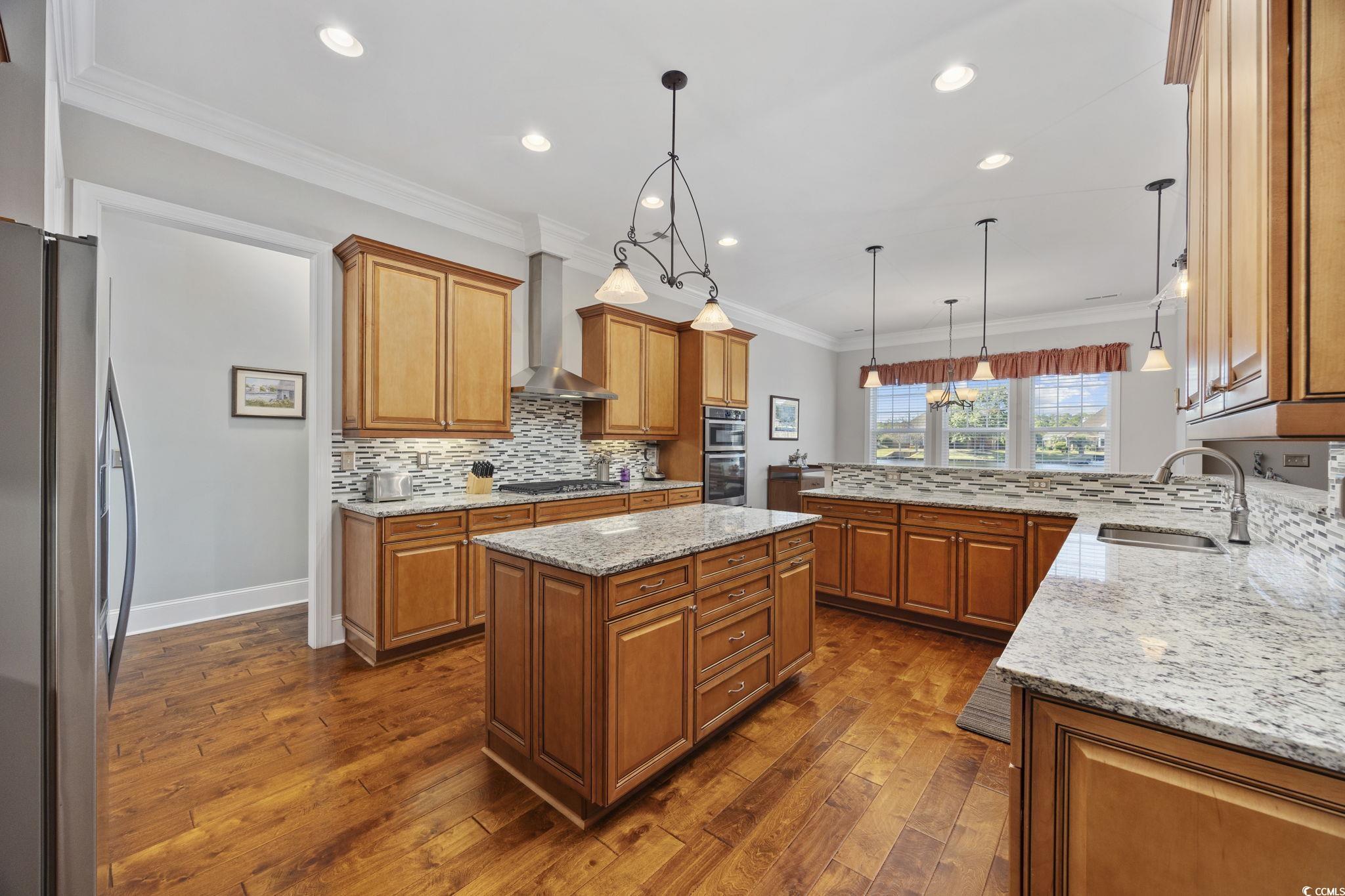 Lakefront Living at Its Finest in Plantation Lakes! Welcome to this stunning custom, all-brick, single-story home perfectly positioned on the lake in the highly sought-after Plantation Lakes community. Offering 4 bedrooms and 3.5 bathrooms, this spacious split-bedroom floor plan is filled with natural light, showcasing hardwood floors in the main living areas, extensive crown and accent molding, and exceptional attention to detail throughout. The expansive great room features 13' coffered ceilings, a stone-wrapped gas fireplace, and large sliding glass doors that open to the sunroom,creating seamless indoor-outdoor living. The sunroom is equipped with EZ-Breeze windows and a Mitsubishi mini-split heating and cooling system, allowing you to enjoy breathtaking lake views comfortably year-round. The gourmet kitchen is designed to impress with granite countertops, stainless steel appliances, 42"" cabinets with soft-close drawers and doors, mosaic tile backsplash, under-cabinet lighting, a large work island, gas cooktop, separate breakfast nook, and an oversized walk-in pantry. The primary suite is a true retreat, featuring serene lake views, two large walk-in closets, and a spa-like bath with dual vanities, whirlpool tub, tiled walk-in shower with seat and frameless glass door, linen closet, and separate water closet. Three generously sized guest bedrooms are thoughtfully located on the opposite side of the home, including one ensuite bedroom and two sharing a hall bath. Additional highlights include a new HVAC system replaced in 2025 with a 5-year warranty, tons of windows throughout, and countless upgrades that make this home truly special. Plantation Lakes is located in the award-winning Carolina Forest School District and offers 17 miles of connected lakes along with an impressive amenities center featuring a clubhouse, fitness center, two swimming pools, tennis courts, basketball courts, and a playground. This lakefront home is an absolute must-see. Schedule your private showing today!