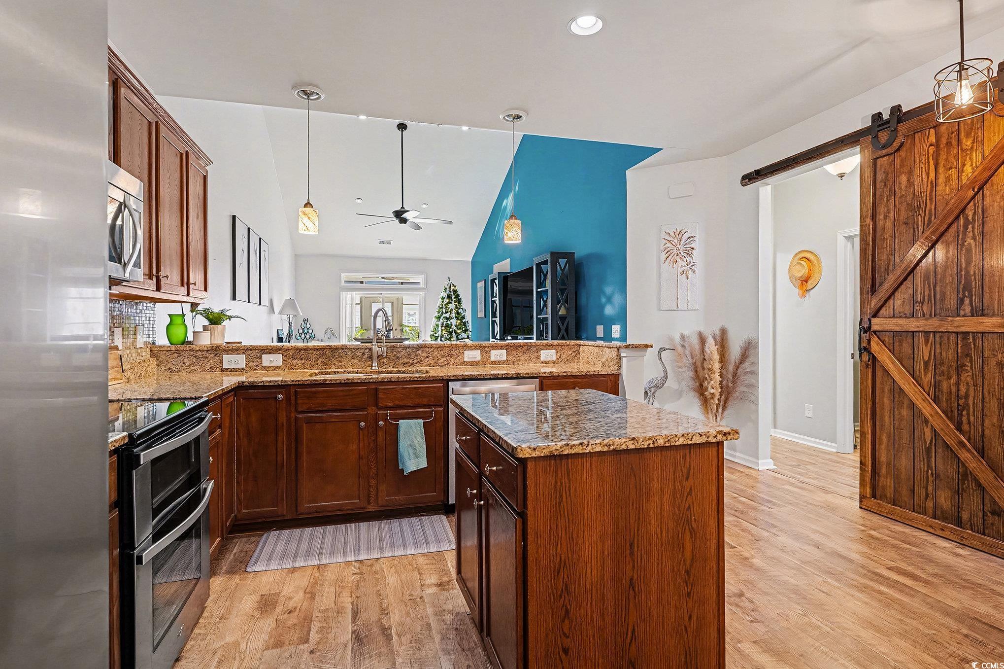Welcome to this charming 3-bedroom, 2-bath home in the highly desirable Cameron Village community. The thoughtfully designed layout highlights a beautiful kitchen with stainless steel appliances, granite countertops, and a generous island, ideal for both everyday living and casual entertaining. Overlooking the main living area, the vaulted ceilings enhance the space with abundant natural light, creating an open, bright, and welcoming atmosphere. The primary suite serves as a relaxing retreat, featuring a large walk-in closet and a private ensuite bath with dual vanities and a walk-in shower. Two additional bedrooms are well-sized and versatile, offering comfortable accommodations for family, guests, or a home office. Enjoy peaceful mornings or evenings on the screened-in porch with serene lake views, the perfect place to unwind and take in the surroundings. Cameron Village offers excellent community amenities, including a saltwater pool and clubhouse, all within a friendly neighborhood setting. Ideally located with quick access to Highway 31, this home provides convenience for commuting and exploring everything the Grand Strand has to offerall while enjoying a relaxed, low-maintenance lifestyle.