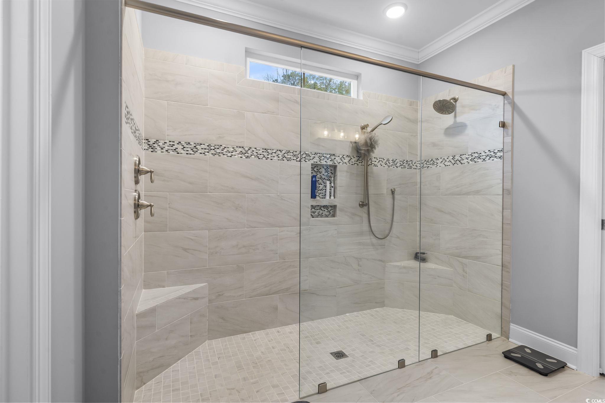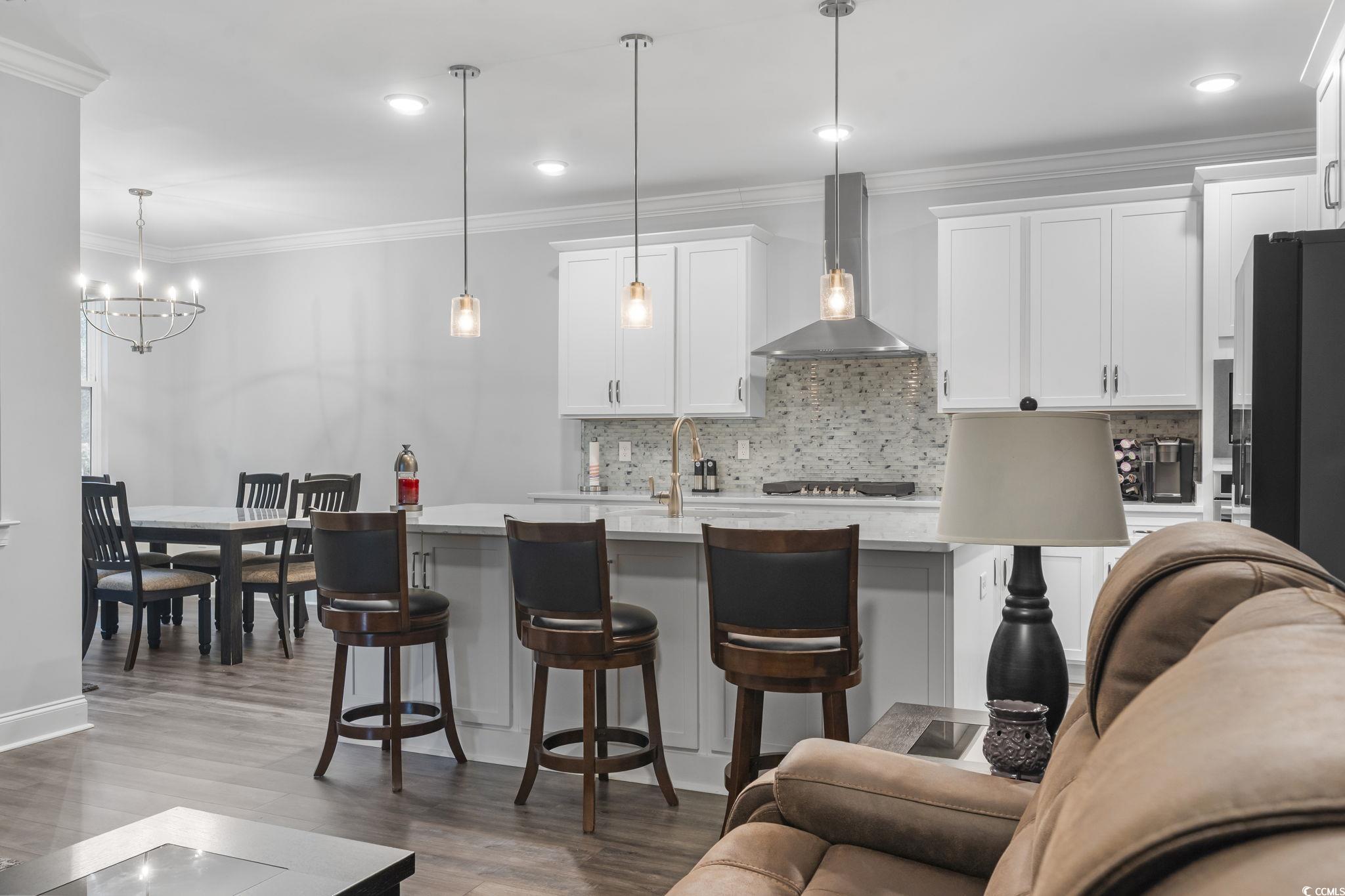 Located in Caroline Court, a boutique community of just 20 homesites, this thoughtfully designed home offers a rare 3-car garage, 4 bedrooms, 3 full baths, and a spacious bonus room, all in a highly desirable and quiet part Murrells Inlet. An extra large driveway and welcoming front porch leads into an open-concept layout designed for comfortable everyday living and easy entertaining. Luxury vinyl plank flooring runs throughout the main living areas, enhancing both durability and style. The large family room flows seamlessly into the kitchen and overlooks the covered rear porch, creating an ideal protected outdoor space. The kitchen is a true centerpiece, featuring quartz countertops, an 8-foot island, generous cabinetry, and ample workspace; perfect for gathering, cooking, and hosting. The open layout keeps the kitchen connected to the main living area while maintaining functionality. The primary suite, located on the main level, provides a private retreat with a well-appointed ensuite bath featuring dual sinks and an enormous tiled shower. Two additional bedrooms and a full bath on the main level offer flexibility for guests, office space, or hobbies. Upstairs, you'll find an additional bedroom, a full bath, and a large bonus room, ideal for a media room, game room, or flexible living space. The attached 3-car garage is a standout feature, offering room for vehicles plus a golf cart, beach chairs, and storage, making it well suited for coastal living. This home is just moments from the public boat landing at Waccamaw Marina, approximately 5 minutes to the Murrells Inlet Marsh Walk, and a few minutes to Huntington Beach State Park or Garden City Beach. Myrtle Beach and Pawleys Island are each about 20 minutes away, while Charleston is approximately 75 miles south. Schedule your private tour today. Measurements are approximate and to be verified by buyer.