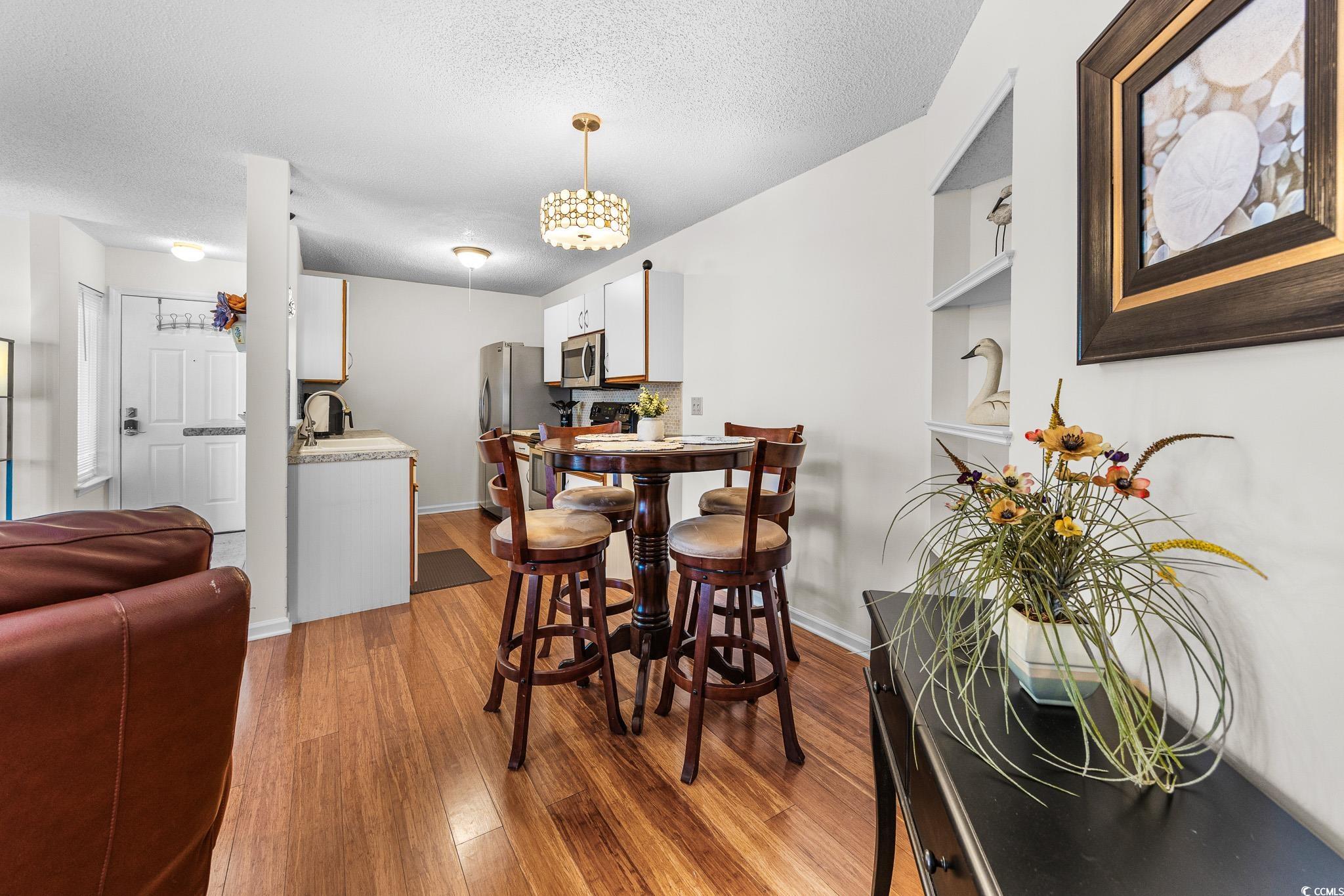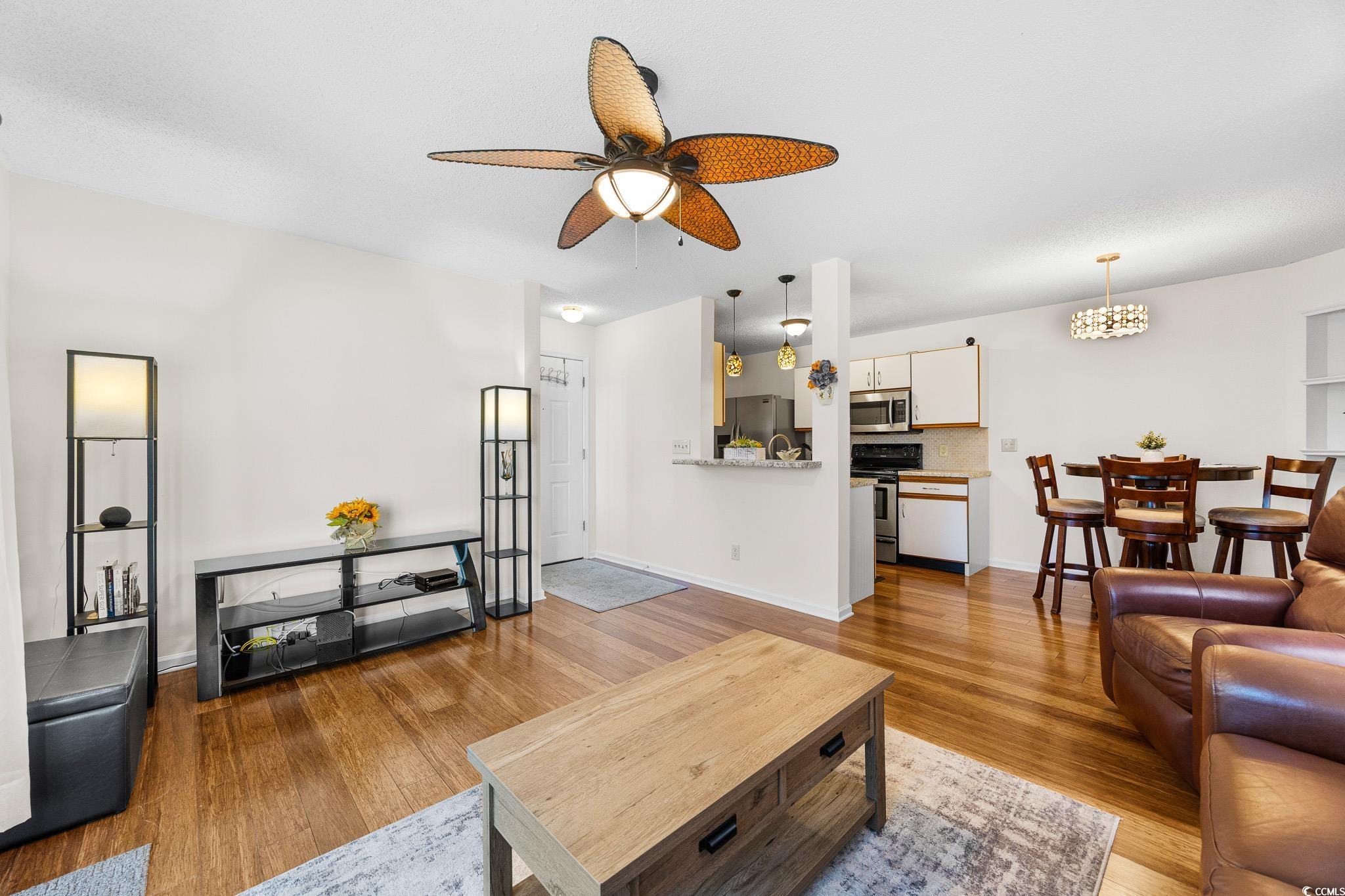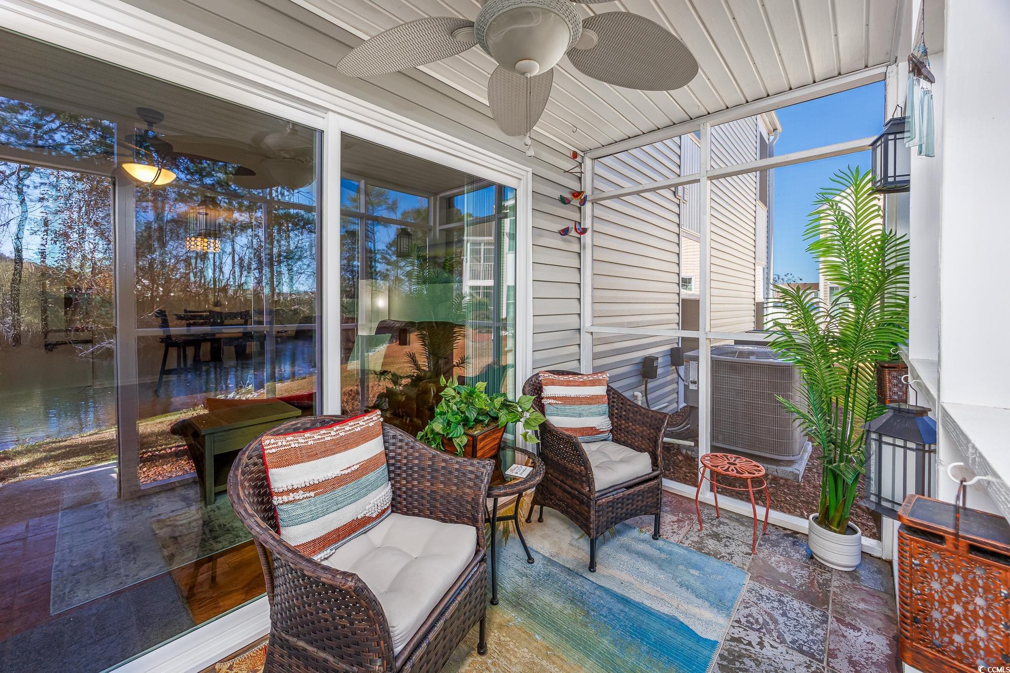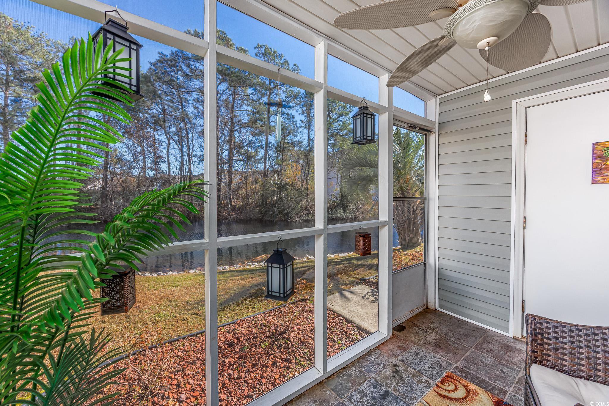 FIRST FLOOR, GROUND LEVEL, with TRANQUIL POND VIEWS from the SCREENED PORCH. Two miles to Surfside Beach city limits, 2 miles to Surfside Pier, and less than one mile to a major grocery store and retail complex. Enjoy two community pools, including the island pool, a clubhouse and well maintained grounds with an observation deck over the main lake. HVAC was replaced in 2024, as well as the sliding doors to the porch, and the home has been freshly painted. The kitchen is fully equipped with a stainless steel fridge and range, dishwasher, double sink, and dinette area. Washer and dryer are included. The screened rear porch features an outside storage room, tile flooring, and a very comfortable space for viewing nature. South Bay Lakes is conveniently located east of 17 Bypass, with easy access to the airport, beach, dining, the famous Murrells Inlet Marsh Walk, Huntington Beach State Park, Brookgreen Gardens and more.