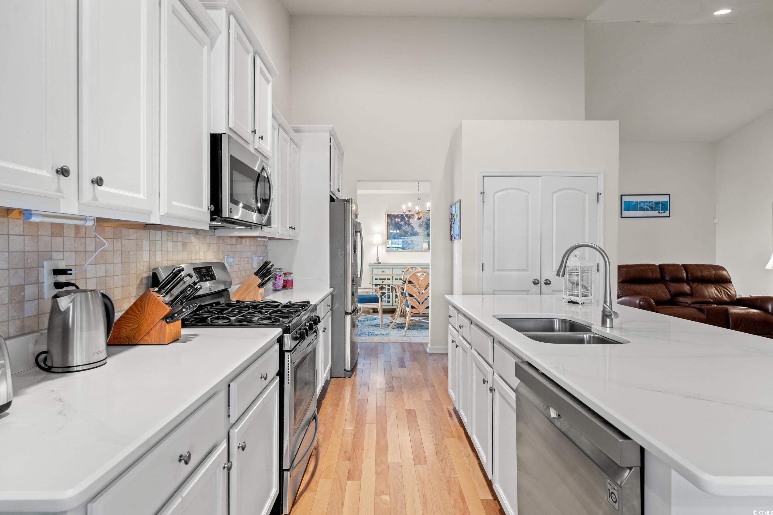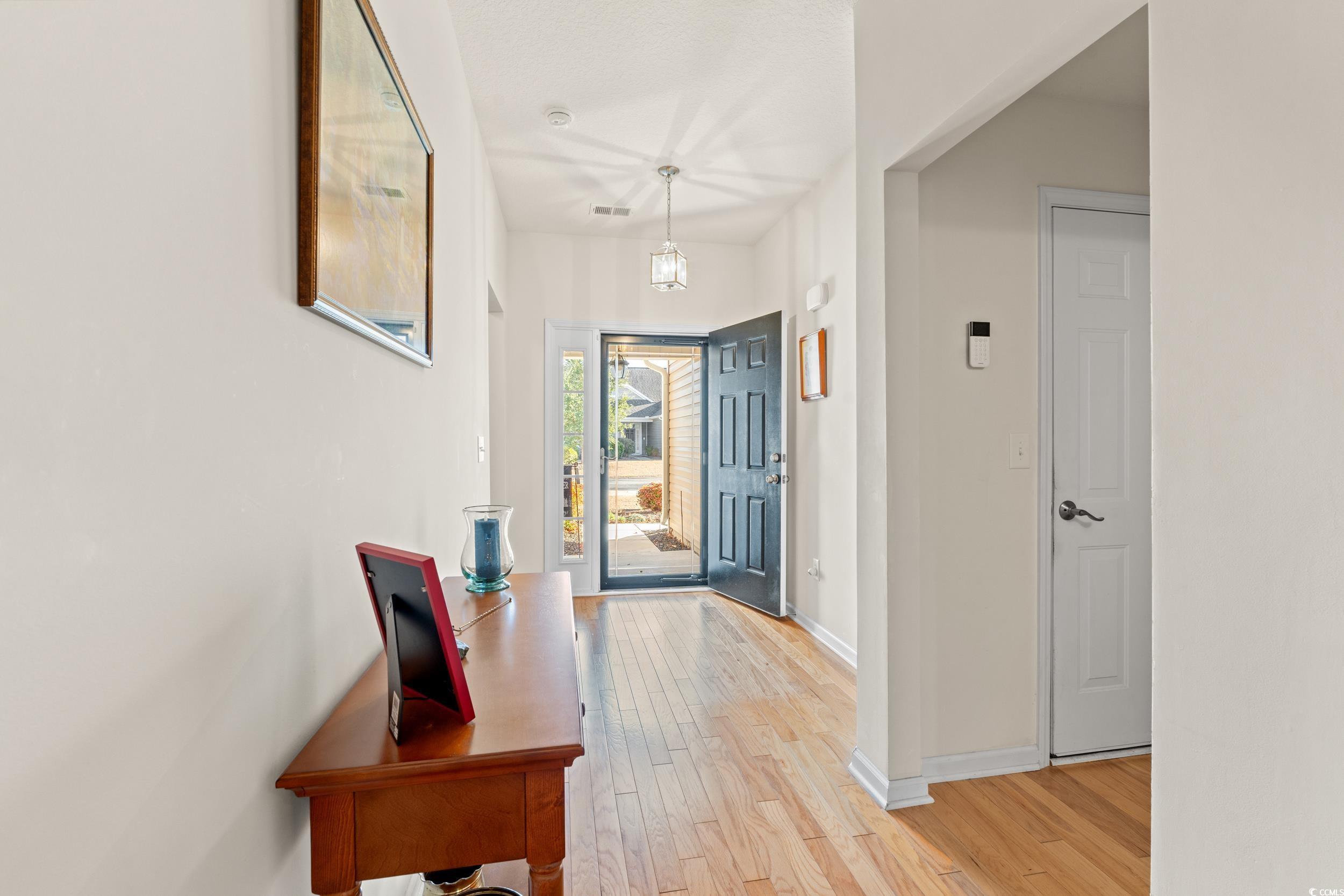 Beautiful pond view and thoughtfully designed single-story layout make this Okatie plan in Glenmoor off of Hwy 90 a must-see. The home features a spacious split-bedroom floor plan, a large owner's suite with a huge walk-in closet, and an upgraded bath with a dual sink raised height vanity and large walk-in tile shower. The kitchen offers white cabinetry, quartz countertops, tile backsplash, a breakfast nook, and all appliances convey. Wood flooring extends through the main living areas, and a covered patio was converted into a Carolina room for additional space and natural light. There is access to the back patio and yard for outdoor enjoyment. A laundry sink is located in the laundry room for added convenience. The home also includes mature landscaping, an irrigation system, a built-in pest control system, whole house generator, and natural gas for the water heater, stove, dual HVAC system, and grill. Regular maintenance on HVAC every 6 months. The community has a clubhouse and pool for your enjoyment. Monthly HOA fees include trash pick up and internet. Located with easy access to Hwy 22 and International Drive for a quick trip to Myrtle Beach, and just 10 miles to downtown Conway via Hwy 90.
