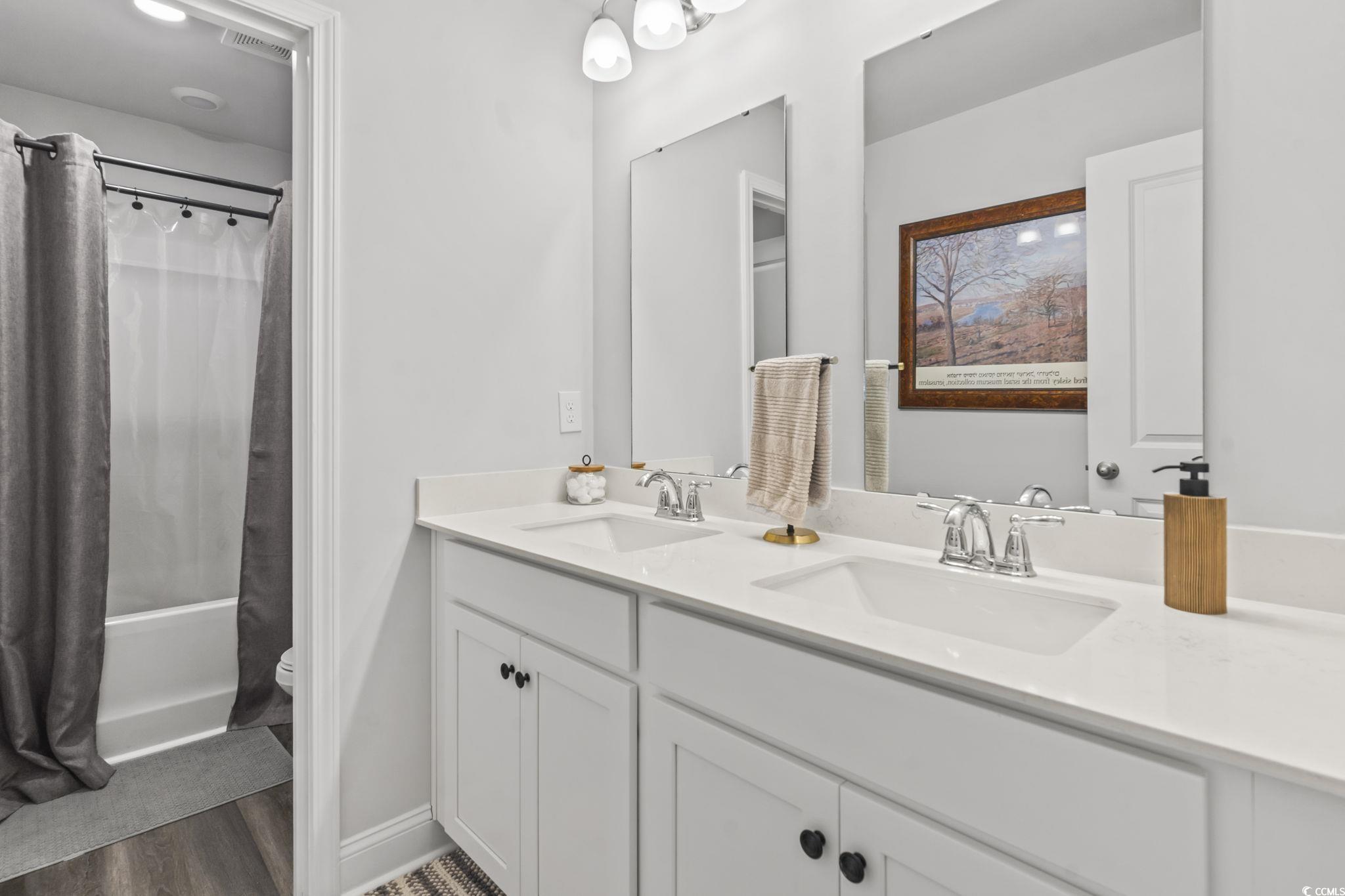 This expansive two-story residence, a practically brand-new Harbor Oaks model just one year old, offers all you desire! Featuring an open-concept great room and kitchen, it provides ample space for entertaining. The kitchen boasts quartz countertops, a large island with a breakfast bar, stainless steel appliances, and a huge walk-in pantry. Outside the pantry is the butlers pantry taking you into the formal dining room. Sliding glass doors from the breakfast area lead to the covered porch, ensuring a smooth flow between indoor and outdoor living. The first-floor bedroom is a cozy spot for visiting guests and further walking takes you onto the extended concrete patio. The owner's suite serves as a perfect retreat at the end of the day, complete with a spacious bathroom featuring double sinks and a 5-foot tiled shower. The second floor includes two additional bedrooms and a generous loft area. This home also includes gutters and a fully fenced backyard. Additionally, it is equipped with Americas Smart Home technology allowing control of the thermostat, front door light, lock, and video doorbell through your smartphone or via voice commands to Alexa. More pictures and Mattersport tour to come!