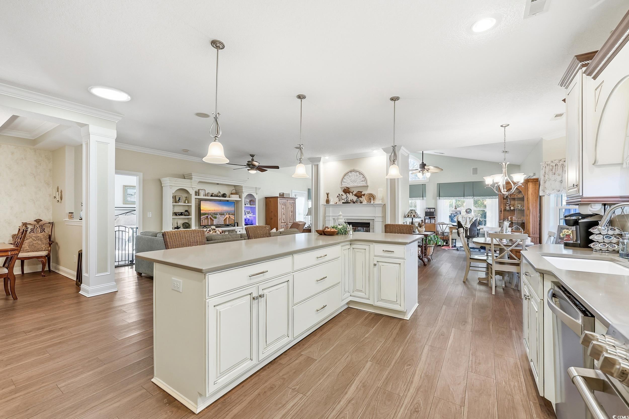 Set within the established Aberdeen Golf community, this all-brick four-bedroom, three-bath residence offers refined design, thoughtful upgrades, and a layout that balances everyday comfort with elevated living. From the moment you enter, the home makes a strong first impression with a tray ceiling in the foyer and crown molding that continues throughout, setting a polished tone carried through every space. The front sitting room is ideal as a home office or quiet retreat and it features an eye-catching octagon-shaped coffered ceiling, while the formal dining room is enhanced with its own coffered detailing and chandelier, creating a sense of architectural depth and distinction. Throughout the home, Levolor blinds provide a clean, tailored finish on every window, and natural light flows easily through the open layout. At the center of the home, the kitchen is designed for both function and presence, featuring staggered custom cabinetry, a large L-shaped island, solid-surface countertops, and stainless steel appliances, including a gas double-oven 6 burner GE Caf range. Whether preparing meals or entertaining, the space connects seamlessly to the living room and Carolina room, where views of the pond draw your attention outdoors. Outdoor living is thoughtfully designed with two separate rear patio spaces, one on each side of the home that are both accessible from the Carolina room and positioned to capture warm afternoon sunlight or there left and peaceful pond views on the right. These spaces provide flexibility for relaxing, dining, or hosting, all framed by a whole-house exterior irrigation system that maintains the landscaped setting. The primary suite offers a private retreat with a tray ceiling, generous his and hers walk-in closet, and a well-appointed bath featuring dual vanities and a walk-in shower with built-in jets. A main-level guest bath also includes a tiled walk-in shower, providing comfort and convenience for visitors. Upstairs, additional bedrooms, a full bath, a loft, and a spacious bonus room allow the home to adapt to a variety of lifestyles and needs. Additional highlights include an oversized two-car garage with the ability to park a golf cart, a heated and cooled enclosed attached storage room on the side of the home that's ideal for storage of lawn equipment, hobbies, or seasonal use and the durability and timeless appeal of full brick construction. Located within a scenic golf community known for its preserved natural surroundings, this home also offers convenient access to beaches, dining, shopping, entertainment, and everyday essentials. The result is a residence that feels both refined and livable, offering a lifestyle defined by quality, comfort, and thoughtful design.