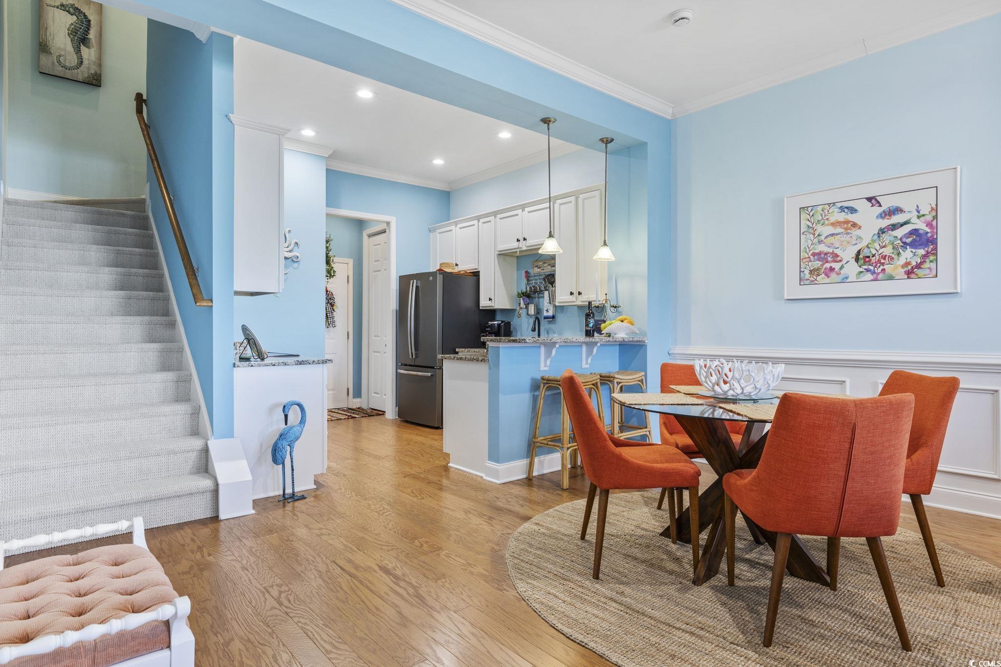 Beautiful townhome with GARAGE in the heart of Market Common. This centrally located property includes heavy duty/ceiling mounted shelving in garage, custom hurricane shutters and stainless appliances and granite countertops in the kitchen along with breakfast bar and pantry. Beautifully remodeled half bath downstairs. Enjoy relaxing on the wonderful front porch with composite decking, sun/wind shades and vinyl railing. Recent upgrades: new recessed lighting, butcher block countertops and cabinets added in laundry, upstairs carpet has been removed and replaced with wide-plank LVP flooring, LVP also installed in master closet, half bath with new vanity and mirror and fresh paint throughout ! Large master suite with abundance of natural light and a master bath featuring double sink vanity, shower and separate garden tub as well as large walk-in closet. Community amenities include pool, gym, lazy river and hot tub. This amazing townhome is less than a mile from the beach and an easy stroll to the many attractions that Market Common has to offer. A must see !