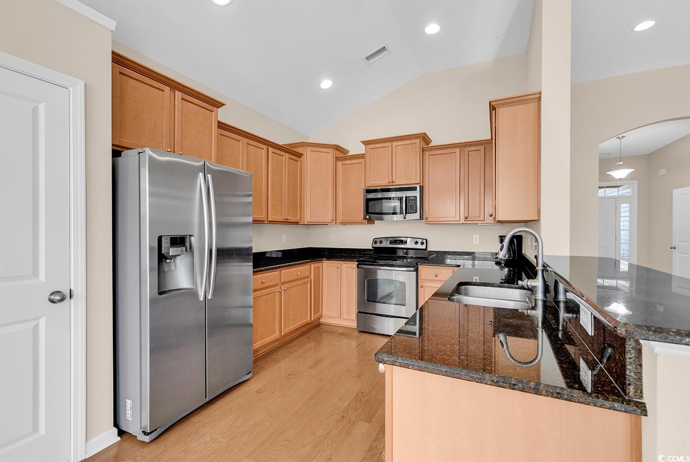 Welcome to 1612 Fairforest Ct, nestled in the desirable Jessica Lakes community of Conway, SC. Set along a sidewalk-lined street, this beautifully maintained single-level home offers exceptional curb appeal with charming brick accents and attractive landscaping. Step inside through the inviting front entry with transom window and sidelights, immediately showcasing the homes bright and welcoming atmosphere and abundance of natural light. This open-concept residence features a 3-bedroom, 2-bath split-bedroom floor plan that offers both privacy and an open, inviting feel. The expansive foyer leads through an arched entryway into the great room, highlighted by vaulted ceilings and recessed lighting, and opens seamlessly to the kitchen and dining area overlooking the semi-private backyardideal for everyday living and entertaining. Beautiful wood flooring flows throughout the foyer, hallways, great room, kitchen, and dining area. The open kitchen is both stylish and functional, featuring granite countertops, stainless steel appliances, ample cabinetry and counter space, a pantry, and a breakfast bar, and flows effortlessly into the dining area. The dining space offers a large double window and sliding glass doors leading to the covered rear porch and patio, perfect for indoor-outdoor enjoyment. The backyard, bordered by mature trees, provides a peaceful setting for relaxing or hosting gatherings, and the property includes irrigation. The spacious owners suite serves as a private retreat with a tray ceiling, ceiling fan, multiple windows, and direct access to the backyard patio. The large en-suite bath includes ceramic tile flooring, a dual-sink vanity, garden tub with window above, walk-in shower, water closet, and a generous double-door walk-in closet. Two additional bedrooms feature carpeted floors, ceiling fans, and ample closet space, with the front bedroom also boasting a vaulted ceiling. The guest bathroom offers ceramic tile flooring, a vanity, and a tub/shower combination. Additional highlights include a linen closet, coat/storage closet, laundry room with overhead cabinetry, security system, new wood 2 blinds, and fresh interior paint. All appliances, including the washer and dryer, convey. The double garage features epoxy floors, pull-down attic stairs with storage access, organizational hooks, ample cabinetry, and a main water shut-off valve, providing both functionality and convenience. Conveniently located near downtown Conway, Coastal Carolina University, shopping, dining, entertainment, and just a short drive to the sandy shores of Myrtle Beach, this move-in-ready home offers the perfect blend of comfort, style, and accessibility. 1612 Fairforest Ct is a must-seeschedule your showing today!