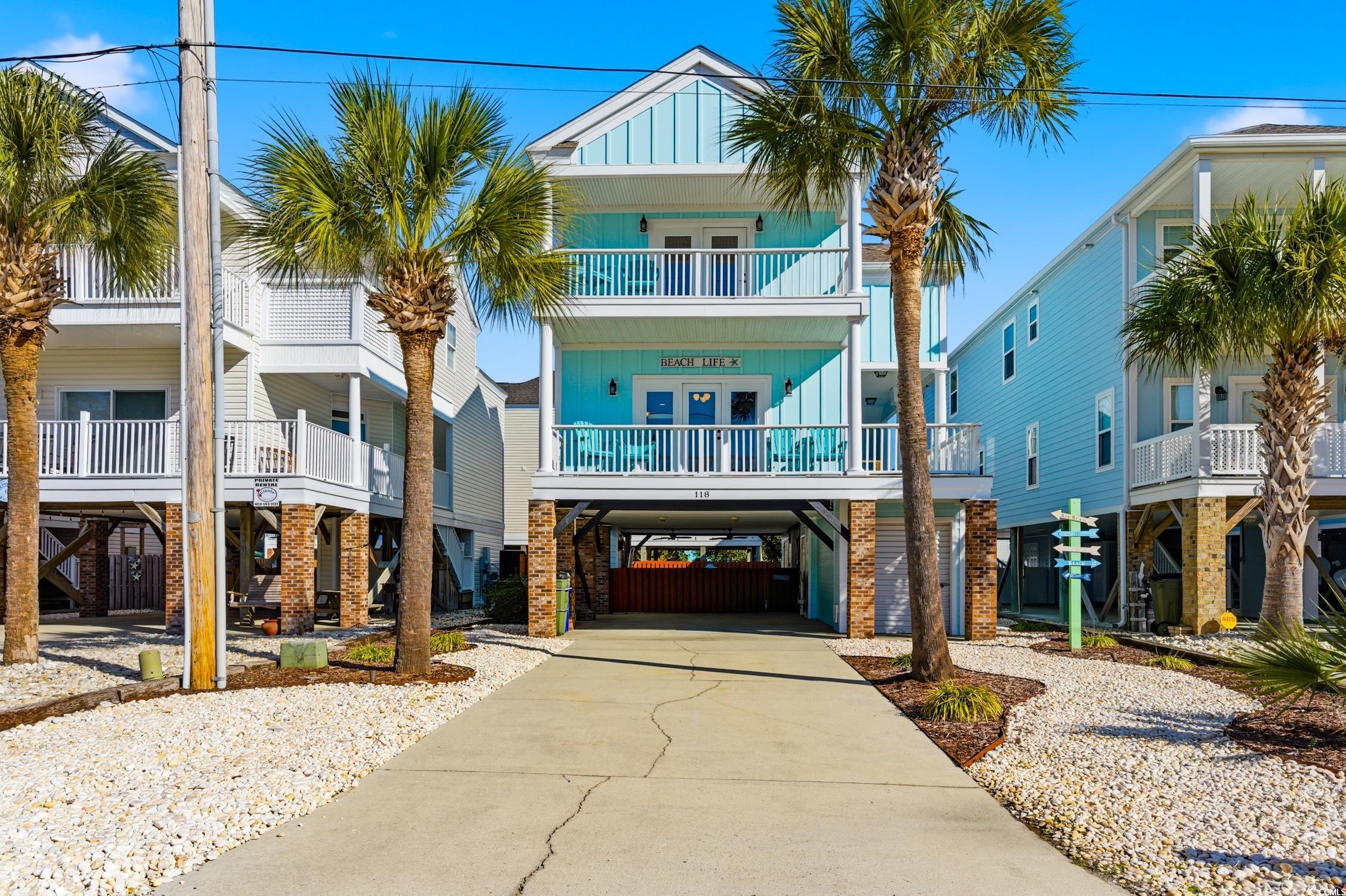 118 8th Avenue S is located just ~524 feet from the beach. This raised-beach single-family home offers a rare blend of flexibility and coastal walkabilitywell-suited for full-time living, second-home use, or short-term rental ownership. The property features two primary suites, a private pool, R3 zoning (short-term rentals permitted), and no HOA, all within the Town of Surfside Beach. Offering approximately 2,025 heated square feet, the home includes 4 bedrooms and 3.5 bathrooms across a thoughtfully designed two-level layout that balances everyday livability with guest privacy. A main-level primary suite supports comfortable primary or second-home use, while the upstairs primary suite features direct access to a private covered balcony with an ocean view, a premium amenity for owners and guests alike. The main living level features 9-foot ceilings and an open living and dining area with abundant natural light, flowing directly to a covered porch for seamless indoor-outdoor living. The kitchen opens to the main living space and features Silestone countertops, slate-finished stainless steel appliances, a breakfast bar, and ceramic tile and engineered bamboo flooring. The home conveys unfurnished, allowing buyers to tailor furnishings and design to their preferred lifestyle or rental strategy. Upstairs, vaulted ceilings enhance the sense of space, while additional bedrooms and bathrooms are arranged to accommodate family or guests while maintaining privacy comfortably. Outdoor amenities include a walk-in private pool with recent upgrades, including a heater/cooler, resurfacing, and new lighting, extending usability beyond peak season. A fenced yard with artificial turf, covered ground-level seating areas, and an outdoor shower create a low-maintenance, beach-friendly environment. Elevated construction provides under-house parking, a dedicated golf-cart garage, and generous storage for beach gear, bikes, and owner use. Significant capital improvements completed since March 2021 include a full exterior renovation with HardiPlank siding and trim, roof replacement, Carrier HVAC system, window and gutter updates, porch improvements, and multiple pool system upgradesdelivering predictable ownership with reduced near-term capital exposure. The home provides walkable or golf-cart access to Surfside Pier, the entertainment district, grocery stores, restaurants, parks, tennis and bocce courts, the library, and the seasonal farmers market. Myrtle Beach is approximately 20 minutes away, with Charleston and Wilmington each within two hours. Be sure to view the walking tour and immersive Matterport 3D Virtual Tour: www.bit.ly/1188thAveS