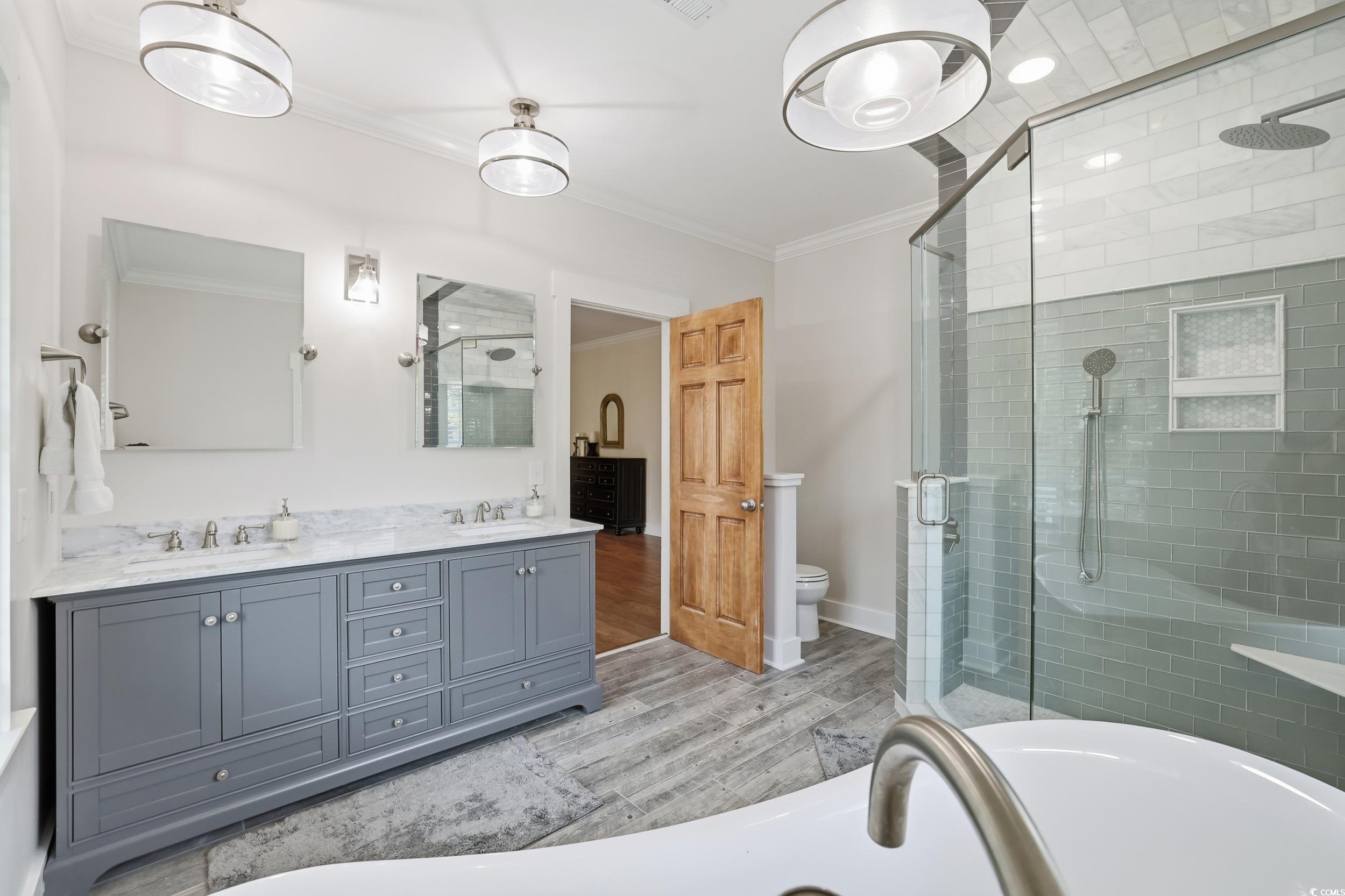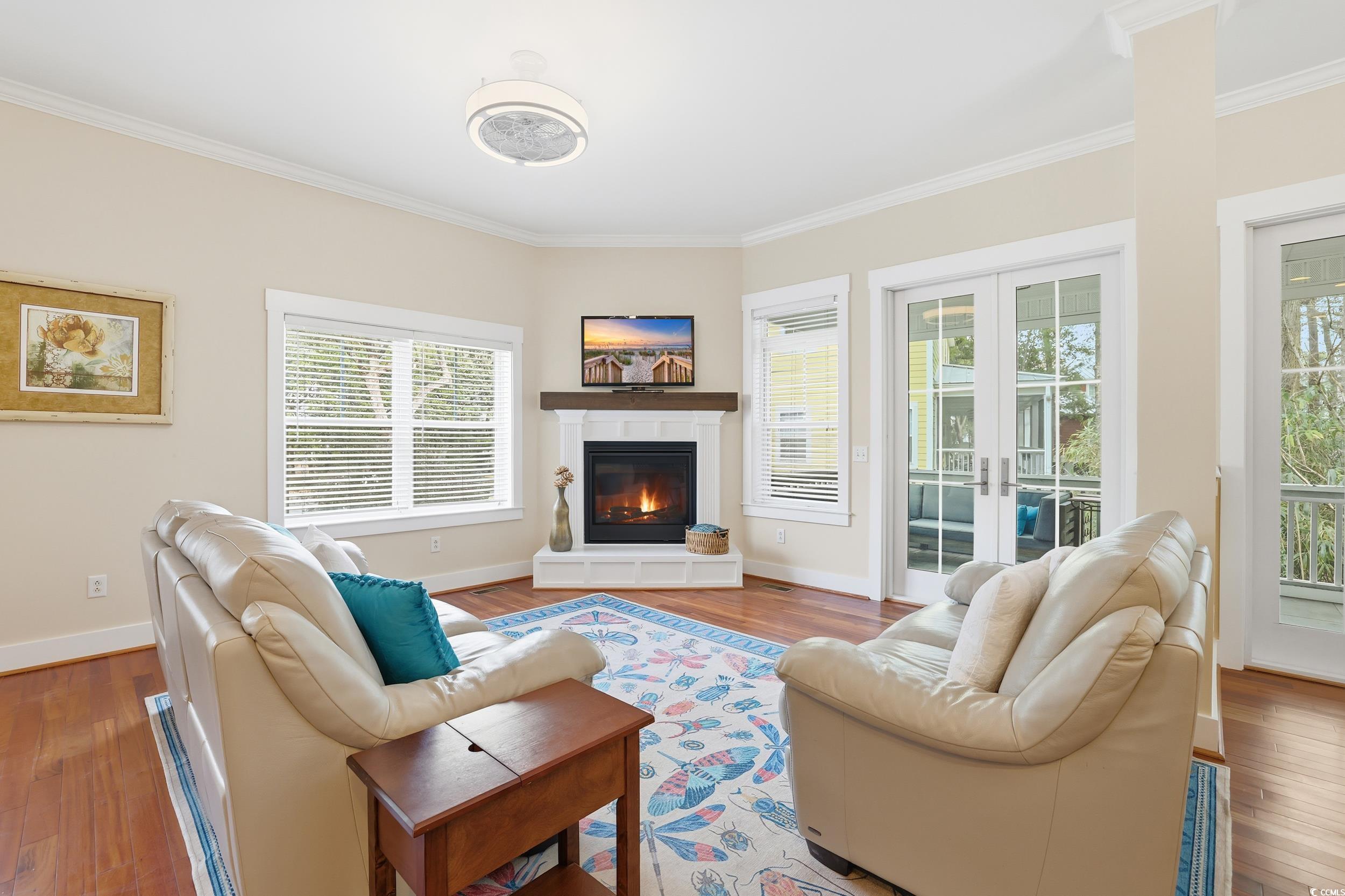 49 Schooner Ct. in Waccamaw Trace at North Litchfield Beach invites you to live the coastal lifestyle fully furnished, move-in ready, and beautifully refreshed throughout. Unpack your bags, settle in, and start enjoying beach life from day one. Start your mornings on the front porch, coffee in hand, as the sun rises over the marsh. End your evenings there with dinner while the sky turns soft shades of pink and gold. The balcony off the second-floor primary suite offers a quiet retreat for reading, reflection, or simply taking in the view. Set within a welcoming community where bikes and golf carts are part of daily life, everything feels close and easy. Step inside and notice freshly painted interiors, soaring ceilings, and gleaming hardwood floors that catch the light from every window. Hurricane-grade French doors in the living room, dining room, and upstairs primary suite flood the home with natural light while providing storm-ready peace of mind. New ceiling fans throughout keep the air moving in every season. The first-floor blends living, dining, and kitchen areas into an open, welcoming space anchored by an updated gas fireplace the perfect gathering spot. The primary suite on this level features rich Brazilian cherry hardwood floors and a newly renovated spa-inspired bathroom. A half bath and laundry room complete this floor. Upstairs, the second primary suite boasts its own renovated bathroom and a boutique-style custom closet with generous hanging space, plentiful drawers, and a built-in hamper. Durable, mop-safe luxury vinyl plank flooring on the stairs and throughout this level handles sandy feet with ease. A jack-and-jill bedroom and bath, plus a second laundry area, provide flexibility for family and guests. The third floor opens into a large living area with a bonus room and half bath ready to become an office, game room, theatre, or additional bedrooms with endless possibilities. Every detail is designed for comfort and ease: fully furnished and turnkey, an on-demand water heater for endless hot showers, a Wi-Fi-enabled garage door for smart access, a security system, lawn irrigation, a durable metal roof, and enclosed parking beneath. The home is elevator-ready. Location brings it all together. A short bike ride or golf cart trip takes you to the wide sands of North Litchfield Beach, the Waccamaw Neck bike trail, or the community pool. Historic Charleston is close enough for a day trip, and Myrtle Beach's restaurants, entertainment, and attractions are just minutes away. At 49 Schooner Ct., every day starts with sunrise walks, ends with evenings on the porch, and overflows with the freedom to explore, relax, and enjoy life along the coast.