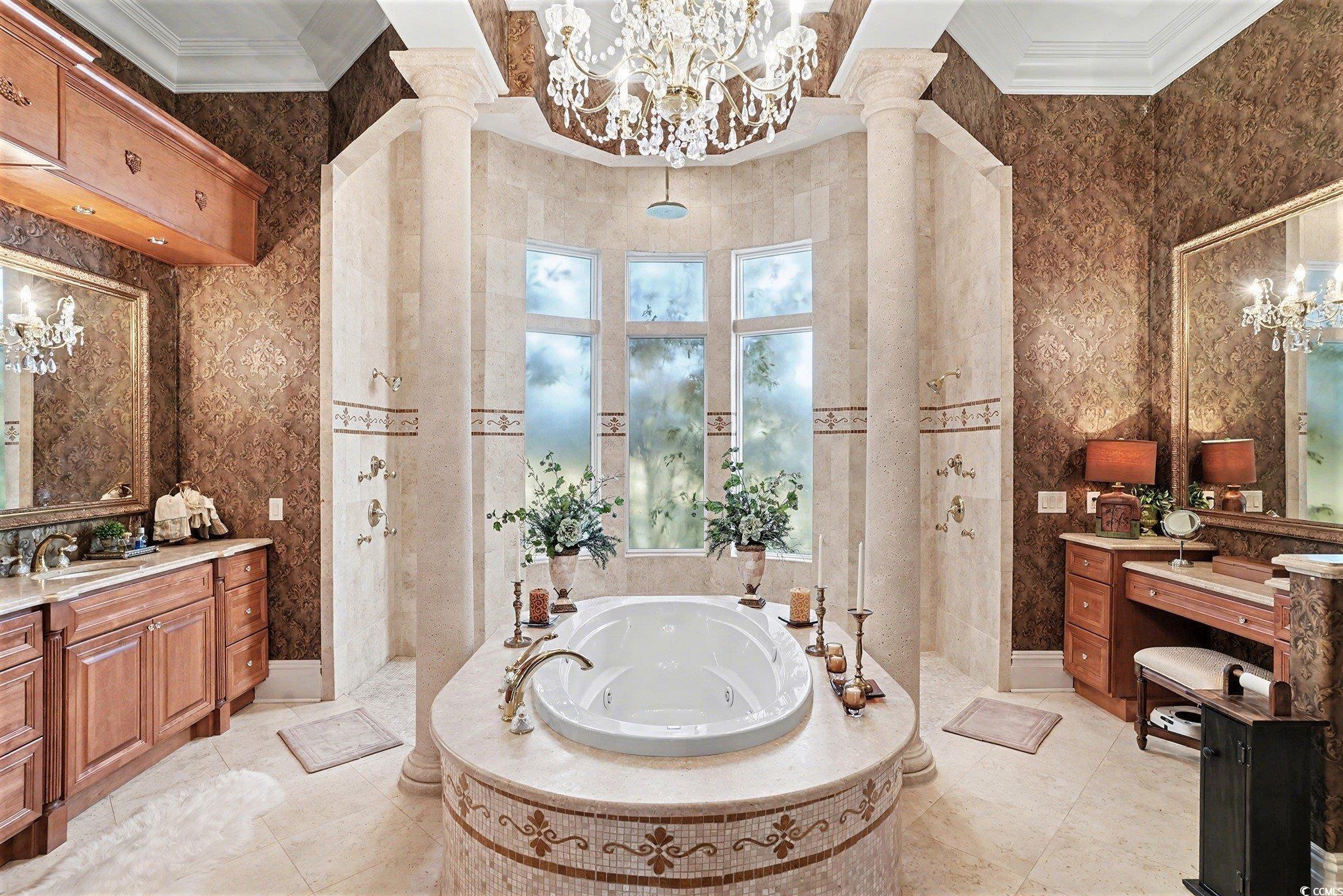 PrimaryBathroom: DualSinks, GardenTubRomanTub, SeparateShower, Vanity, VaultedCeilings