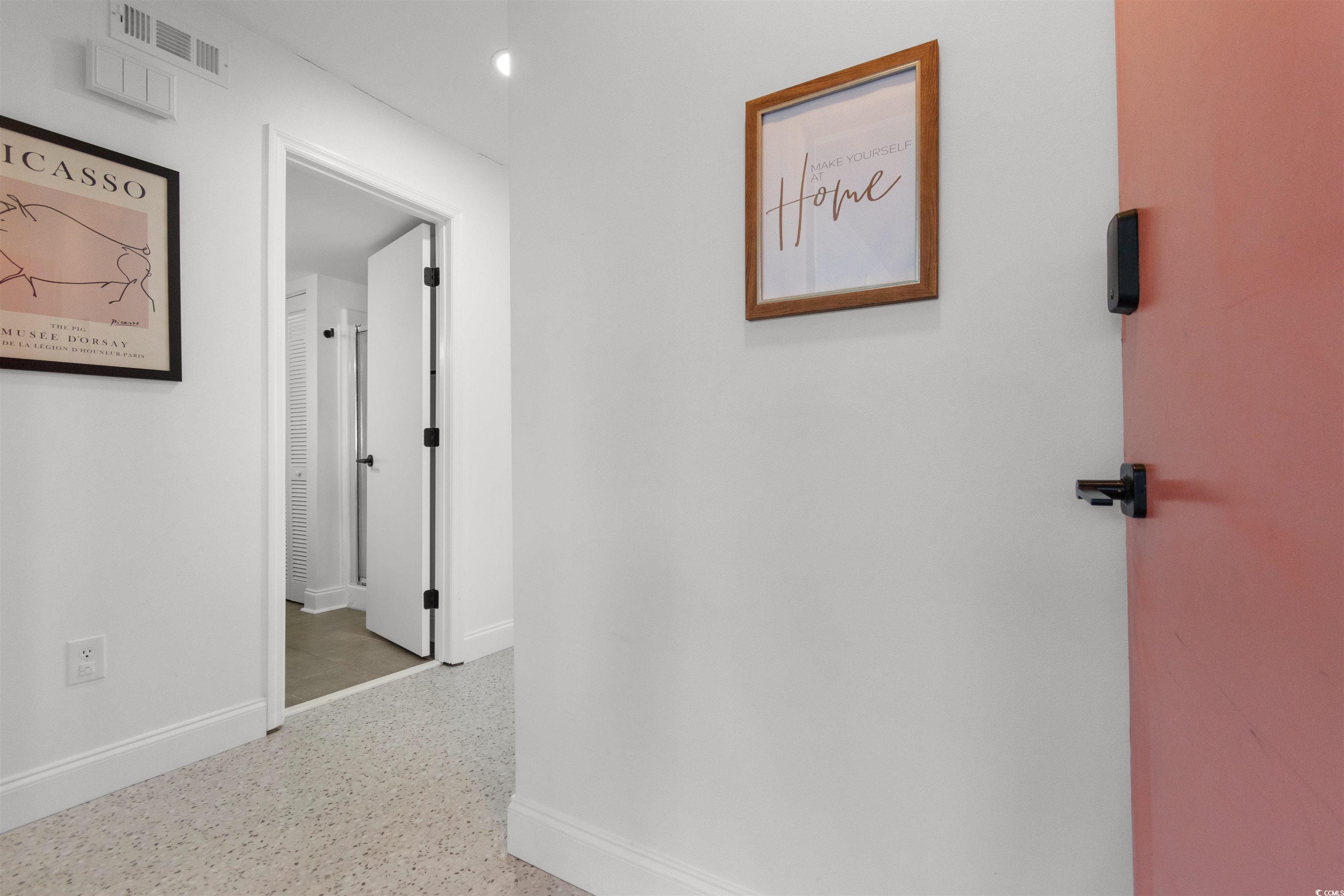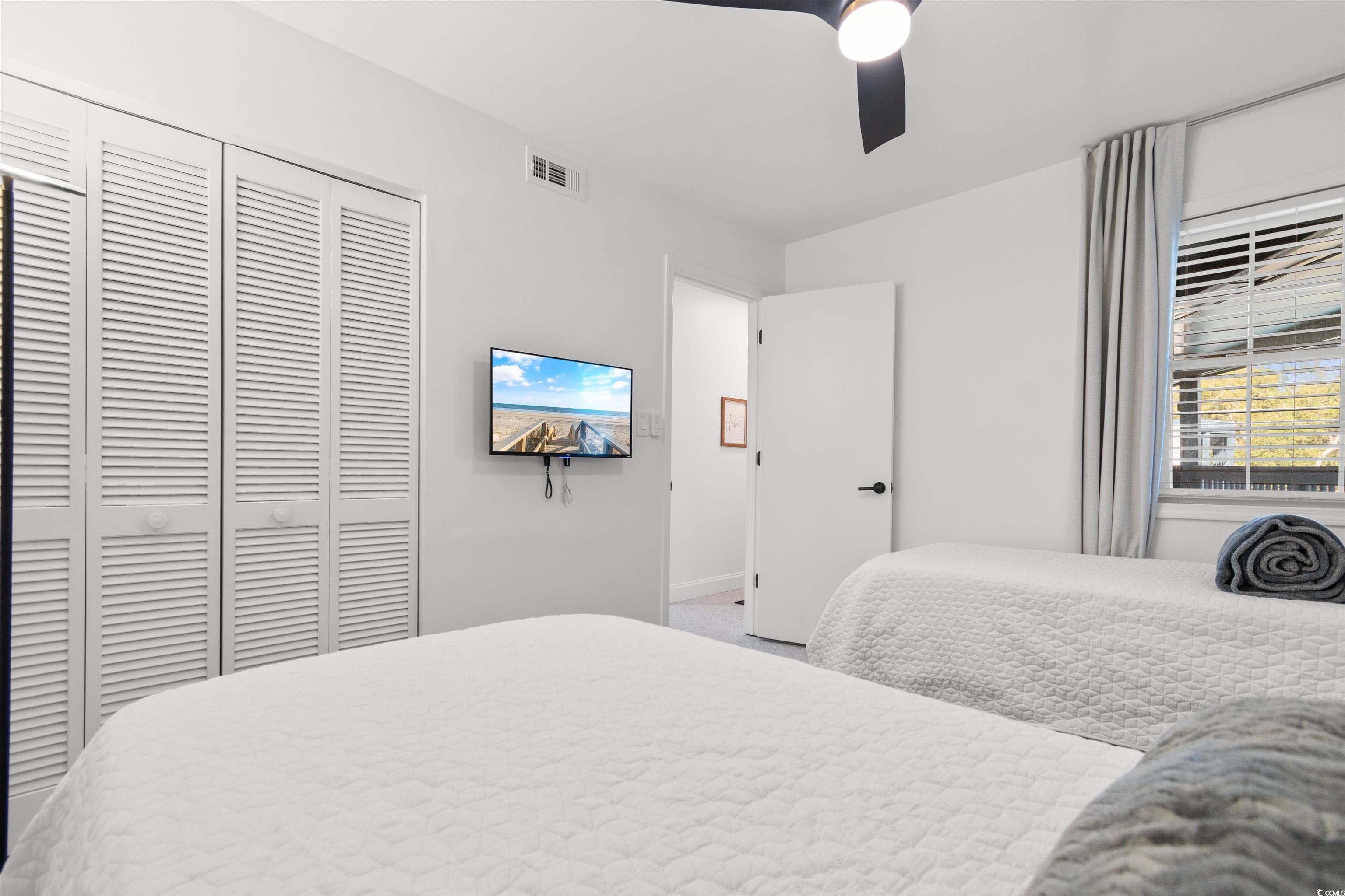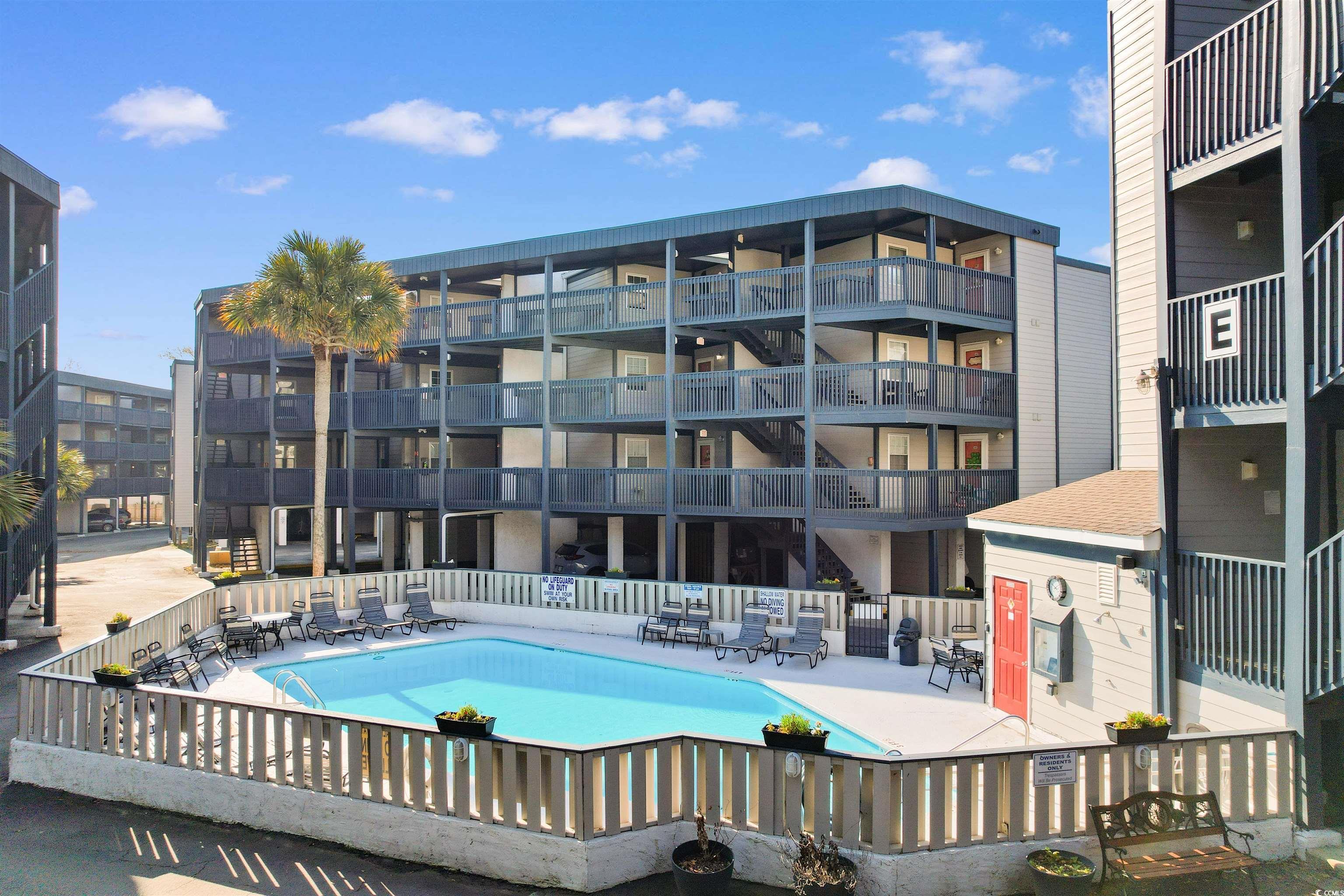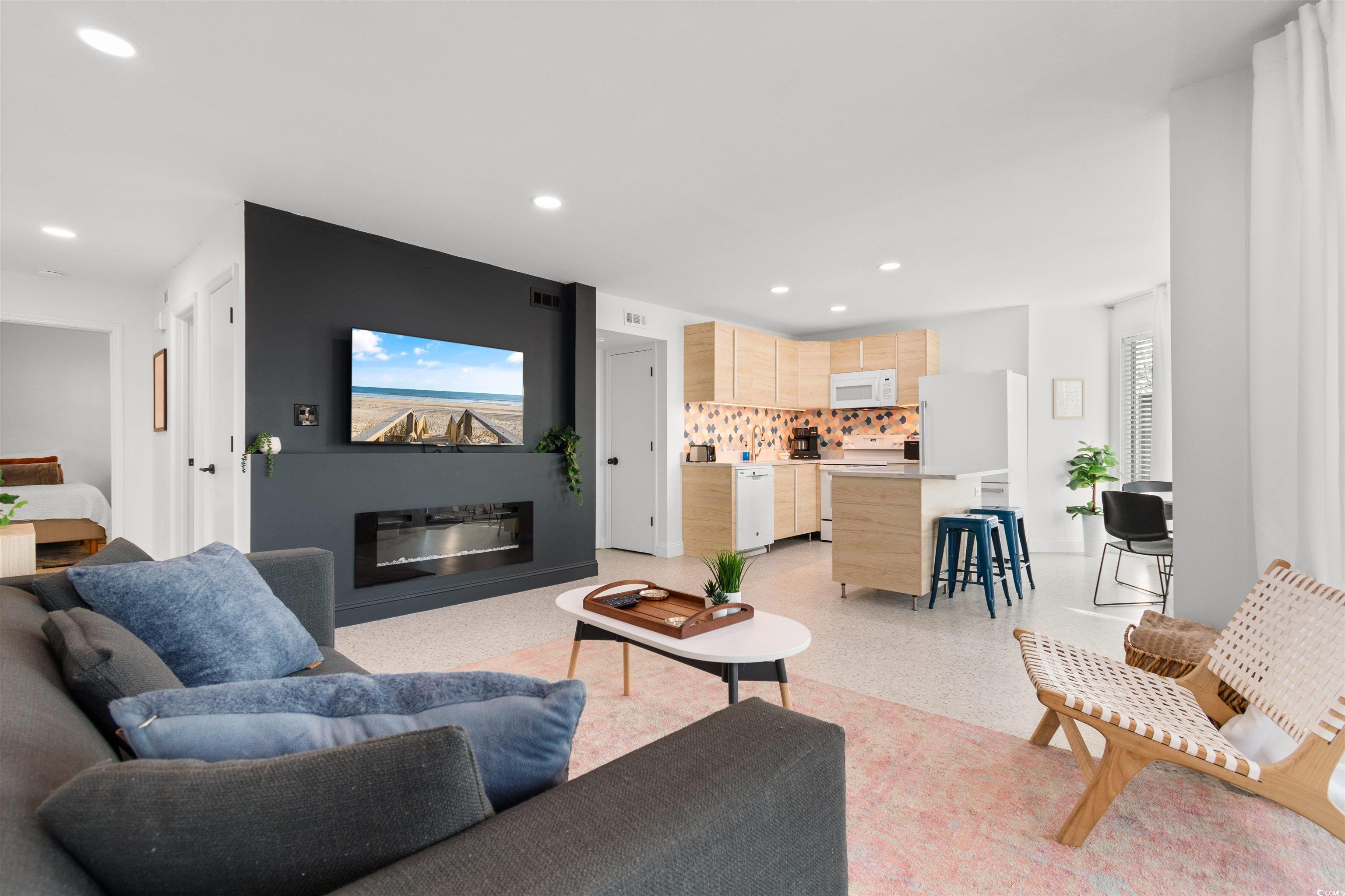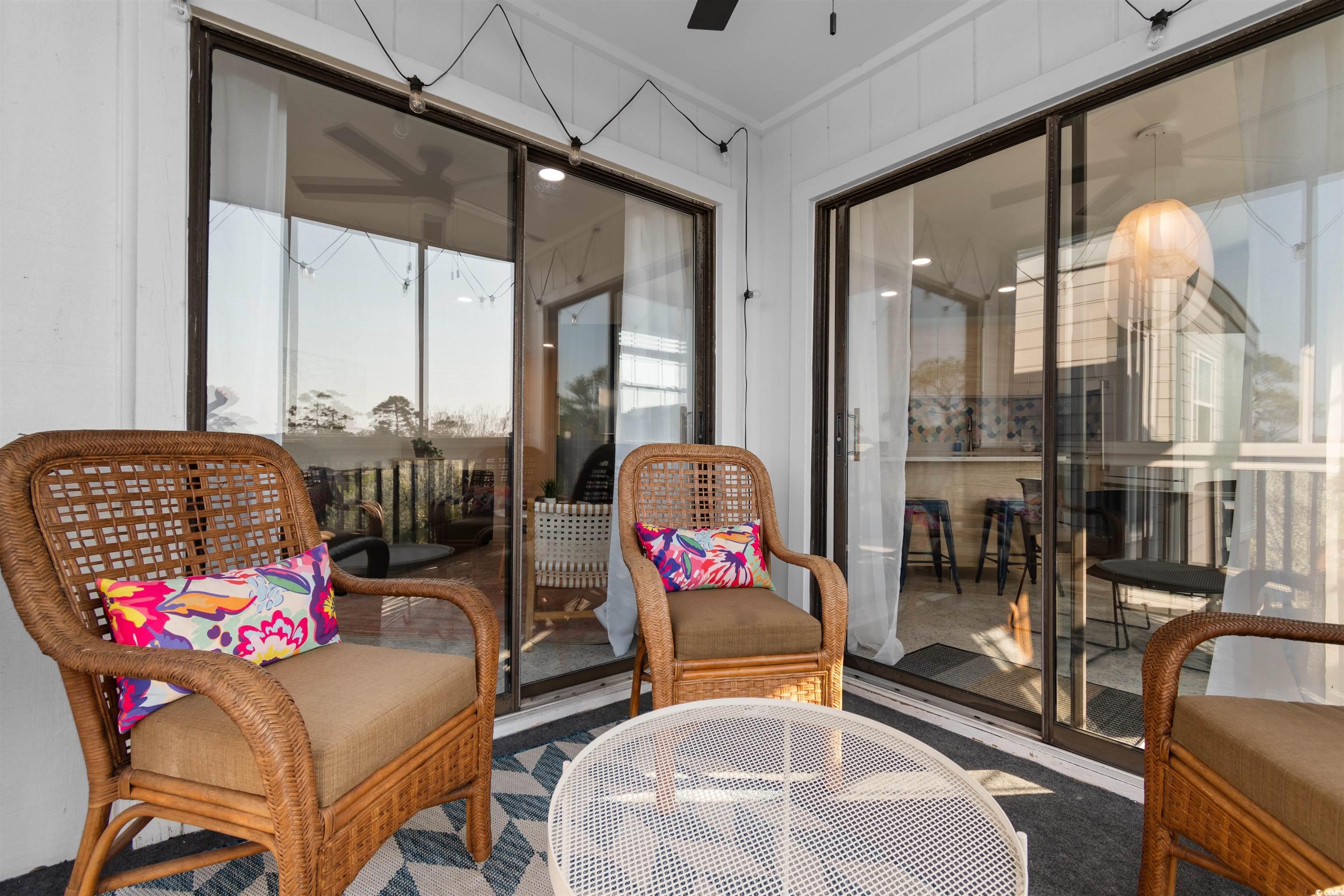 Just one mile from the beach, this fully renovated and beautifully furnished top-floor 2-bedroom, 2-bath condo offers easy coastal living in the heart of North Myrtle Beach. Located within city limits with golf carts allowed, and close to shopping, dining, entertainment, and the city recreation center, this move-in-ready home is ideal as a primary residence, second home, or investment property with short-term and long-term rentals allowed. The bright, open interior features uniform flooring throughout with no carpet or popcorn ceilings. The updated kitchen includes modern cabinetry, a stylish backsplash, and a functional island with seating and extra storage. The living and dining areas open to a screened-in porch through sliding glass doors, creating a seamless indoor-outdoor flow. The split-bedroom layout provides privacy, with a primary suite offering a walk-in shower and a comfortable guest bedroom near the second full bath. Additional features include an in-unit washer and dryer, covered parking, and access to a community pool. Thoughtfully renovated and fully furnished, this coastal condo is a turn-key opportunity just minutes from the beach.