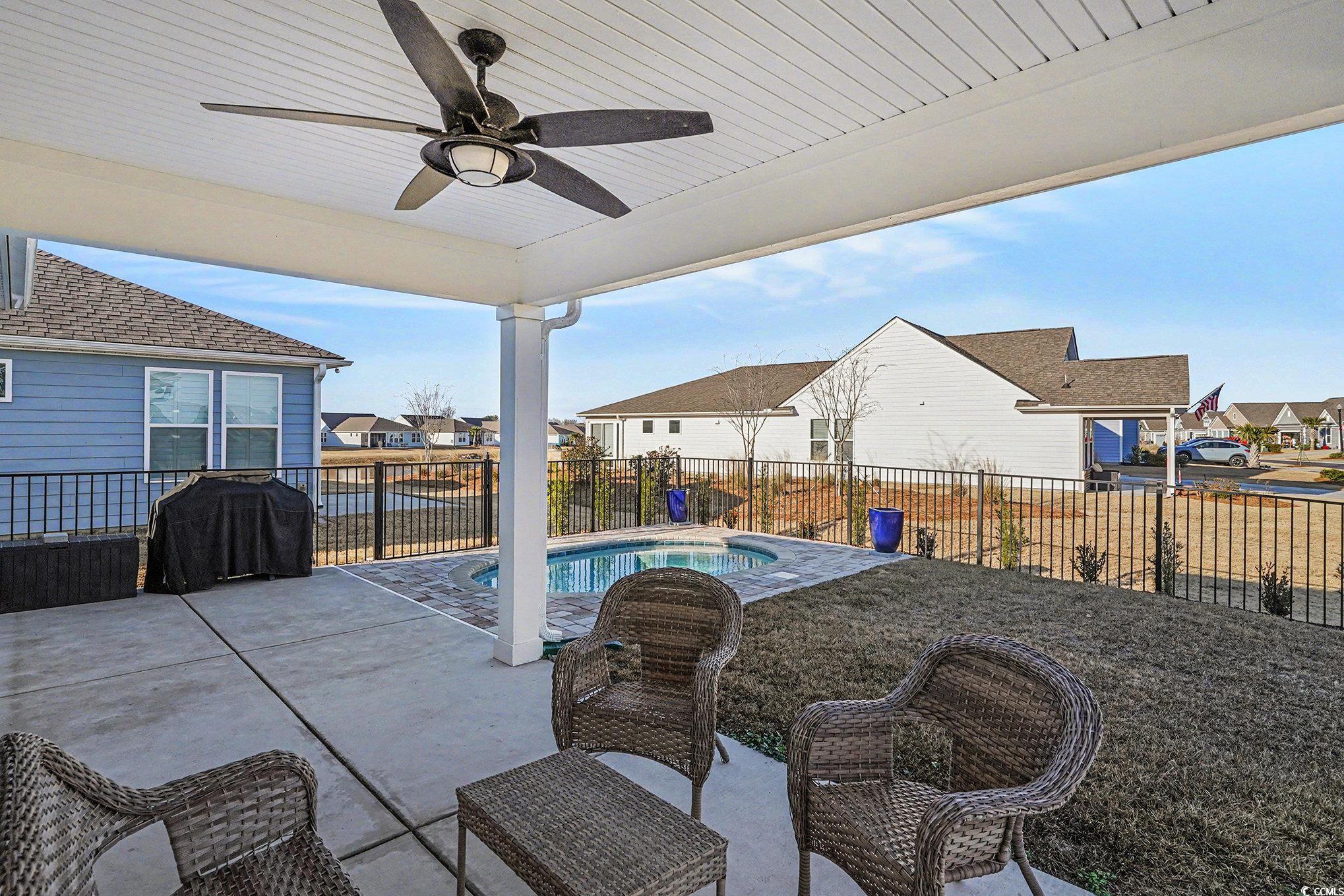 You truly can have it all at Del Webb North Myrtle Beach. Welcome to a beautifully maintained home in one of the areas premier 55+ active adult, golf-cart-friendly communities, where resort-style amenities and a vibrant lifestyle come together to help you live life to the fullest. Del Webb North Myrtle Beach offers an exceptional amenity experience, including a zero-entry resort-style pool, a 12,000-square-foot clubhouse, state-of-the-art fitness center, indoor lap pool, and dedicated craft room. Enjoy friendly competition on the pickleball and bocce courts, practice your short game on the putting green, and stay socially connected with a full calendar of clubs and activities curated by a full-time Lifestyle Director. Now introducing this move-in-ready residence, which is situated on a premium fenced corner lot, is thoughtfully designed with an open-concept floor plan featuring two spacious bedrooms plus a flexible third room, currently utilized as a stylish home office. The heart of the home is the inviting kitchen, complete with granite countertops, integrated appliances, a generous pantry, and bar-height seating that seamlessly connects to the living and dining areas. The primary suite provides a peaceful retreat with a ceiling fan, a private en-suite bathroom that features a tiled walk-in shower and dual sinks. Step outside from the living room to your covered porch, fenced backyard, and private saltwater pool, creating the ideal setting for relaxing or entertaining in your own coastal oasis. For added comfort and convenience, a motorized garage screen keeps the space cool and bug-free, perfect for hobbies or projects. Front yard lawn care, cable TV, high-speed internet, and full access to all community amenities are included in the low monthly HOA fees, allowing for truly carefree living. Enjoy a luxury coastal lifestyle where every detail is designed for comfort, connection, and convenience. Whether youre seeking an active, social community or a peaceful retreat close to the beach, this exceptional home delivers it all in one of North Myrtle Beachs most desirable locations. Schedule your private showing today and start living the Del Webb lifestyle.