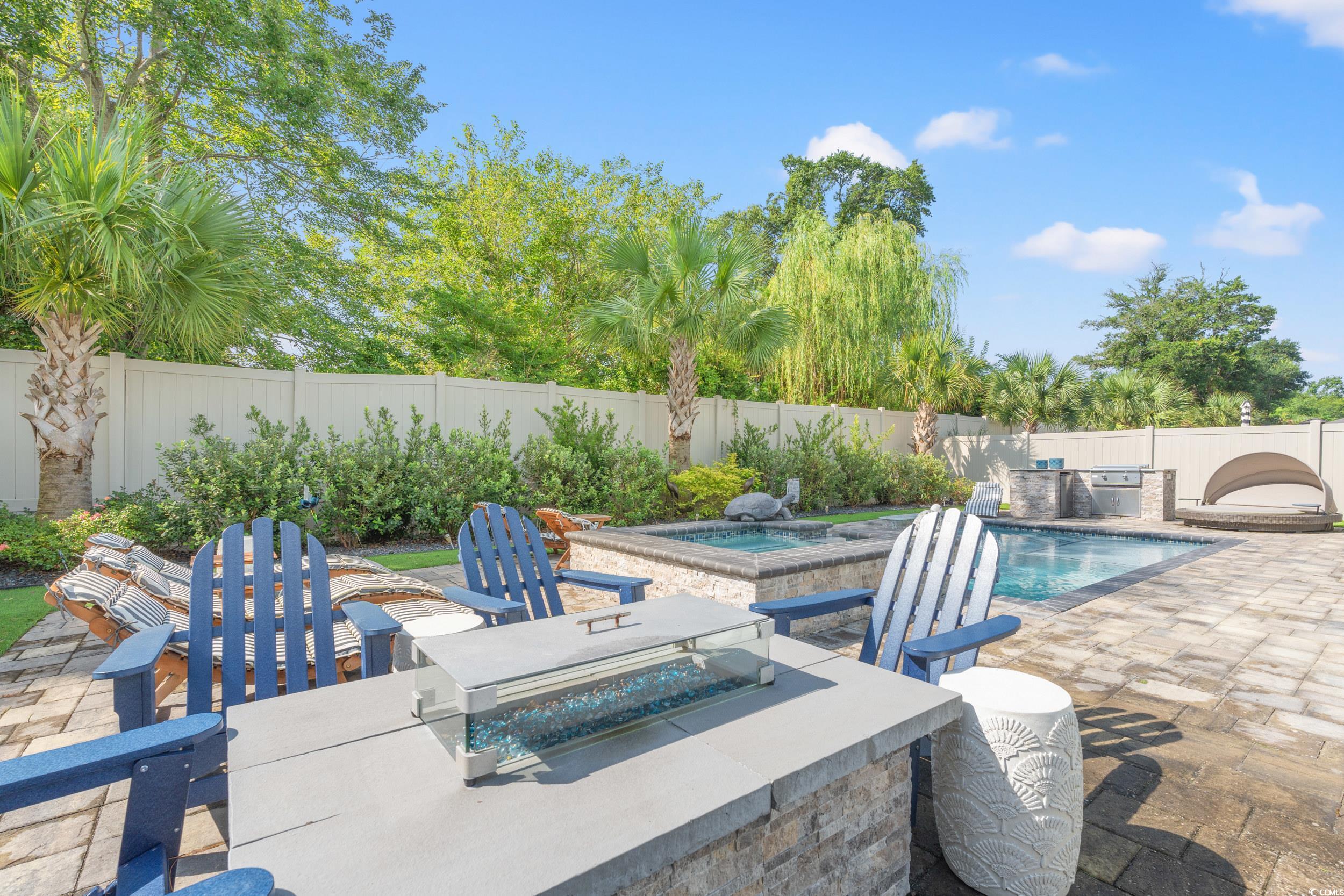 Live like youre on vacation every day in this impressive 5-bedroom, 3-bath furnished home, complete with luxurious finishes and a private backyard retreat. The light-filled living areas with LVP flooring throughout the main spaces, creating a bright and inviting atmosphere. The gourmet kitchen is a true showstopper, featuring a gas cooktop, sleek tile backsplash, granite countertops, and stainless steel appliancesperfect for both everyday living and entertaining. Thoughtful upgrades like crown molding, custom trim, ceiling fans, and custom blinds add charm and character throughout the home. The laundry room is equally impressive, complete with extra cabinetry, granite countertops, and a washer and dryer included for added convenience. A spacious three-car garage provides plenty of storage, while a whole-house generator offers peace of mind year-round. Step outside to your own private backyard oasis. Relax in the heated saltwater pool or hot tub, fire up the grill in the fully equipped outdoor kitchen with a gas line, or gather around the cozy natural gas fire pit. The expansive paver patio, maintenance-free turf, tropical palm trees, river rock accents, and privacy fence create a serene, resort-style escape youll never want to leave. As an added bonus, this home includes a 2023 EZ-Go L6 gas golf cart, perfect for quick trips to the beach or nearby amenities, shopping and resturants.