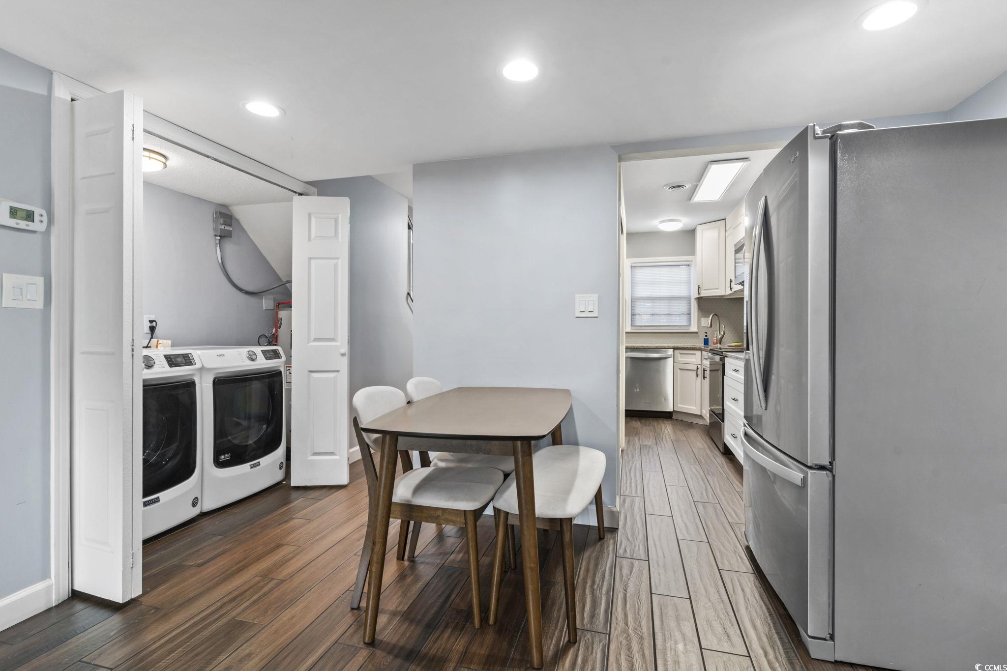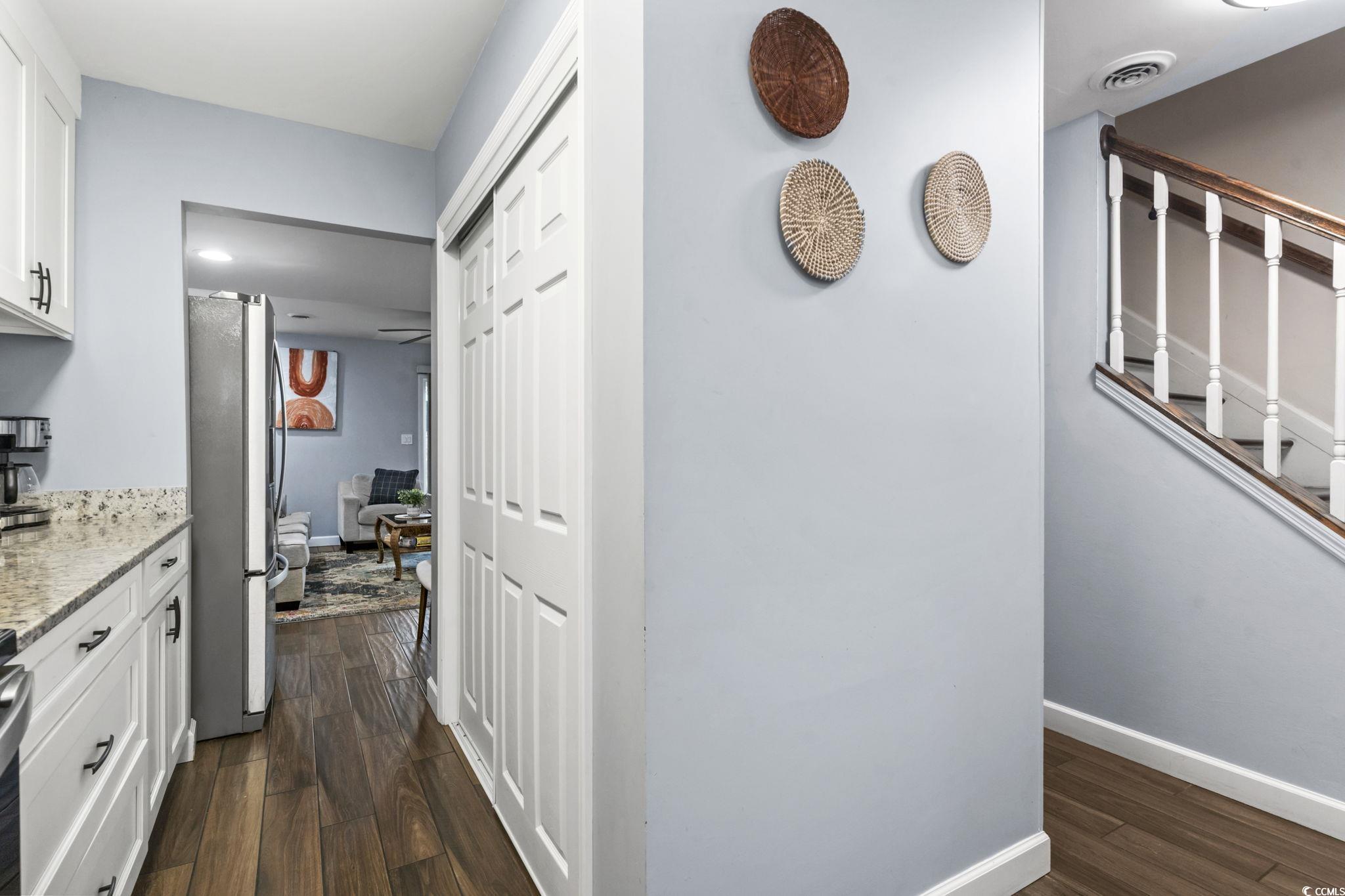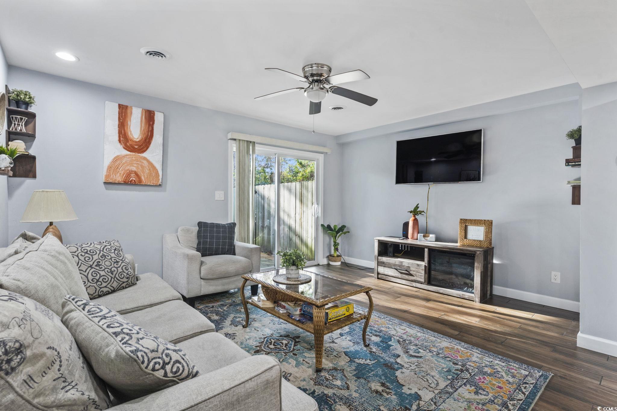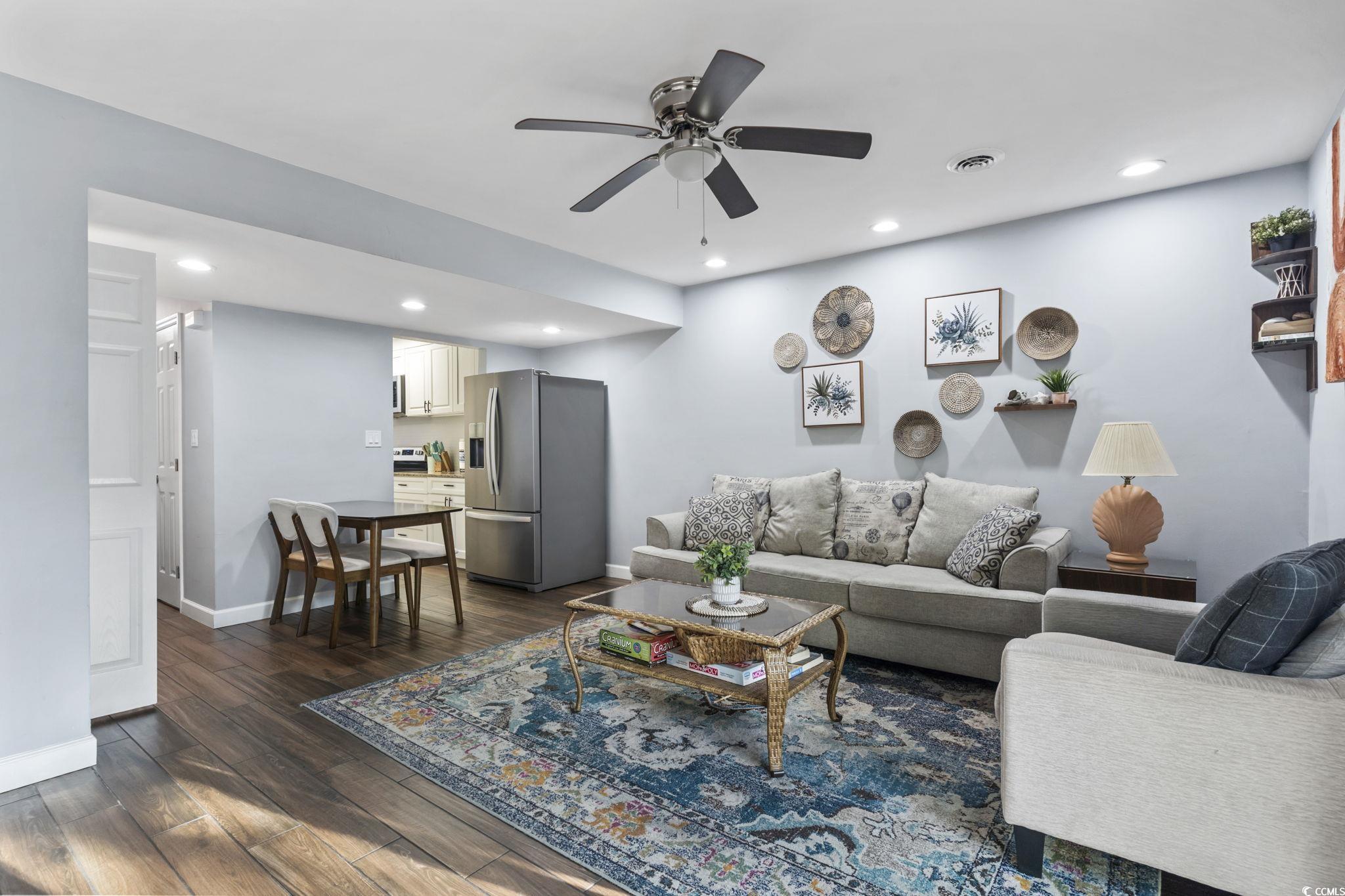 This beautifully updated townhome is sure to impress, with fresh finishes and a welcoming feel throughout. Just 0.2 miles from the beach, the shoreline is an easy six-minute walk away, making this property a true coastal find. The open-concept layout offers seamless flow from the kitchen to the living and dining areas, extending out to a spacious patio through the sliding glass doors. Extensive renovations have been completed throughout the home, including ceramic wood-look tile flooring on the main level, luxury vinyl plank flooring on the stairs and upper level, and new windows in both the kitchen and one of the bedrooms. The kitchen features a modern design with new appliances and a generous pantry, opening into a bright living space enhanced by updated ceilings, recessed lighting, and a new ceiling fan. Near the entryway, you'll find a convenient storage closet, while down the hall is a stylish half bath and a laundry closet with a full-size washer and dryer. Major systems have are also updated, including a newer HVAC unit and hot water heater. All furnishings and appliances will convey with the sale, offering a truly move-in-ready opportunity. Upstairs, the home offers two bedrooms and two beautifully renovated bathrooms, along with an additional hallway closet. An exceptional upgrade compared to similar units that typically feature only one bathroom. The newly fenced patio provides plenty of space for entertaining or relaxing, complete with outdoor furniture, a grill, and a secure storage area ideal for beach gear or owner storage if used as a rental. Whether you are looking for a full-time residence or a beach retreat, this townhome is a wonderful opportunity you won't want to miss.