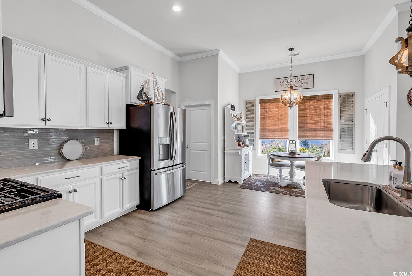 Welcome to Brighton Lakes, a gated natural gas community in the heart of Carolina Forest. This single-level Smart Home offers an open, modern layout with upscale finishes throughout, perfect for families or those who work from home. Features include double glass entry doors, custom lighting, Luxury Vinyl Plank flooring, and a sleek fireplace with interchangeable lighting and shiplap surround. The chef-inspired kitchen boasts quartz countertops, tiled backsplash, and an oversized island. A bright flex space provides ideal home office or bonus room options. The split floor plan places the primary suite privately at the rear, featuring tray ceilings, a spacious walk-in closet, and an oversized tiled shower. Enjoy outdoor living on the screened porch leading to a covered patio and grilling area. Side-load garage with extended driveway offers excellent curb appeal and ample parking. Community amenities include a large center, pool, and kids park. Convenient to shopping, dining, hospitals, and miles of walking paths.