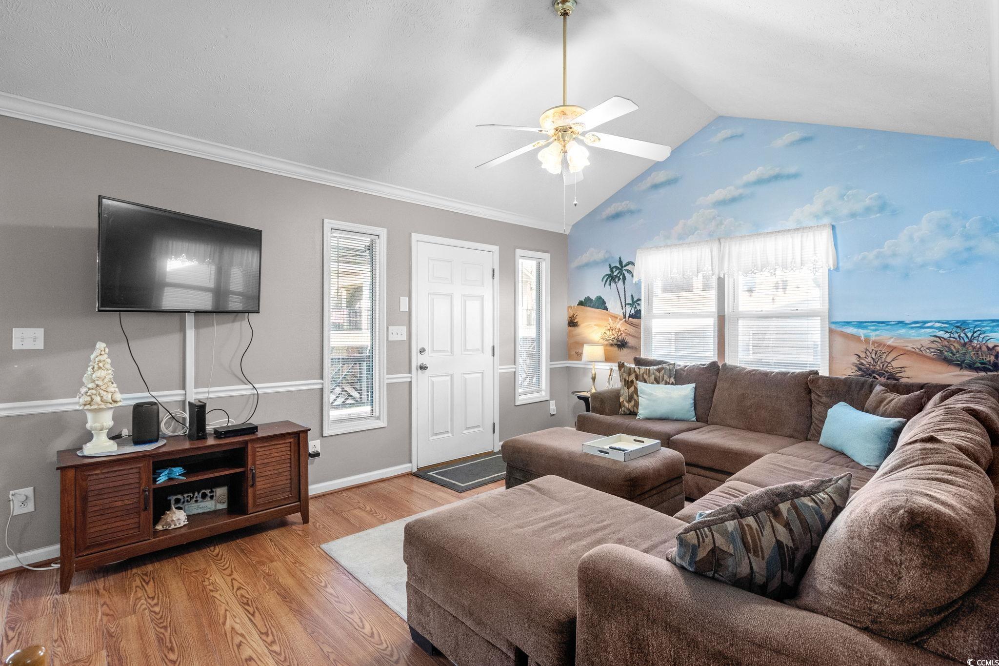 Clean and inviting 2BR/2BA beach home located in the highly desirable Ocean Lakes Family Campground. This home comes fully furnished and features a spacious porch with ceiling fans and a detached storage shed. The open living area offers a vaulted ceiling, large sectional seating, flat-screen TV, and a hand-painted wall mural that adds a coastal touch. The kitchen features oak cabinetry, refrigerator, stove, microwave, and a large island with breakfast seating. Wide-plank laminate flooring runs throughout the living room and kitchen, with carpet in the bedrooms and ceramic tile in both bathrooms. Crown molding is featured throughout the home. Both bedrooms are nicely sized, with the primary bedroom offering a queen bed and the guest bedroom a full-size bed. Flat-screen TVs are located in both bedrooms. Additional features include a whole-house attic fan and pull-down attic stairs for convenient storage. Ocean Lakes is a 310-acre gated oceanfront community with nearly one mile of pristine beachfront and 24-hour security. Amenities include multiple outdoor swimming pools, Sandy Harbor Water Park, basketball courts, shuffleboard, cornhole, horseshoes arcade, putt-putt, an recreation center and allows short-term rentals, offering great rental potential for investors or vacation homeowners. Enjoy easy golf cart access to the beach, as well as nearby shopping, dining, entertainment, and all that Myrtle Beach has to offer.