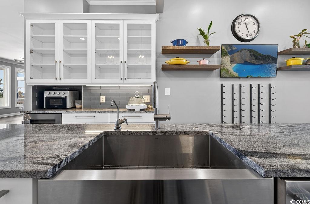 Beautifully updated, this gorgeous raised beach home in the coveted Sweet Grass community showcases sweeping views of the marsh, tidal creek, and Atlantic Ocean, all just moments from boutique shopping, renowned dining, and the unspoiled natural beauty of South Carolinas Lowcountry coast. Expansive decking on multiple levels, along with a welcoming screened porch, create abundant outdoor living space ideal for relaxing or entertaining, while enjoying gentle sea breezes and panoramic vistas. Inside, the gourmet kitchen is a true chef's dream, featuring Thermador stainless steel double wall ovens, gas cooktop with hood, dishwasher, a custom-paneled French-door refrigerator, wine refrigerator, bay window with built-in bench seating, and an elegant glass-front butlers pantry area that offers beautiful and convenient storage. The open-concept main level, accented by oversized windows that capture the remarkable views, accommodates a generous dining area, flexible seating / living areas including a cozy fireplace. A guest bedroom and full bath on this floor provide convenient accommodations. Upstairs, the luxurious primary suite serves as a private retreat with large windows and access to the upper deck, perfect for savoring breathtaking sunrises. Complete with a spacious sitting area and dual walk-in closets flanking the entrance to a spa-inspired bath boasting a freestanding soaking tub, sleek modern vanities, and a custom-tiled walk-in shower. Two additional bedrooms share this level, including one with it's own access to the upper deck, as well as another beautifully updated full bath. On the ground level, an expansive garage offers parking for at least four vehicles and includes an insulated storage and workshop room. This area opens to both covered and open-air patios, along with a convenient outdoor showerideal after a day on the water or at the beach. This home seamlessly blends refined coastal design, modern comforts, and unparalleled views, embodying the very best of Pawleys Island living.