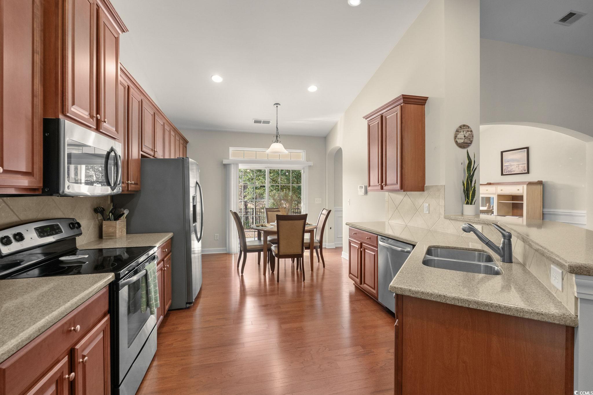 Fantastic Price - Welcome to 1461 Thames Ct., located in the highly sought-after community of Emmens Preserve within Market Common. This charming Crepe Myrtle floor plan offers 4 bedrooms, 3 baths, and a 2-car garage, all powered by natural gasincluding a gas fireplace, tankless Rinnai water heater, and gas range for cooking. Enjoy outdoor living with both covered front and rear porches, plus a fully fenced backyard. The thoughtfully designed split floor plan features three bedrooms on the main level. The spacious primary suite with ensuite bath includes a linen closet, large walk-in closet, double sink vanity, garden tub, and a glass-enclosed shower. Two generous guest bedrooms are located at the front of the home and share a full bath. Upstairs, youll find a flexible and expansive fourth bedroom or bonus room with its own walk-in closet and full bathperfect for guests, a home office, or media space. The kitchen has a pantry, dual-basin sink, lots of cabinets and offers ample room for an eat-in area and a built-in desk, ideal for cookbooks or a home office nook. A formal dining room showcases chair rail and timeless wainscoting enhancing this home's entertaining flow and provides additional space for gatherings. The laundry room is just off the garage and has shelving to create a ""drop zone"" and offers a walk-in pantry for additional storage. Sliding doors lead to the extra-long covered rear porch, complete with a designer ceiling fan and Edison string lightsan inviting space for grilling, entertaining, or relaxing. Situated at the end of the street, this home enjoys added privacy and street parking. Emmens Preserve is known for its resort-style amenities, including a clubhouse, pool, miles of walking and biking paths (including the scenic Woodland Path), playground, picnic area, outdoor pavilion with kitchen, putting green, bocce ball court, dog park, and golf-cart-friendly access to the beach and downtown Market Common. Schedule your showing today and experience the lifestyle this beautiful home has to offer