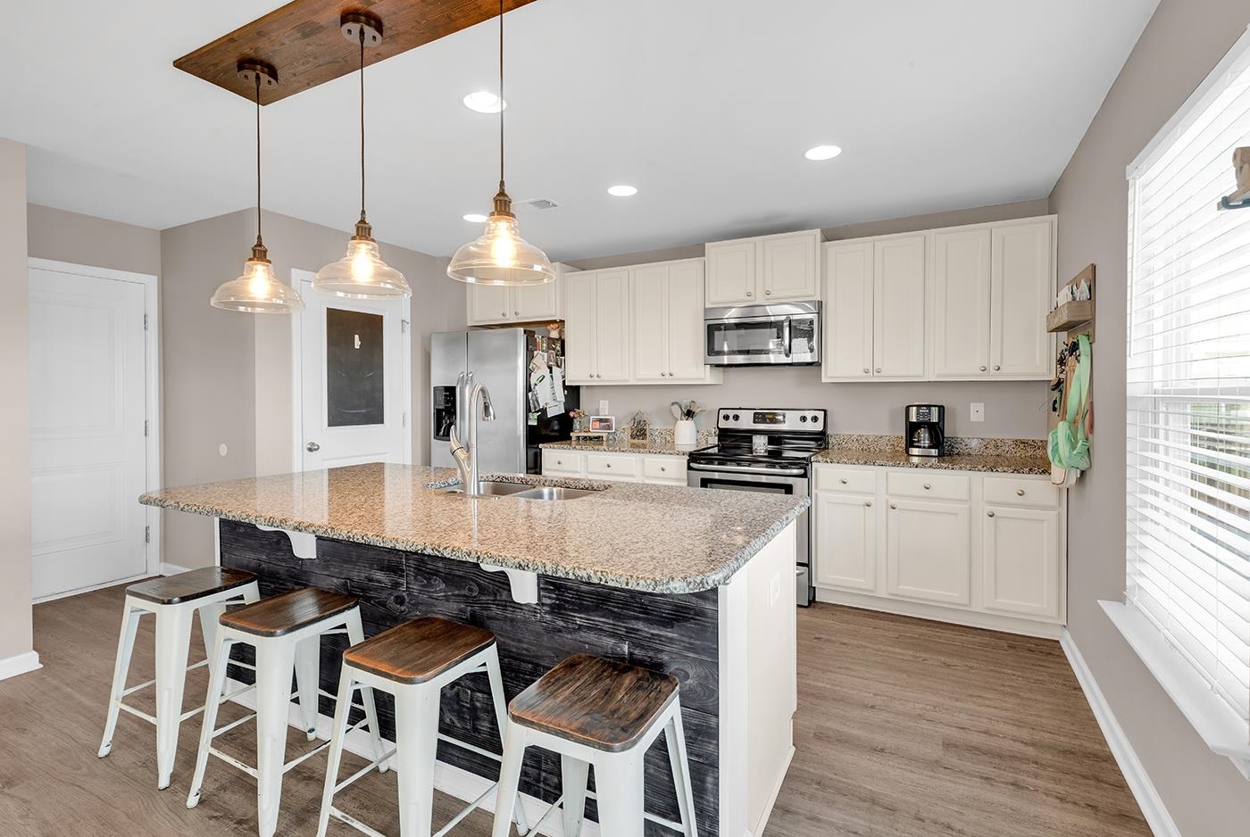 Enjoy pond-front living, thoughtful upgrades, and inviting outdoor spaces at 317 Truce St in Harmony at St. James. This beautifully maintained 4-bedroom, 2.5-bath home is situated on one of the largest pond-front lots in the community and offers features that truly set it apart. The open-concept main living area welcomes you with a custom shiplap accent wall and electric fireplace, creating a warm and stylish space for everyday living or entertaining. The kitchen is equipped with stainless steel appliances, upgraded fixtures, and opens directly to a covered back porch and extended concrete patioperfect for grilling, relaxing, and taking in the water views. Upstairs, all four bedrooms are generously sized, including a spacious primary suite with double vanities and a walk-in closet. The fully fenced backyard provides privacy while still showcasing peaceful pond views. Built in 2017, this home also offers LVP flooring, a 2-car garage, and excellent curb appeal. Conveniently located within walking distance to St. James High School and just minutes from shopping, dining, and the beach, this home delivers both comfort and convenience. A rare opportunity to own one of the most upgraded homes in the community.