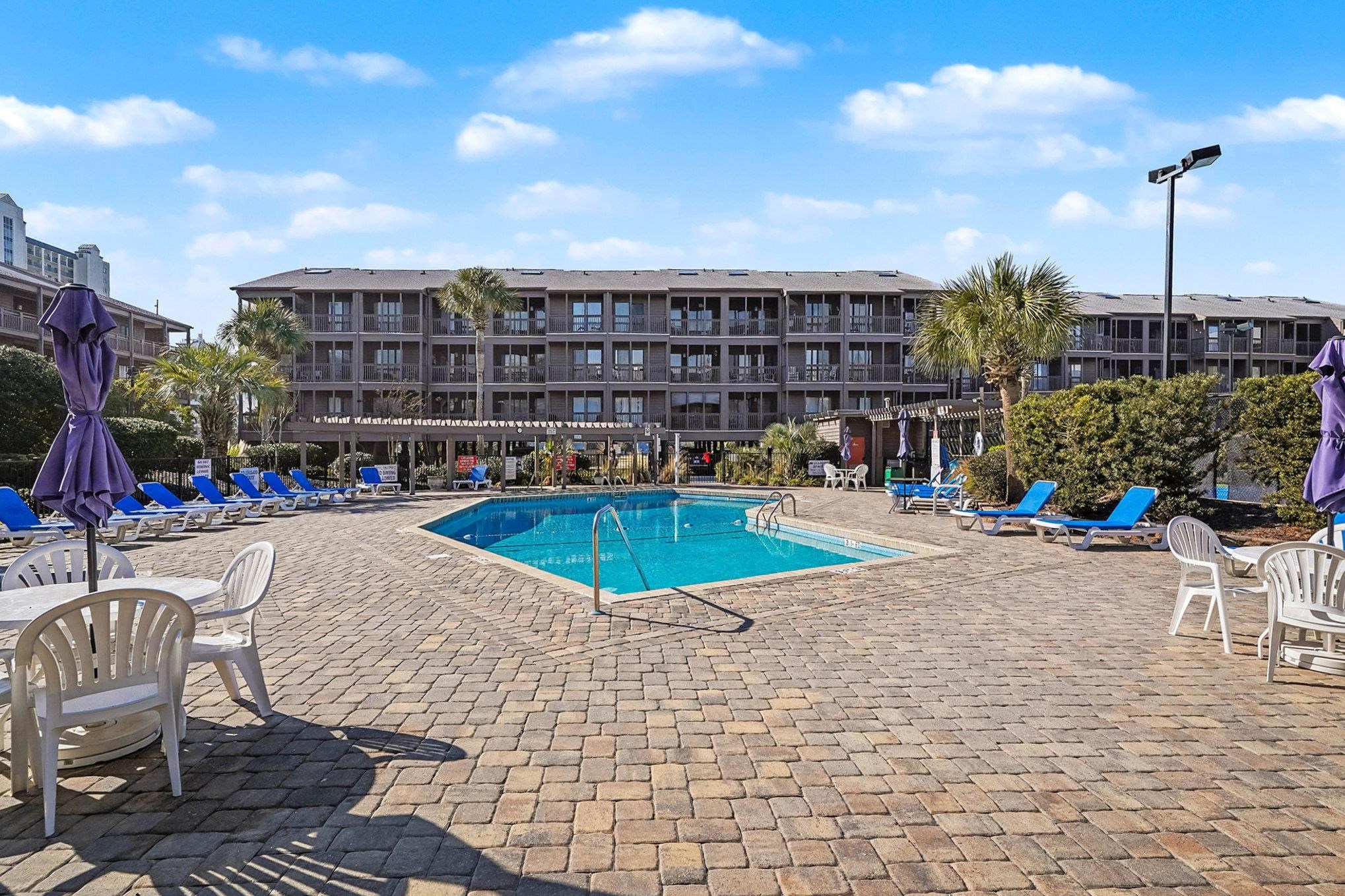 This bright and spacious 3 bedroom, 2.5 bath first-floor condo is perfectly situated in the heart of North Myrtle Beach's sought-after Ocean Drive section, overlooking the pool area from inside and the private balconies, with convenient elevator access in this low-rise building. Highlights include a fully furnished interior, abundant natural light, a private balcony off both the living room and the primary suite, and an open, functional layout perfect for coastal living. Additional features include a kitchen with stainless steel appliances and ample counter and cabinet space, tile flooring in the kitchen, hall, and baths with LVP in the living area, a full-size laundry room with washer and dryer conveying, and two spacious guest bedrooms. This delightful furnished condo makes a terrific investment property, vacation retreat, or full-time residence, offering access to multiple pools, lounge areas, and easy beach access just across the street.