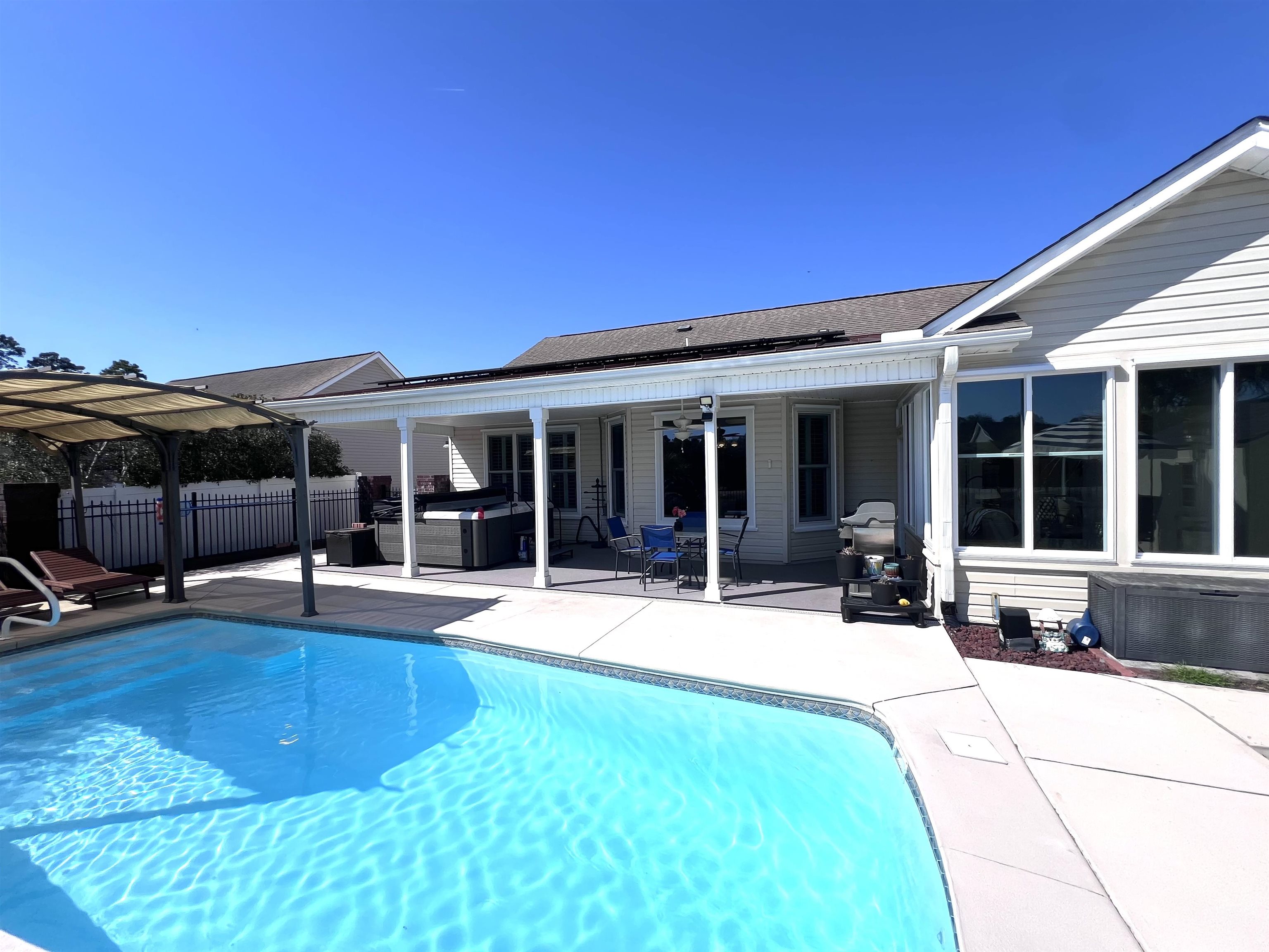 OPEN HOUSE SUNDAY APRIL 12TH 1:00-3:00 Resort-Style Living with Heated Private Pool, Solar Power & Pond Views | Hunters Ridge Crossing Welcome to this exceptional 3BD/2BA residence in sought-after Hunters Ridge Crossing, where energy efficiency meets resort inspired outdoor living. Designed for both comfort and cost savings, this home features 23 solar panels that power the home, exporting excess electricity back to the grid for future utility credits. High end Double Hung Andersen windows further enhance efficiency and comfort throughout. A 325 gallon gas tank heats the pool and fuels the gas fireplace, with additional gas lines installed behind the stove and dryer for those who prefer gas appliances. Outdoors, the backyard transforms into a true private oasis. The fenced yard showcases an in ground heated pool (chlorine or saltwater) overlooking a serene pond with fountain, complemented by expanded pool decking, a shaded pergola, side-yard access, and an impressive 329 square foot covered porch with a striking copper roof and 6-person hot tub. Inside, the living room features vaulted ceilings, rich wood flooring, and a gas fireplace, creating a warm and inviting gathering space. The chefs kitchen offers 42 inch oak cabinetry, granite countertops, stainless steel appliances, an externally vented stainless steel range hood, pantry, and breakfast bar, flowing seamlessly into a sun filled dining nook with a big picture window and plantation shutters. The first-floor primary suite serves as a private retreat with tray ceilings and a custom walk in closet. The spa inspired ensuite bath includes a jetted soaking tub, tiled shower with upgraded glass door, dual granite vanities, and upgraded fixtures. Guest bedrooms feature upgraded flooring, and the guest bath offers granite countertops and a tiled shower with glass enclosure. A fully enclosed sunroom with Pella windows, tile flooring, shades, and its own mini-split system extends living space year-round. Additional upgrades include HVAC (2020) with UV light and surge protection, hurricane shutters, blown-in cellulose insulation, irrigation system, palm landscaping, 8x8 storage shed, and a 2-car garage with pull-down attic storage. Meticulously maintained and just minutes from Myrtle Beach shopping, dining, golf, and beaches. This home delivers elevated coastal living with built-in efficiency and long-term savings.