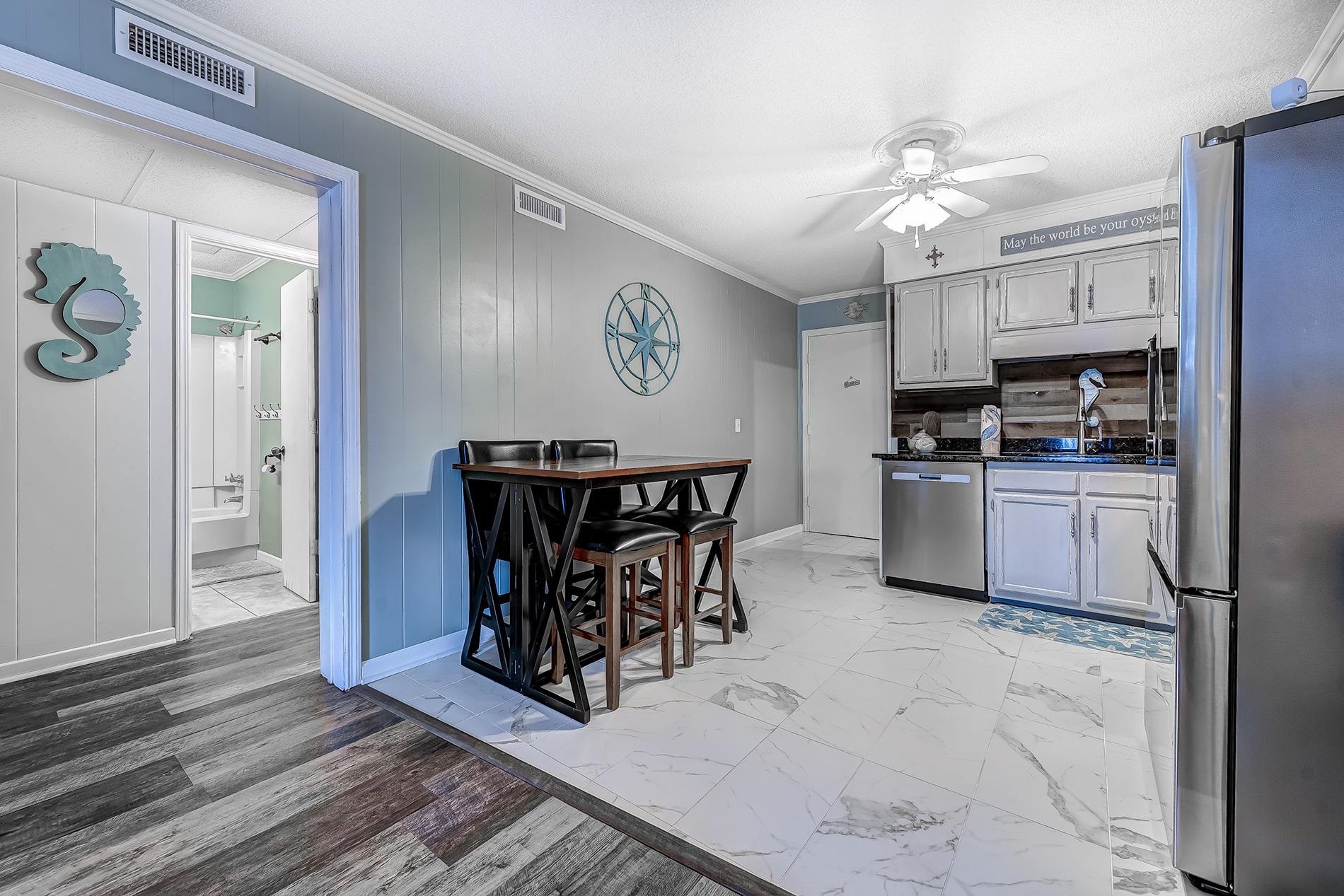 Location, Location, Location!! Only one block to the beach!! This unit has been updated and offers 2 bedrooms 2 baths. Condo is located in A Place at the Beach V in the popular Arcadian Shores area of Myrtle Beach. This unit has had the kitchen bar removed , with new tile installed, to give it a true open floor plan. The kitchen also has recently been updated with granite countertops and new stainless steel appliances in August 2025. The open concept is great for entertaining or relaxing after a long day on the beach. The unit comes fully furnished except for personal items and the master bedroom furniture. Ocean front pool also available for use. If you're in the market for a primary residence or an investment property, this is the unit. Located near Restaurant Row, Tanger Outlets, Bass Pro Shop, Bare Foot Landing and numerous golf courses. Flip Flops, Harry and the Hat, Finn McCool's, Dont get it Twisted and the world famous Ocean Annie's all within walking distance.