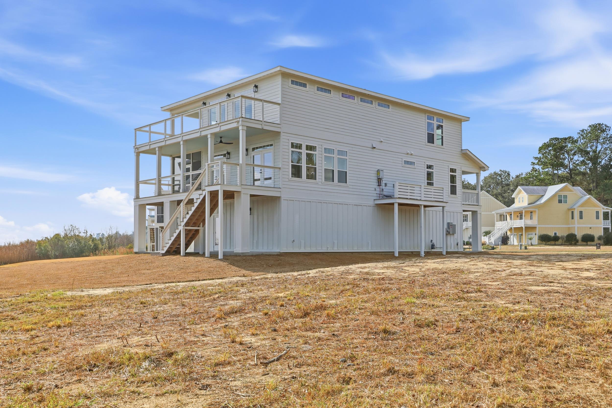Exceptional new construction on Winyah Bay offering sweeping water views and refined Lowcountry living, just 60 miles from Charleston. Elevated on a pier-and-beam foundation, 10-foot ceilings on the main level and over 1,100 square feet of wrap-around porches showcasing breathtaking bay views. The open-concept interior features pre-finished hardwood flooring, crown molding, and abundant natural light. The chefs kitchen includes Carrara quartz countertops, full-wood shaker cabinetry with soft-close drawers, and a premium GE Caf stainless steel appliance package with a 36 gas range. The primary suite is a true retreat with French doors and expansive windows capturing incredible water views. An upstairs wet bar near the primary adds convenience, while the spa-like bath features upgraded tile and a soaking tub with floor-mounted faucet. The ground level offers generous storage and flexible space ideal for a workout or game area, heated and cooled. Home is elevator and generator ready. Located minutes from charming Georgetown with waterfront dining, shopping, and historic coastal charm nearby. All square footage is approximate and information should be verified by buyer or buyers agent.