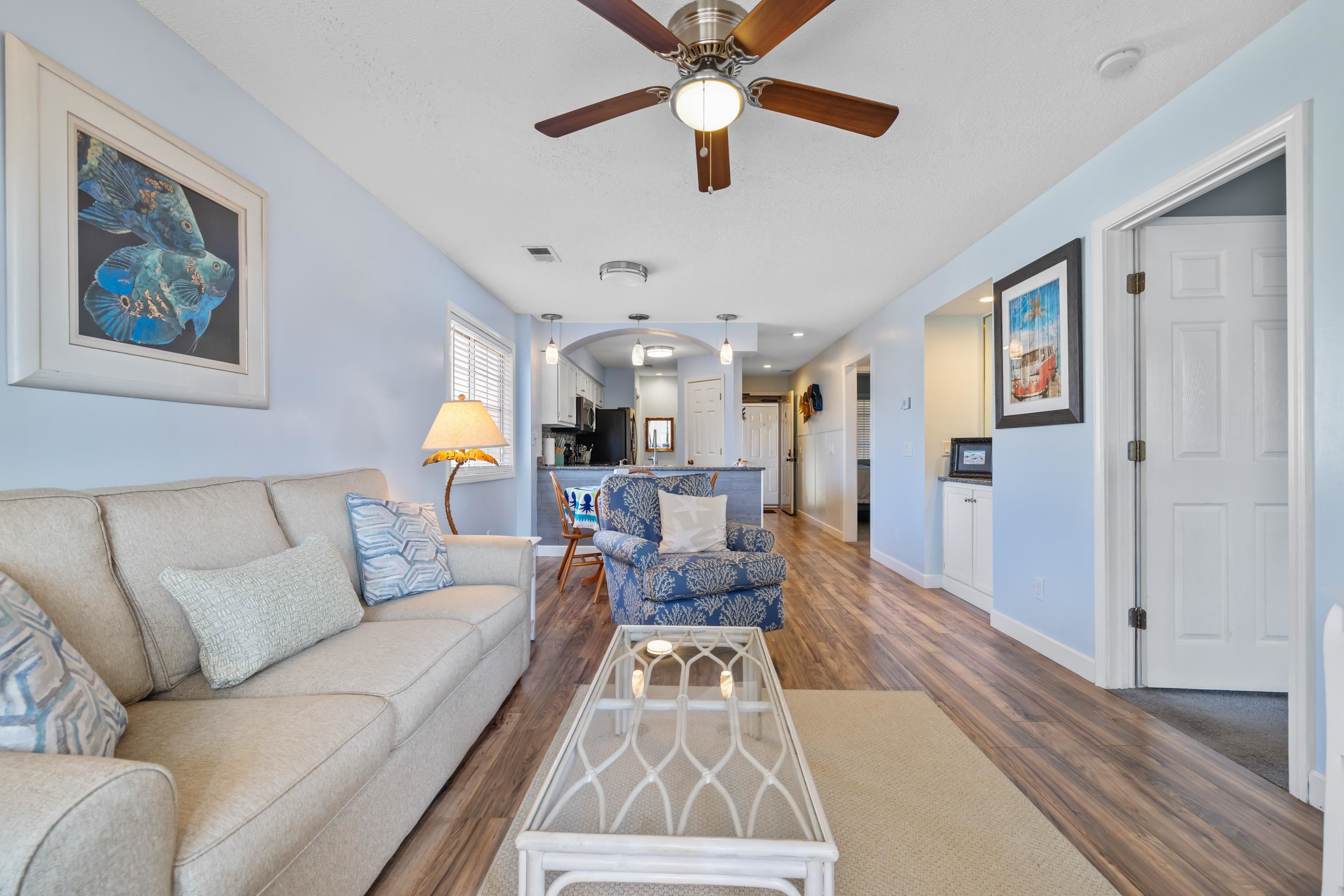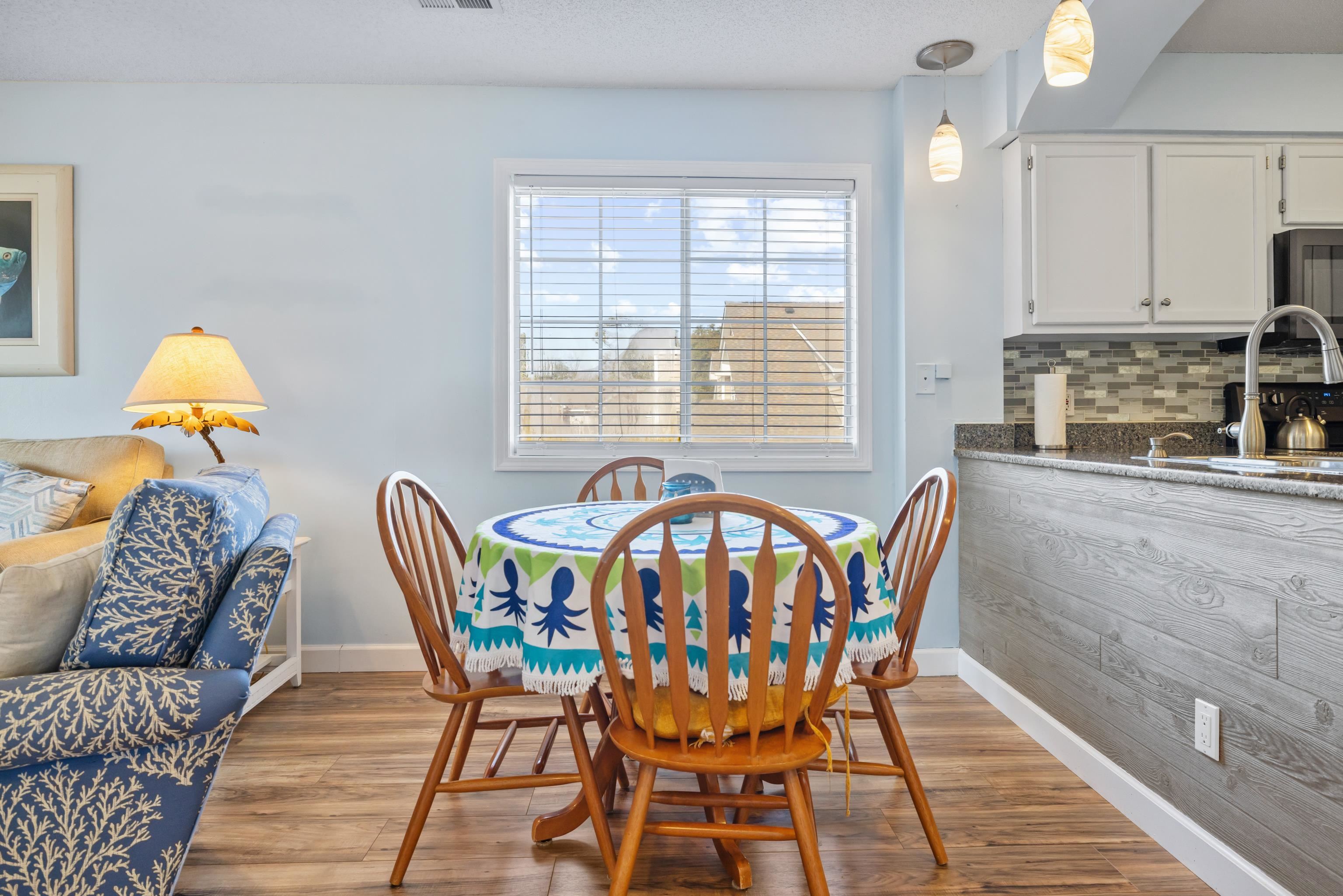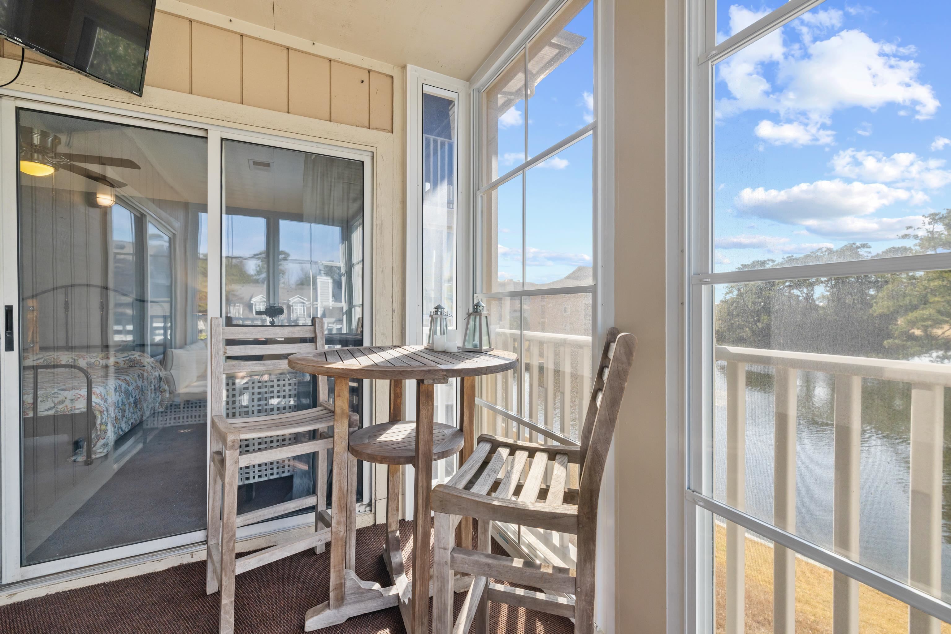 Welcome to this well-maintained and fully furnished 2-bedroom, 2-bath condo in the desirable Tilghman Shores community, just steps from the beaches of Cherry Grove. This second-floor end unit offers abundant natural light and a comfortable open living plan throughout. The kitchen features granite countertops, tile backsplash, pantry, and breakfast bar, providing both style and functionality. Enjoy the four-season room overlooking peaceful water views ideal for morning coffee or evening relaxation year-round. The primary suite offers private access to the four-seasons room and an en-suite bath, while the second bedroom and adjacent full bath complete the layout. Offered fully furnished, this property is well-suited as a primary residence, vacation retreat, or investment opportunity, with short- and long-term rentals permitted. Community amenities include an outdoor pool, hot tub, grilling area, and scenic pond views. Conveniently located near dining, shopping, golf, and beach access, this condo provides easy living in North Myrtle Beach. Ask your agent about lender incentives!