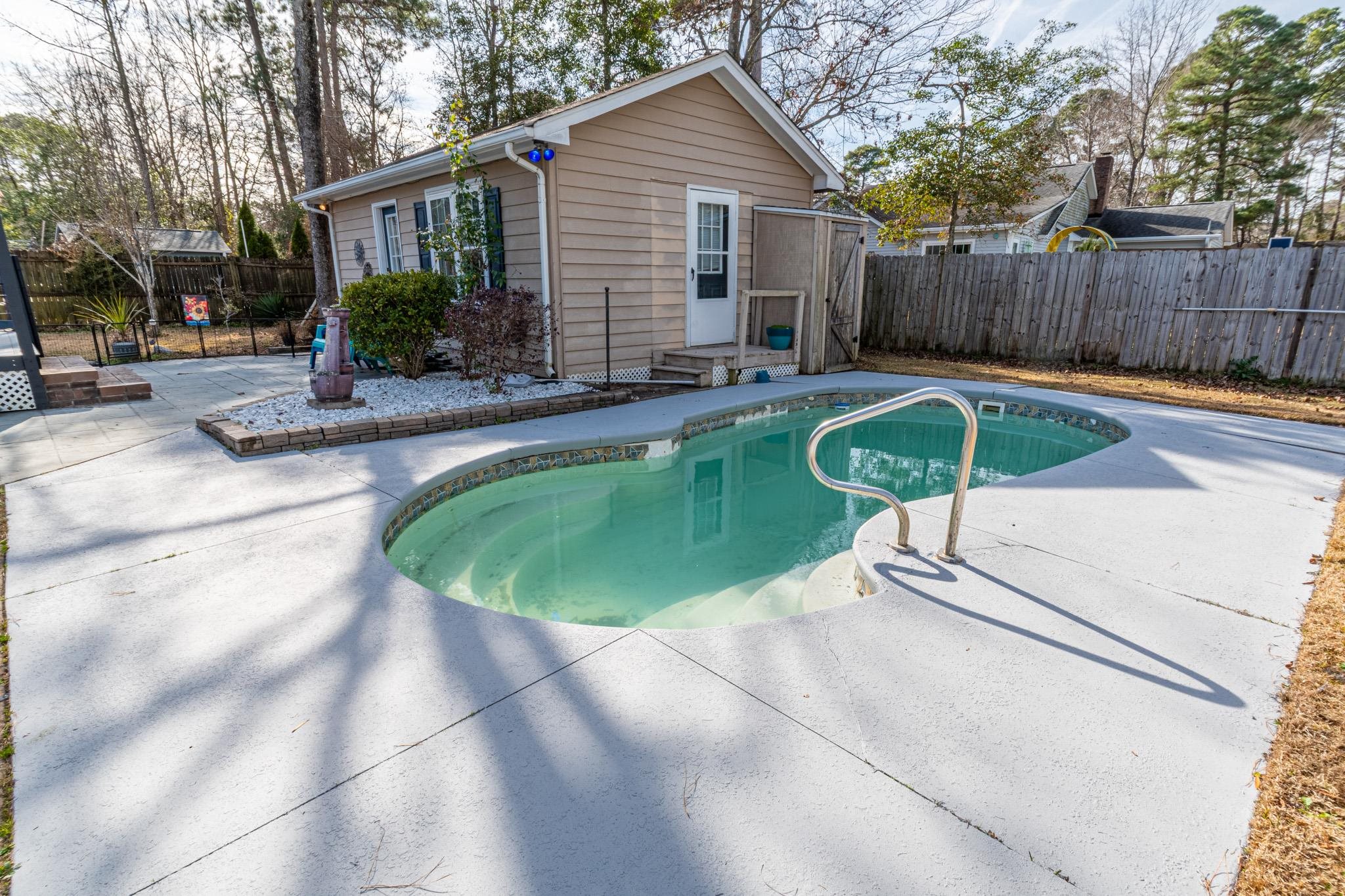 Welcome to this charming three bedroom, two bath home with private pool and pool house located in the Country Manor community of Myrtle Beachfeaturing NO HOA restrictions! Large covered front porch that adds great curb appeal and outdoor living space. The inviting living room showcases a charming brick, wood-burning fireplace and ceiling fan, creating a warm and comfortable gathering space. The kitchen is well-appointed with stainless steel appliances, white cabinetry, a pantry, breakfast bar, and a dedicated dining area. A conveniently located laundry room sits off the kitchen for added functionality. The primary bedroom includes a ceiling fan, walk-in closet, and a private bath with vanity and shower. Two additional bedrooms feature ceiling fans and share an updated hall bath with vanity and tub/shower combination. Step outside to a fully fenced backyard designed for relaxation and entertaining, complete with a spacious deck featuring new Trex decking, a firepit, pool house with mini-split system, detached storage building, and a private in-ground pool. Country Manor is conveniently located near shopping, dining, entertainment, and just a short drive to the beachmaking this home an excellent primary residence or coastal retreat. Roof 2014, pool 2017, HVAC 2019, Trex deck 2025, lighting & fans 2019, appliances 2019, new sink 2019, new back door 2025. Crawl Space encapsulated Dec 2025. Square footage is approximate and should be verified by buyers.