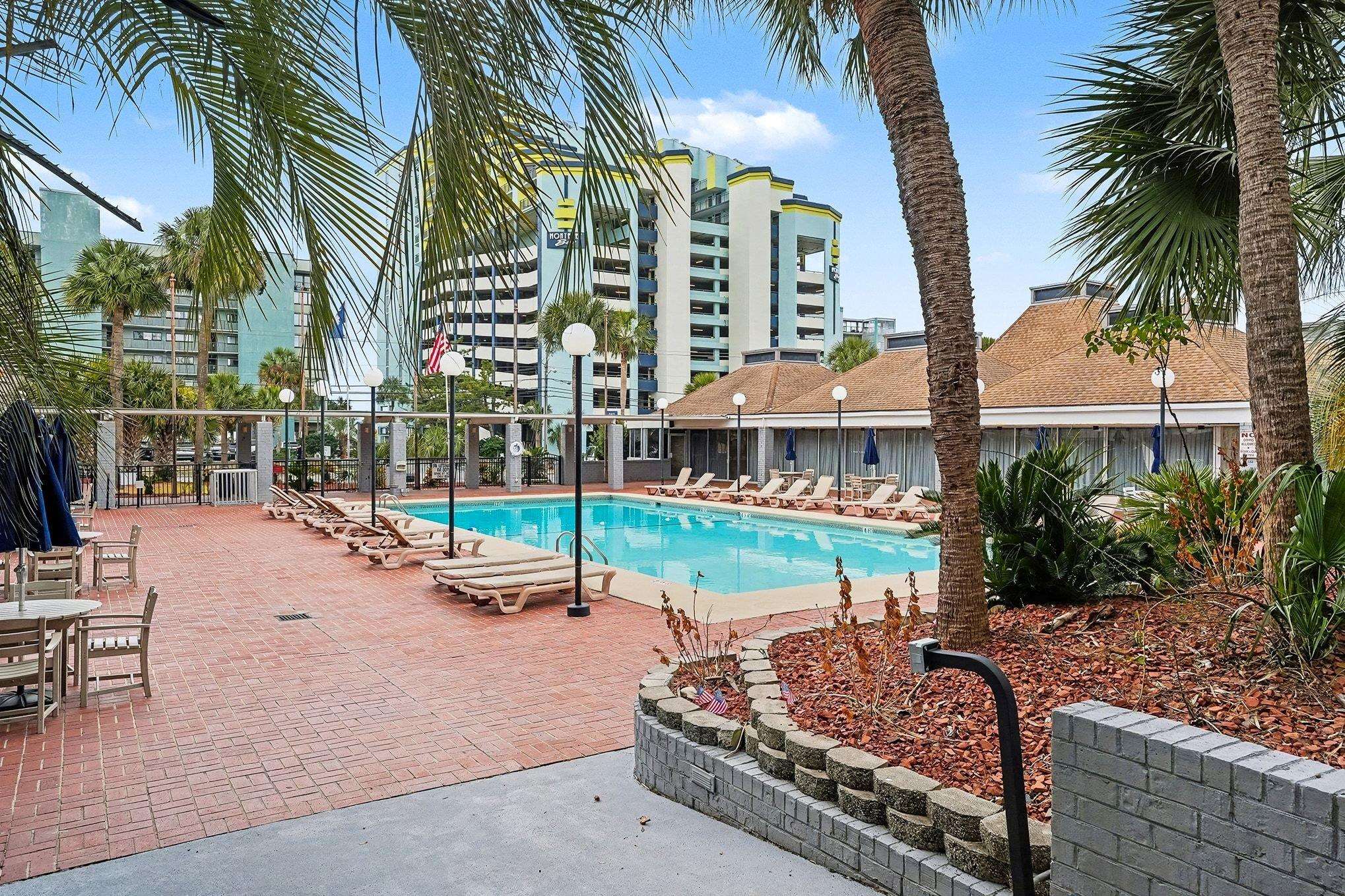 Welcome to your perfect coastal retreat! This efficiency condo at St. Johns Inn is a delightful combination of comfort, style, and convenience, making it an ideal getaway. Upon entering, you'll find a well-appointed kitchenette complete with plenty of countertop and cabinet space, a microwave, and a refrigerator-ideal for quick meals or snacks. The living and dining areas feature upgraded LVP flooring, giving the space a modern and inviting feel, while the kitchen and bathroom showcase elegant tile floors. Rest comfortably in the two queen-sized beds, providing ample space for family and friends. The bathroom is tastefully designed with a stylish shower-tub combo, ensuring a relaxing experience. Step outside to your private balcony and enjoy views overlooking the pool, the perfect spot to savor your morning coffee or unwind in the evening. This condo is being sold fully furnished, offering a turn-key opportunity for new owners to embrace the beach lifestyle immediately. After a long day soaking up the sun, refresh yourself in the outdoor pool or relax in the hot tub. St. Johns Inn is ideally located near some of Myrtle Beach's finest dining, shopping, golf, and entertainment options, making it a fantastic vacation home or a savvy investment property. The seller also owns another unit in the building and is open to selling both units as a package deal. Contact the listing agent for more details! Don't hesitate, schedule your showing today and make this coastal gem your own!